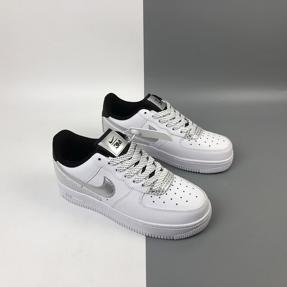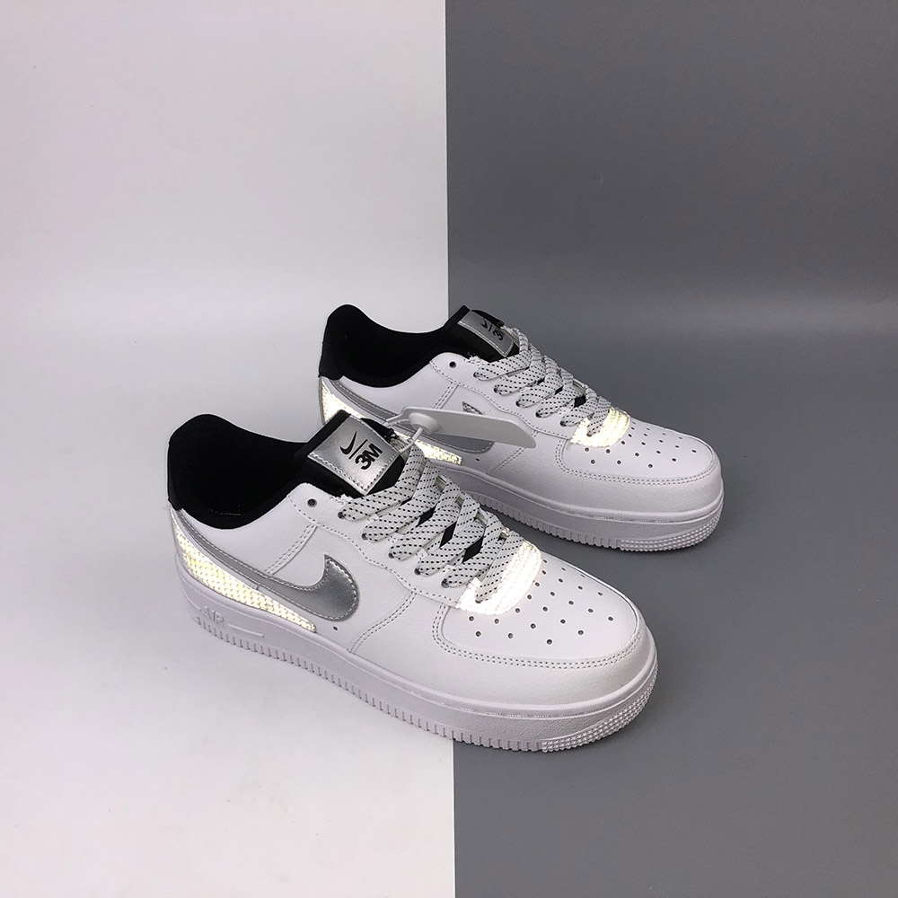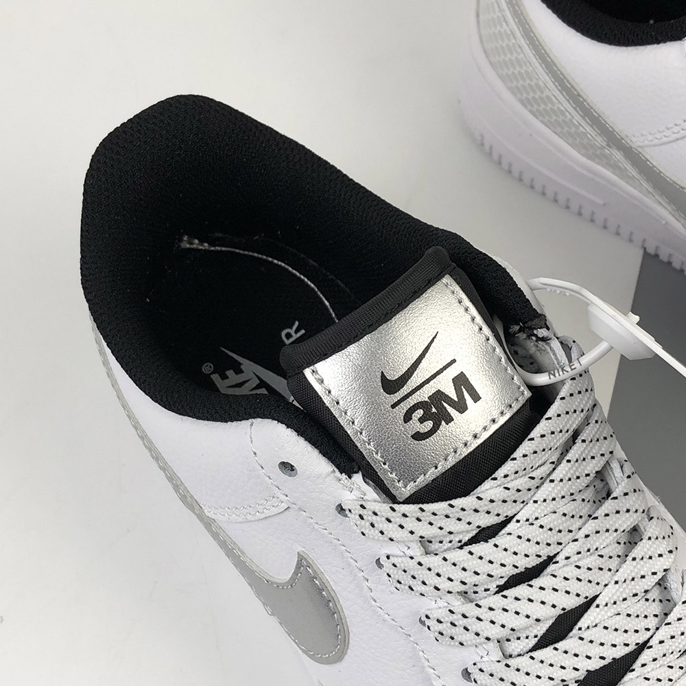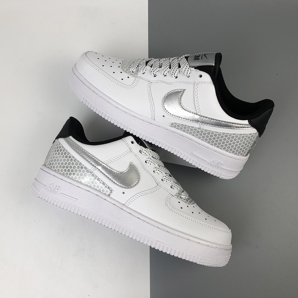 This offering of the Nike Air Force 1 Low features a White smooth and tumbled leather upper with Metallic Silver Swooshes and 3M branded tongues. Black leather heel tabs, specked laces with 3M reflective Silver honeycomb detailing on the toe and heel completes the design.