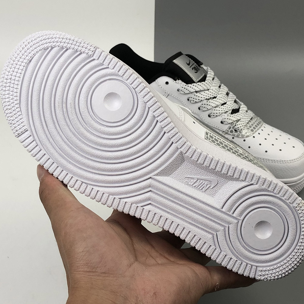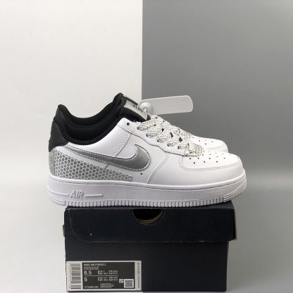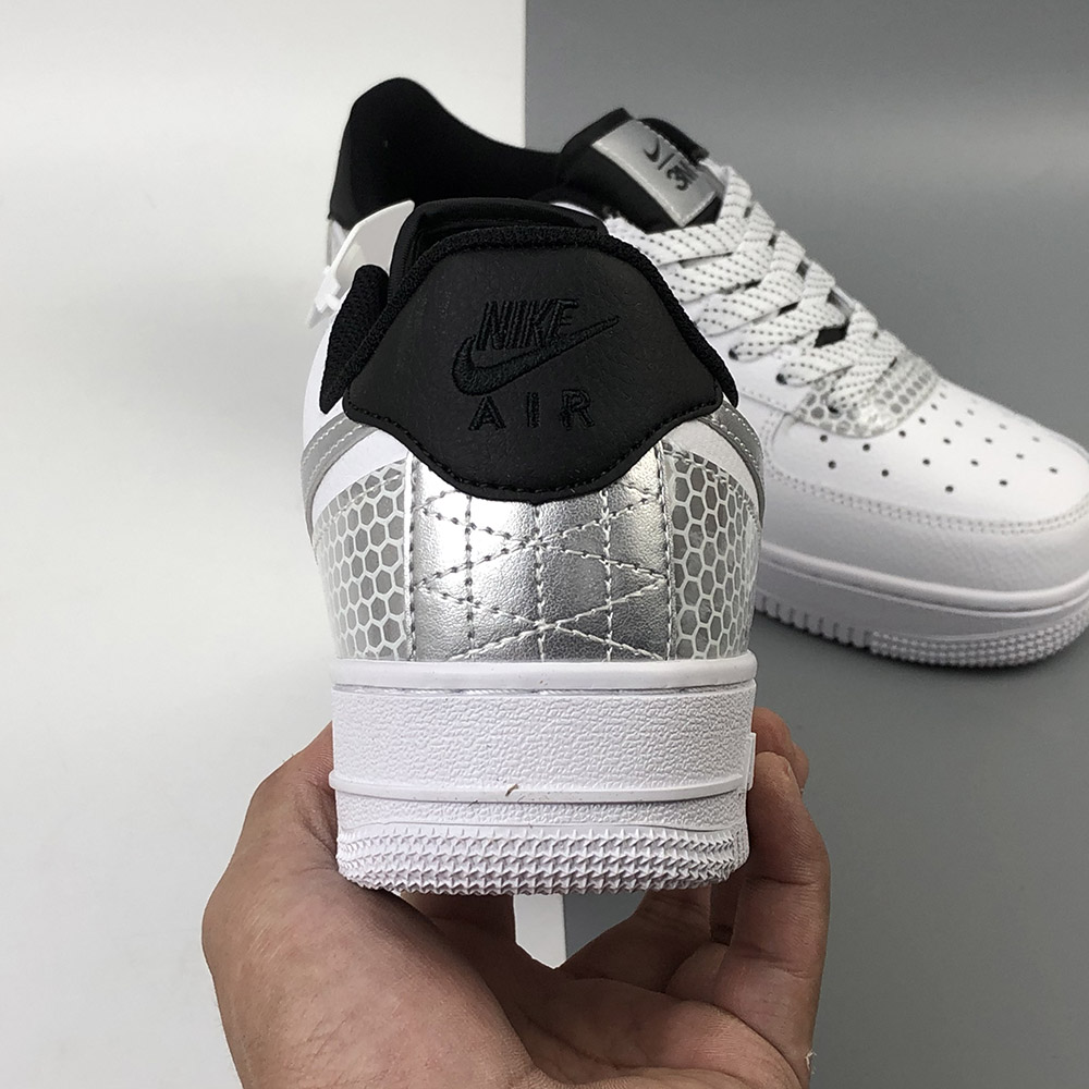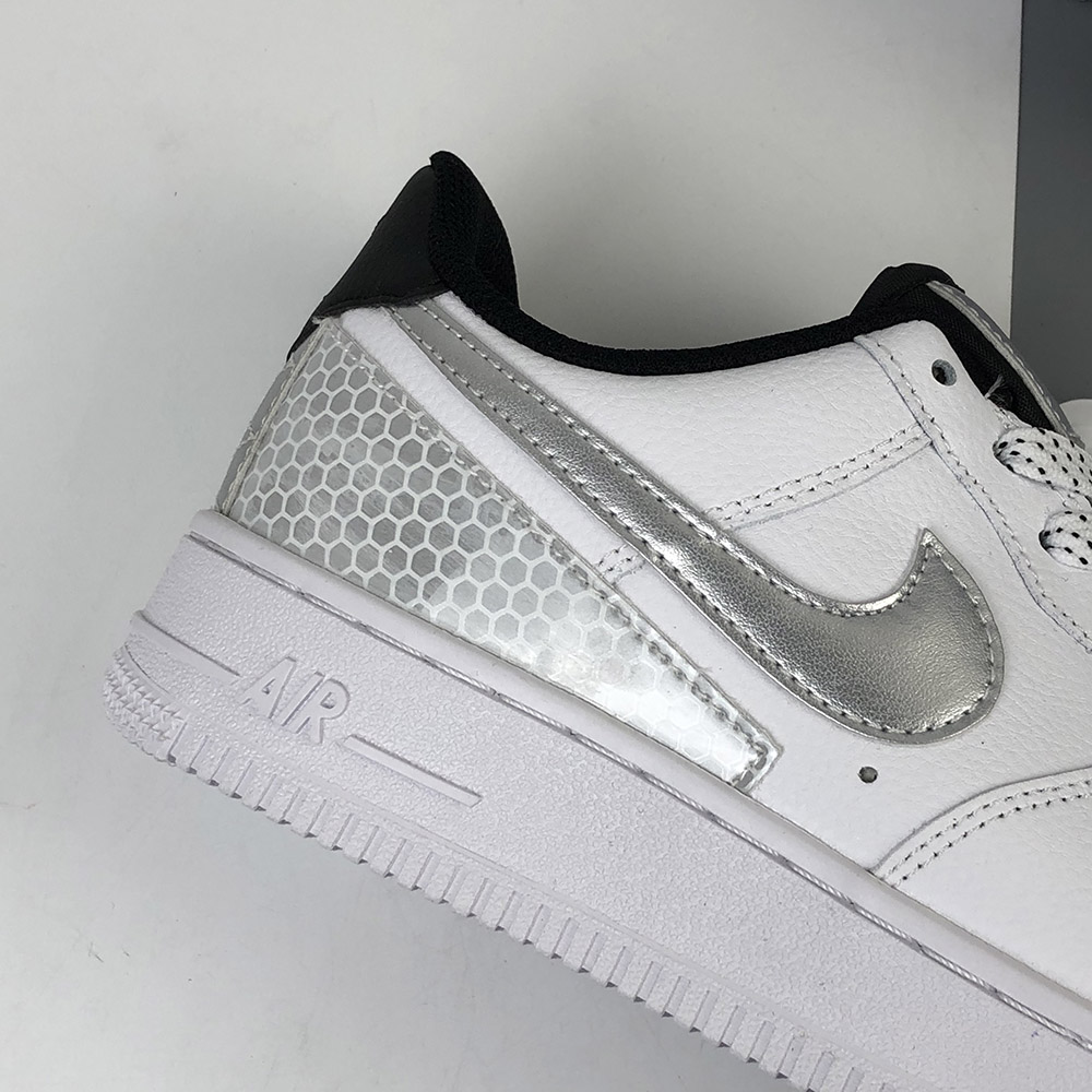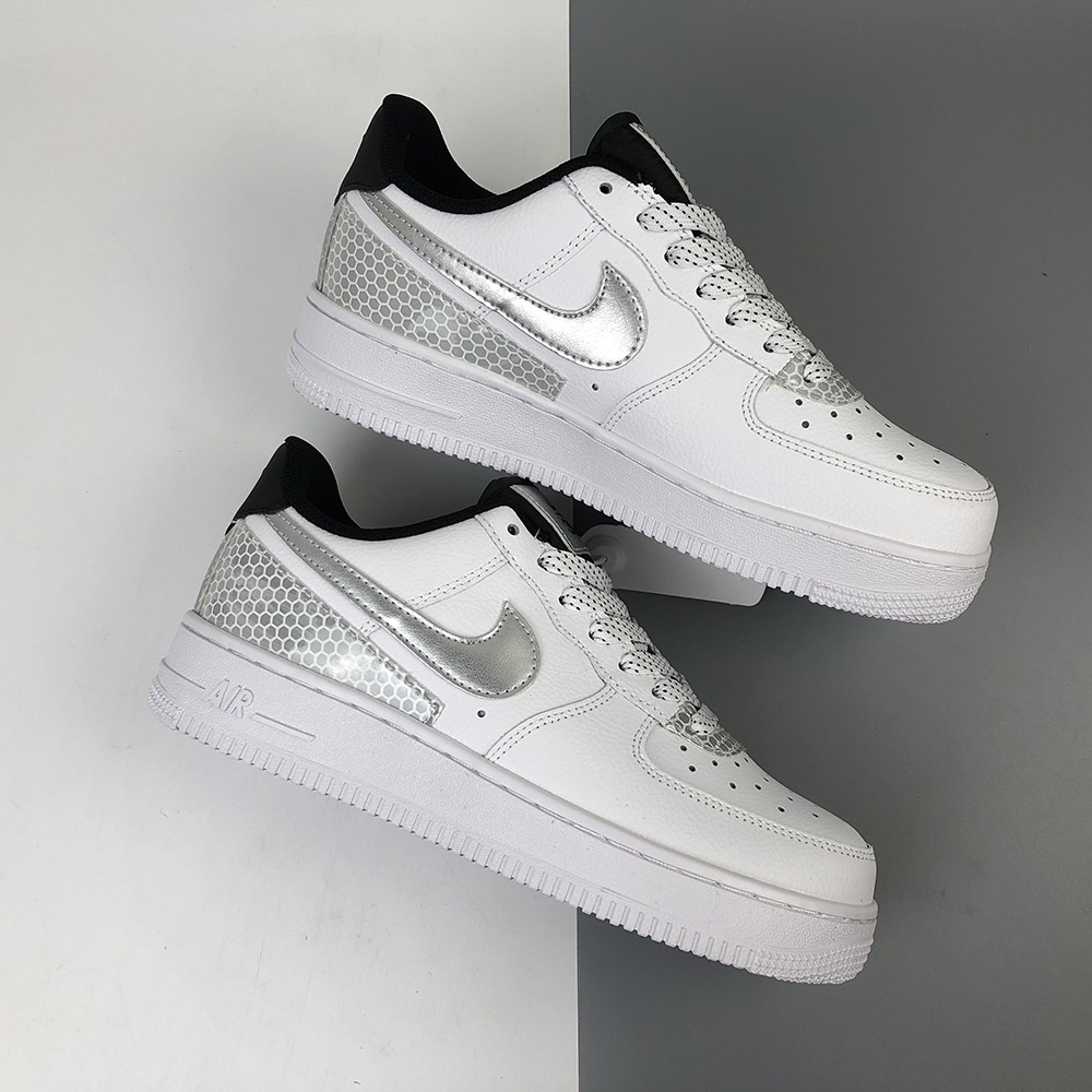 This offering of the Nike Air Force 1 Low features a White smooth and tumbled leather upper with Metallic Silver Swooshes and 3M branded tongues. Black leather heel tabs, specked laces with 3M reflective Silver honeycomb detailing on the toe and heel completes the design.