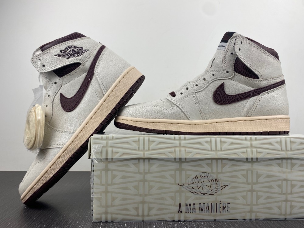 This Air Jordan 1 comes dressed in a Sail and Burgundy color combination. Constructed with a premium build, the pair has a Sail suede across the base, overlays, and tongue, while reptile texture (possibly snakeskin) adorns the ankle collar and Swoosh logo. Furthering the theme, quilted materials land on the liner, co-branding appears on the tongue, and signature from Michael Jordan beneath the ankle overlay that reads, ‘You have to expect things of yourself before you can do them.’ Next, Burgundy covers the laces, Wings logo, and rubber outsole. Other details include a Sail midsole and a special label on the insoles that reads, ‘Airness by A Ma Maniere for Air Jordan.’