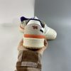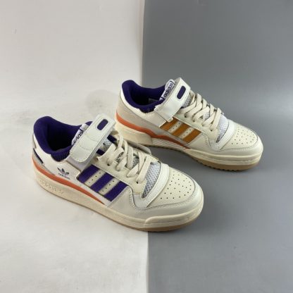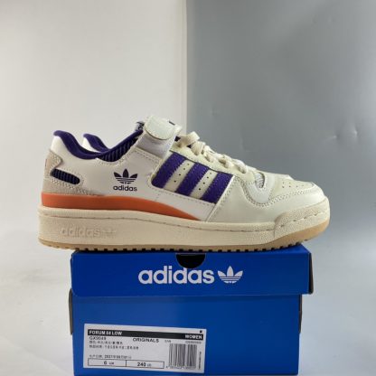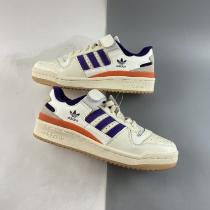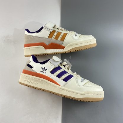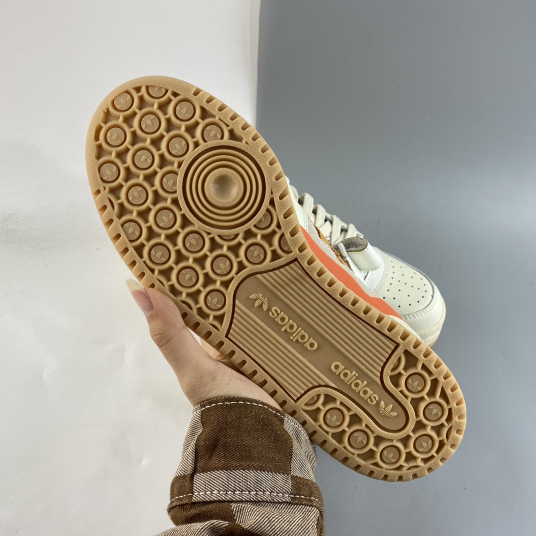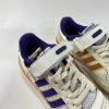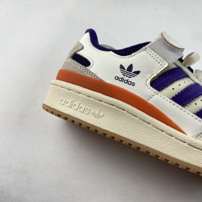With off-white, aged leather the sneaker looks as if it’s spent some time in the sun. The lateral side has highlights of white leather complete with the adidas three-stripes in textured purple suede, that are then inverted to orange on the inner. The tongue has contrasts of white mesh that is finished with an ‘84 tongue tab and velcro strap to secure the laces. The upper lining has hints of purple corduroy that contrast against the orange heel counter with a corresponding orange ‘84 logo embroidered on the back.