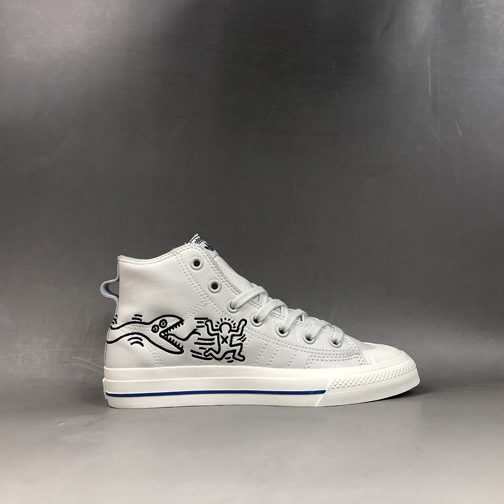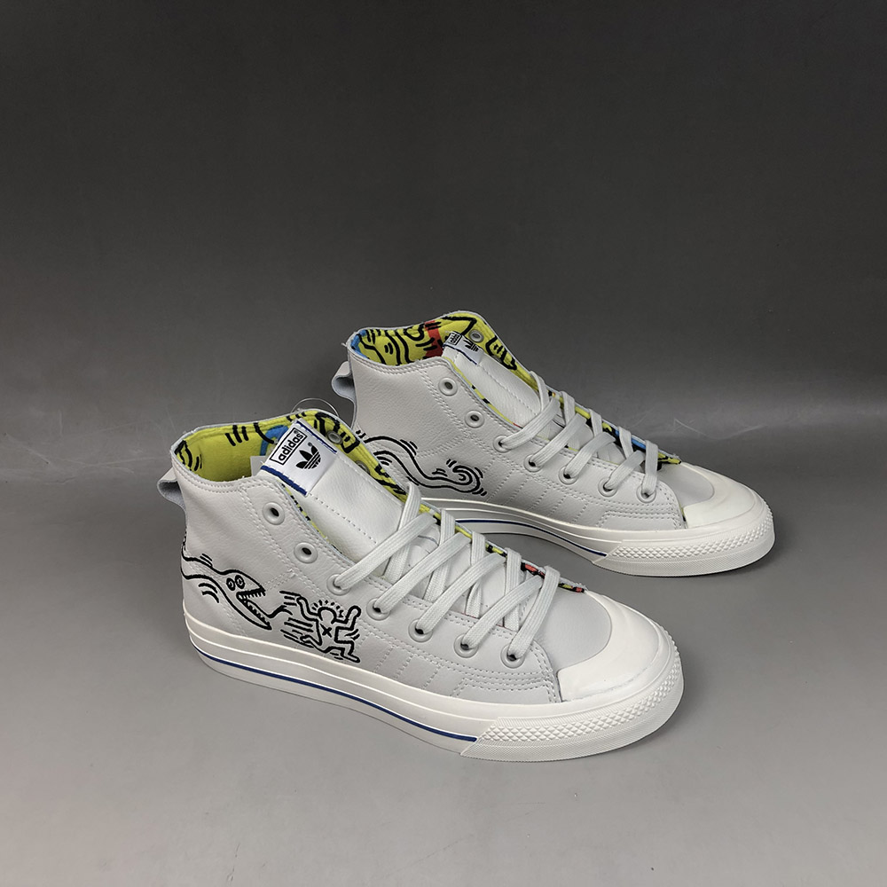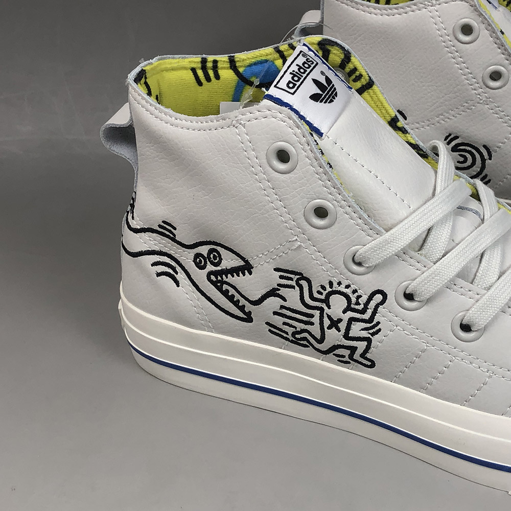 the Keith Haring three-way collaborative capsule is finally coming revealed in full glory, taking on the most prominent themes the artist has become so fondly known for though packaged within the frame of some of adidas’ most notable icons. The Stan Smith is largely traditional to its originals though accented by orange along the typical branding while swapping out the tennis star’s tongue-placed portrait for Haring’s personal caricature. Toe boxes reveal a construction just a bit more involved as its embroidery employs the use of the notable “X” crossed figure, though it effectively acts as the most simplistic of the entire set. Higher, bulkier, and much louder overall, the Rivalry Hi is a piece akin to the most defamed graffiti-covered walls as its maximalist embellishments — in the shape of stars with smiling faces, dancing humanoids, and so much more — cover the white, blue, and orange face of the retro silhouette.