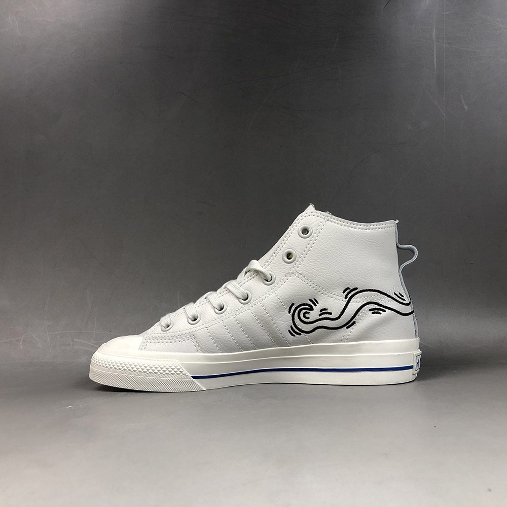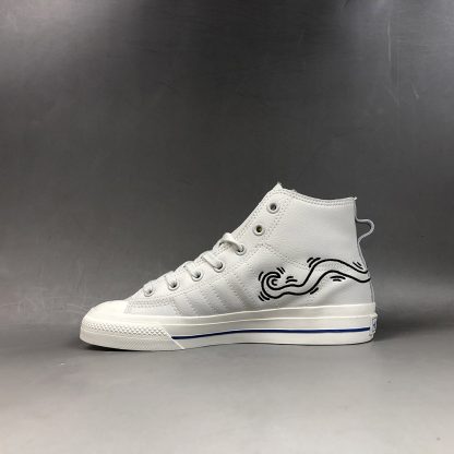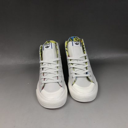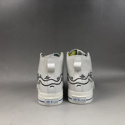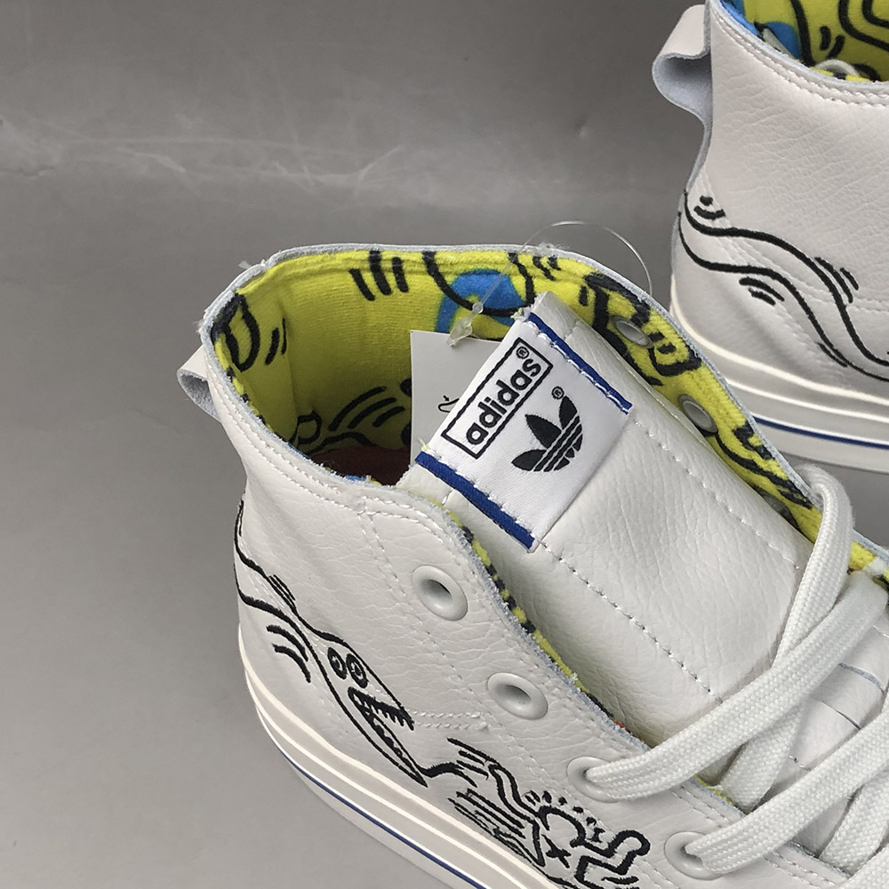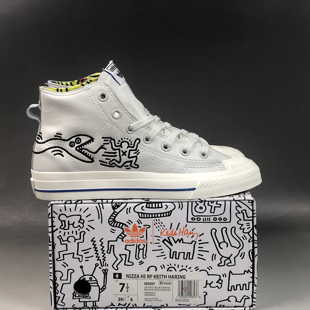 the Keith Haring three-way collaborative capsule is finally coming revealed in full glory, taking on the most prominent themes the artist has become so fondly known for though packaged within the frame of some of adidas’ most notable icons. The Stan Smith is largely traditional to its originals though accented by orange along the typical branding while swapping out the tennis star’s tongue-placed portrait for Haring’s personal caricature. Toe boxes reveal a construction just a bit more involved as its embroidery employs the use of the notable “X” crossed figure, though it effectively acts as the most simplistic of the entire set. Higher, bulkier, and much louder overall, the Rivalry Hi is a piece akin to the most defamed graffiti-covered walls as its maximalist embellishments — in the shape of stars with smiling faces, dancing humanoids, and so much more — cover the white, blue, and orange face of the retro silhouette.