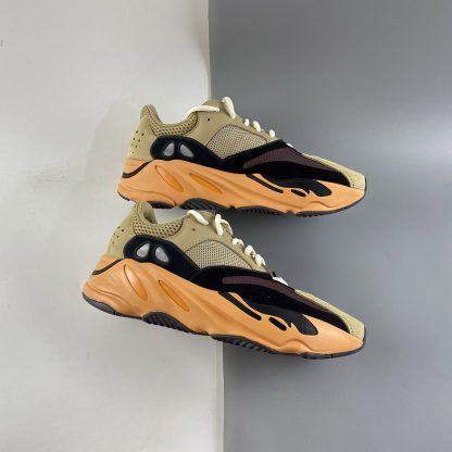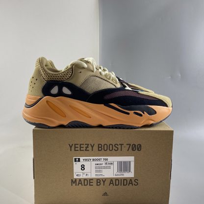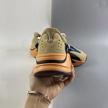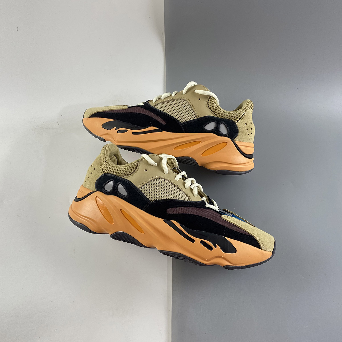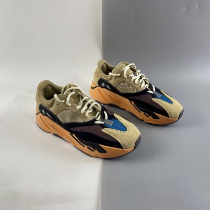 This upcoming adidas Yeezy Boost 700 features a Dark Beige upper with a different shade use don the suede overlays and laces. Darker shades of Brown along with a touch of Turquoise appear on the toe box area while having reflective elements on the Three Stripes underneath the mesh. A vibrant Orange midsole atop a Black rubber outsole completes the design.