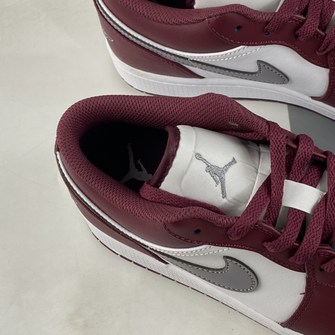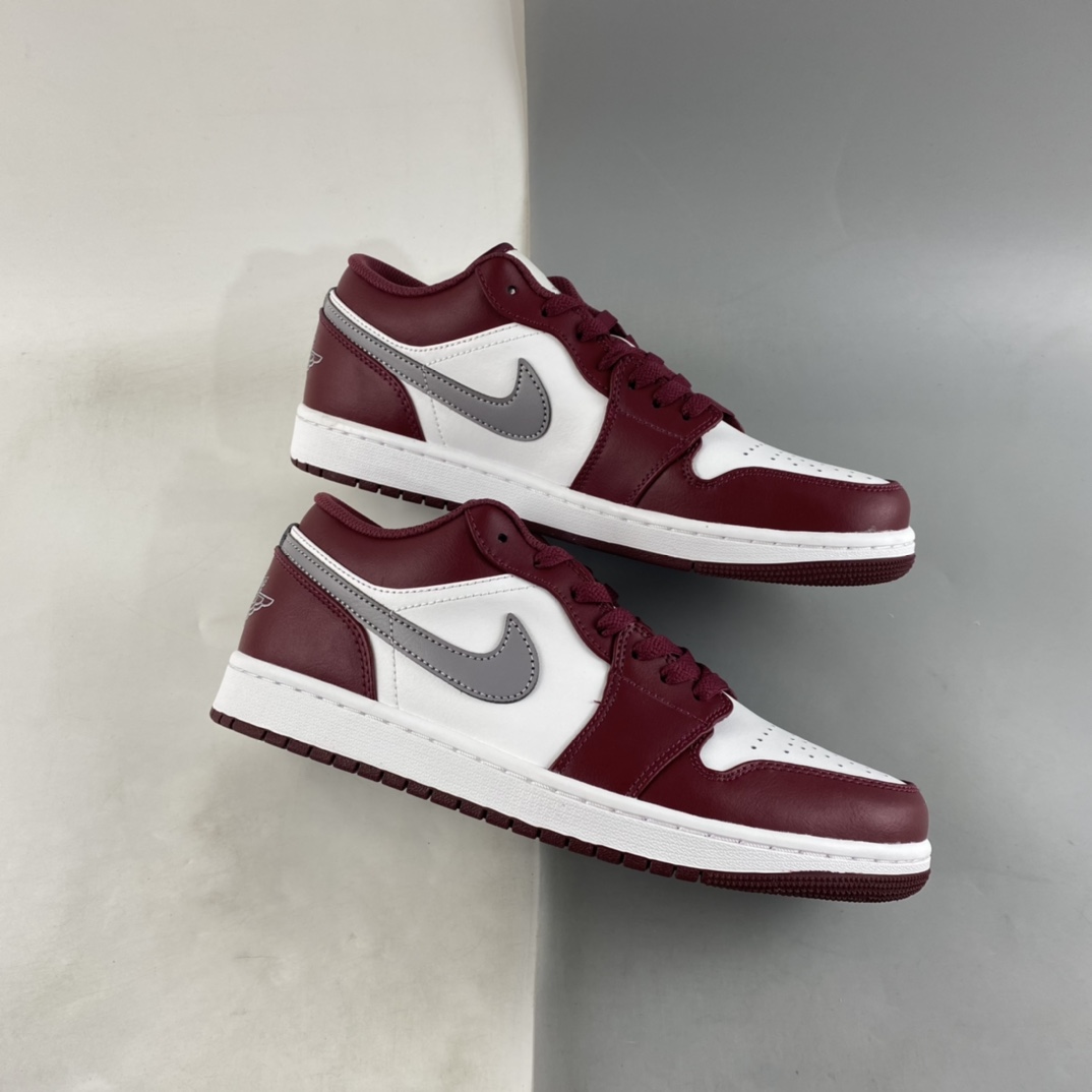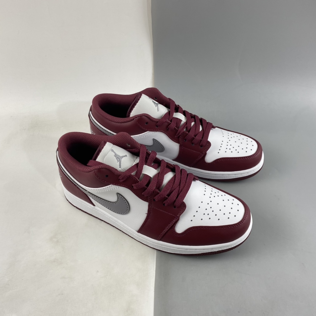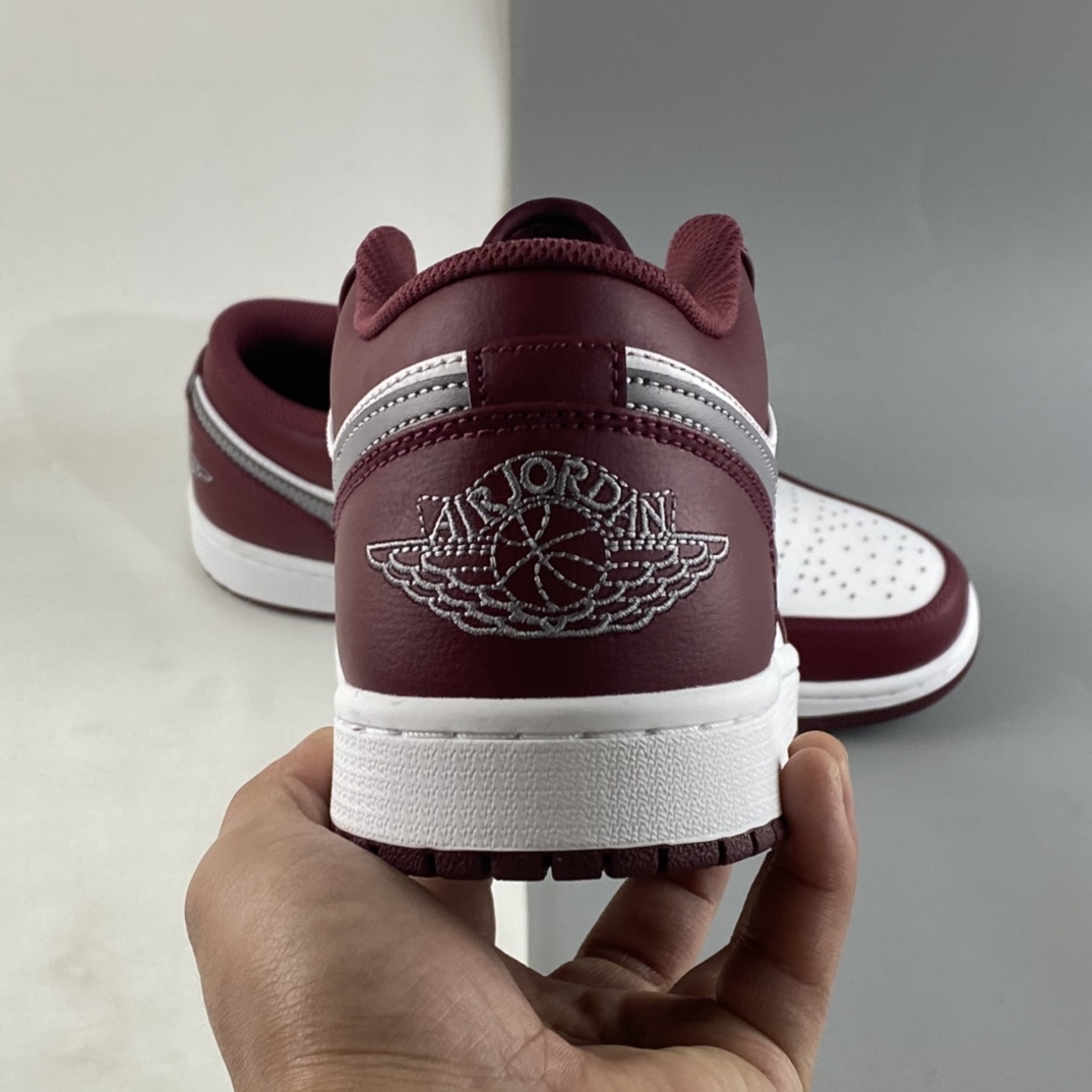 This offering of the low-top Air Jordan 1 features a White leather base with Bordeaux overlay, laces, lining, and rubber outsole. Silver Swooshes, Jumpman and Wings logos atop a White midsole completes the design.