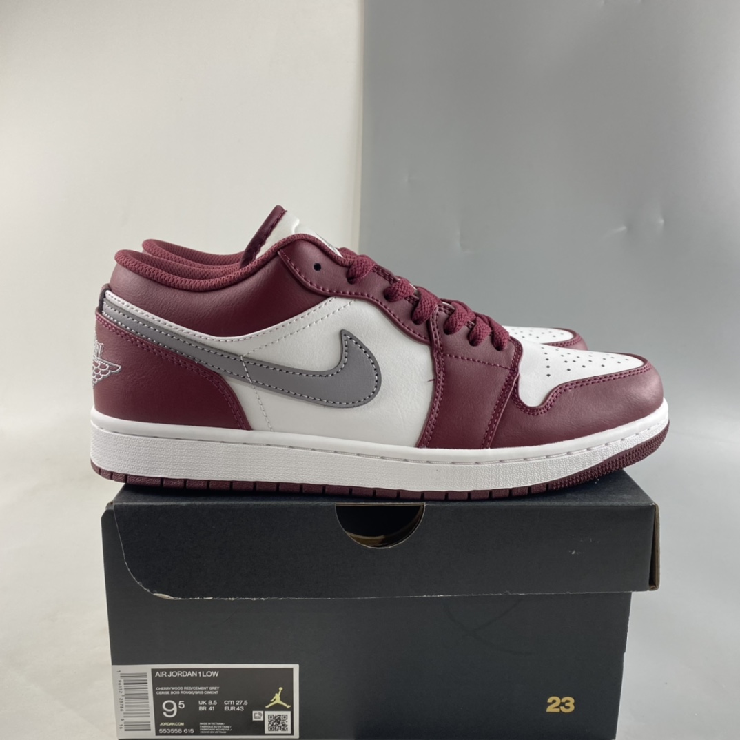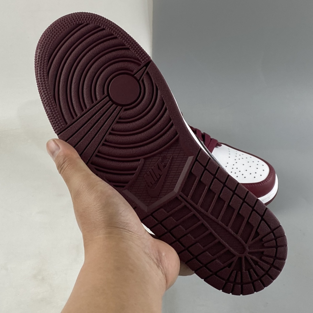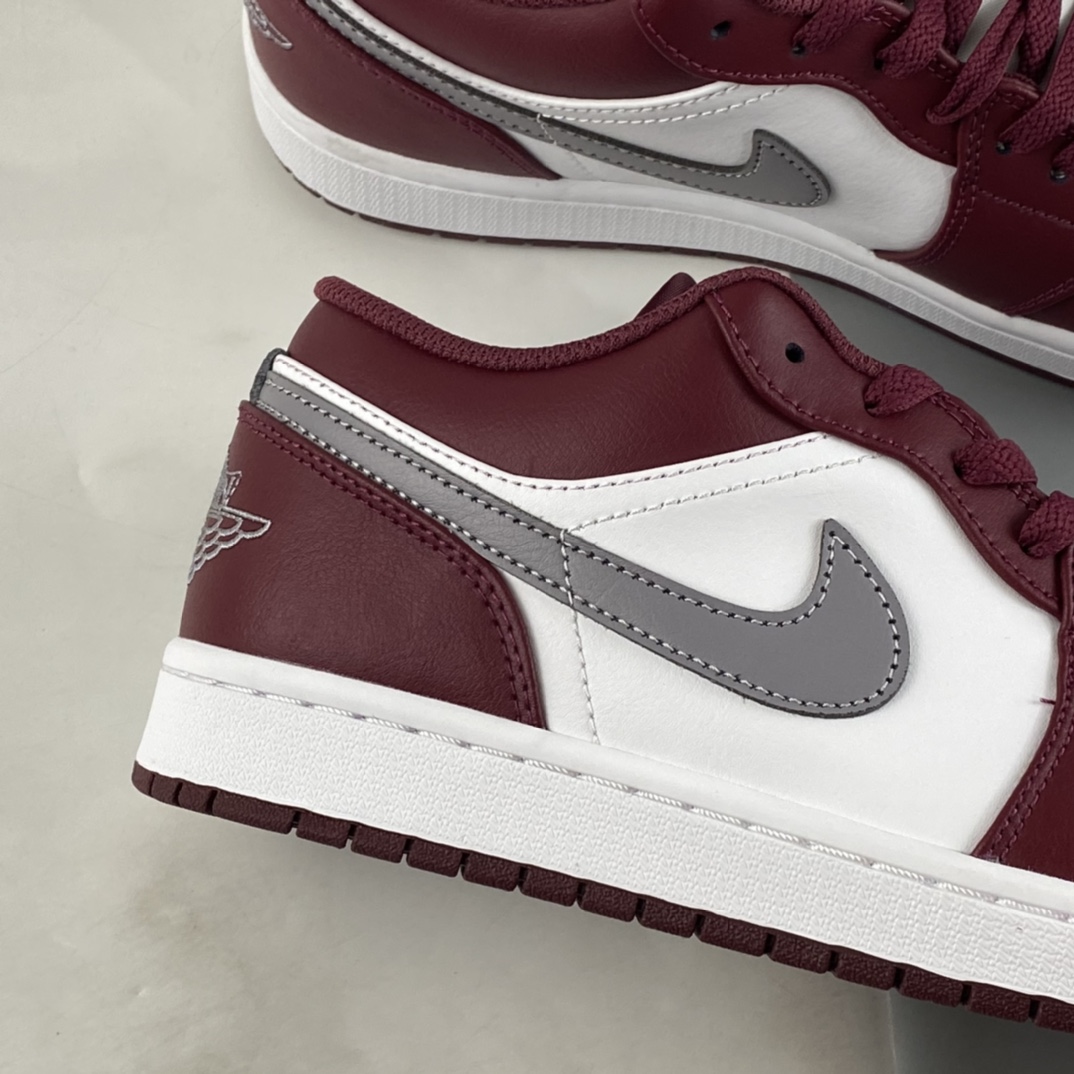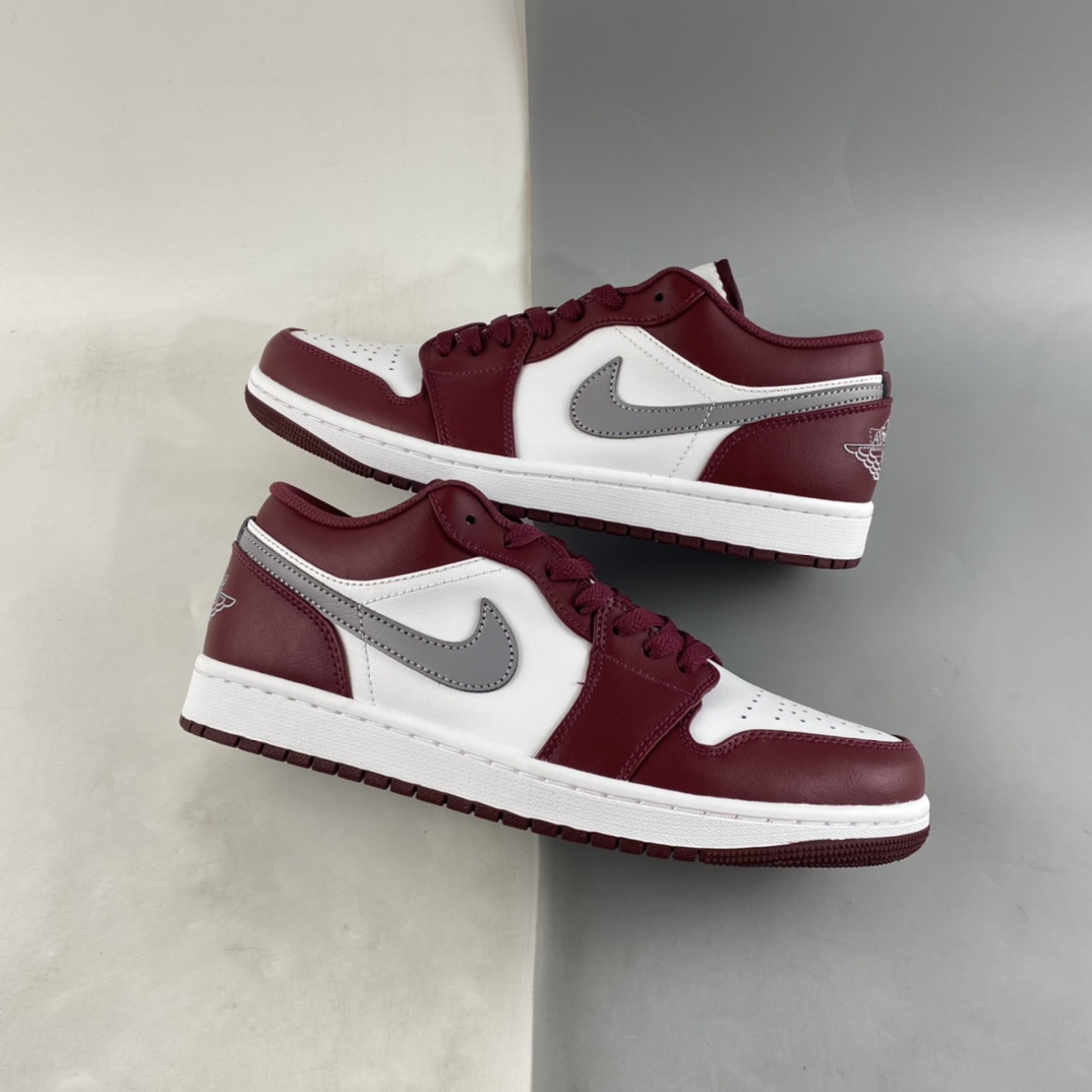 This offering of the low-top Air Jordan 1 features a White leather base with Bordeaux overlay, laces, lining, and rubber outsole. Silver Swooshes, Jumpman and Wings logos atop a White midsole completes the design.
