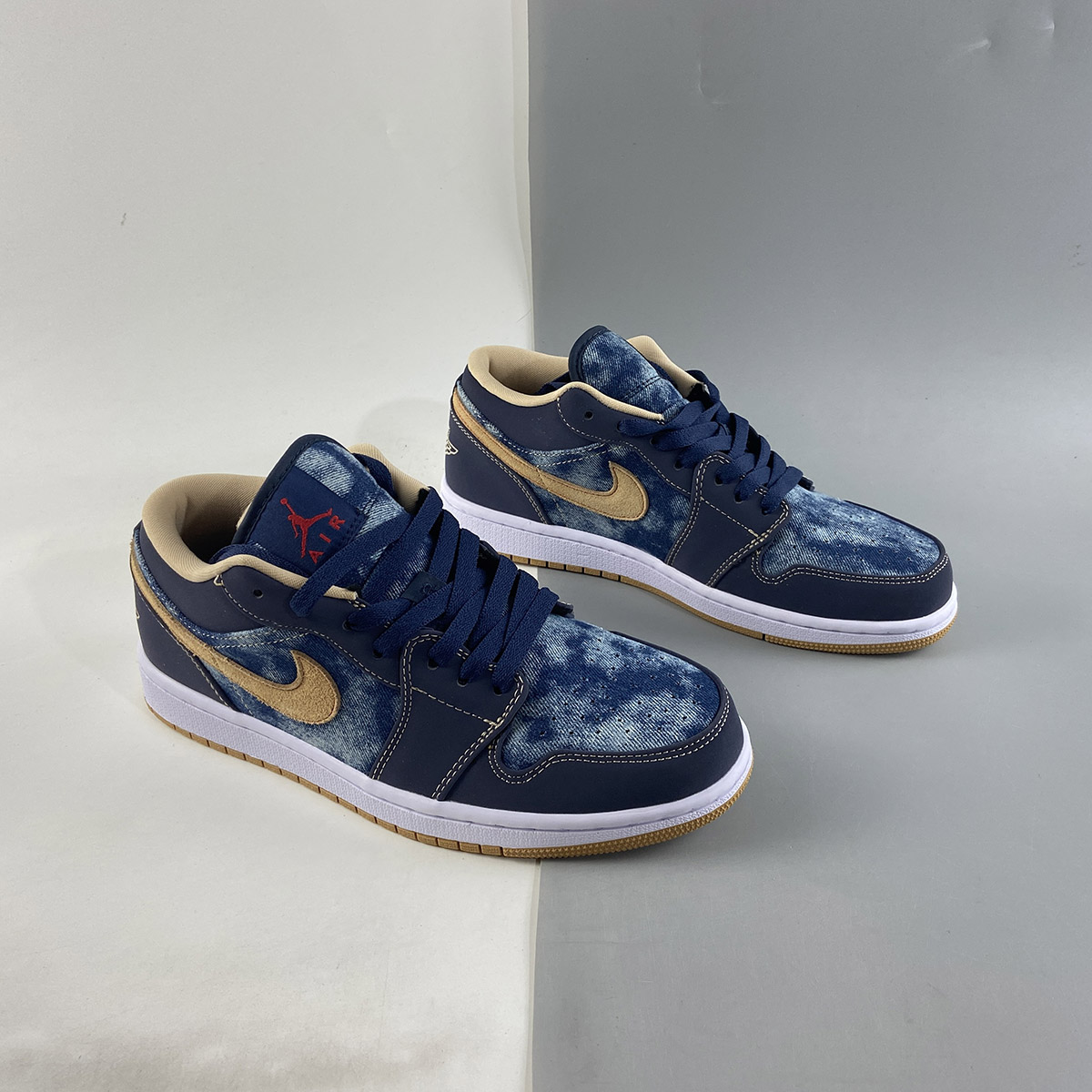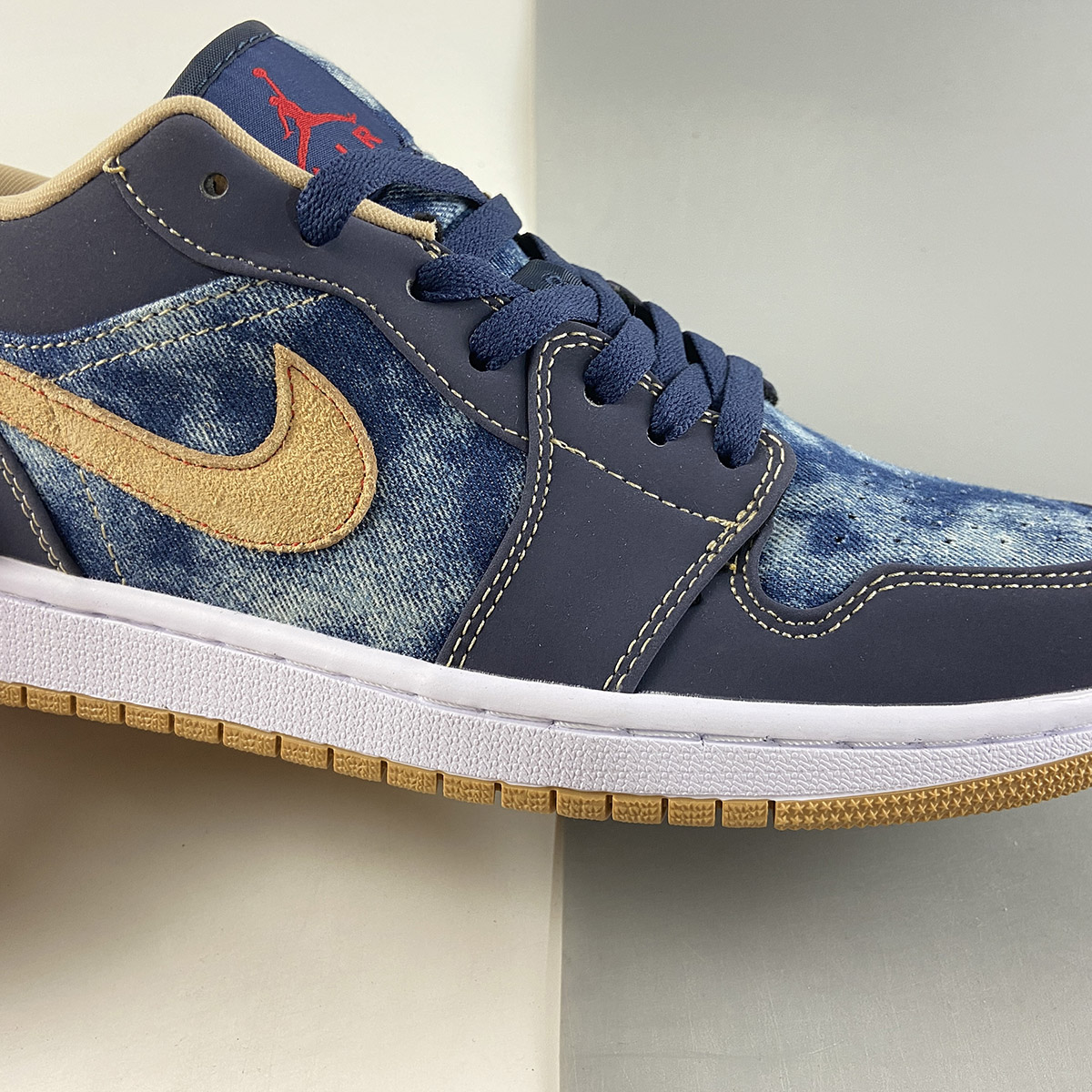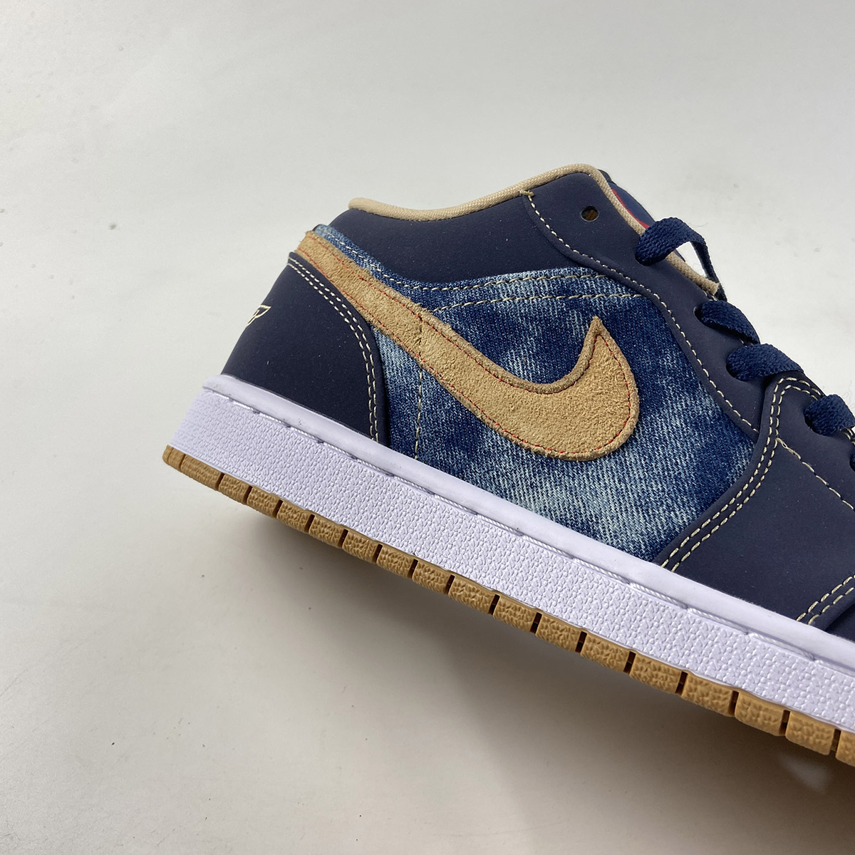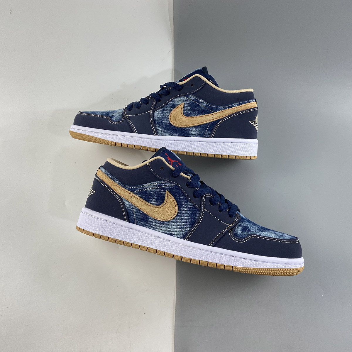 this low-top Air Jordan 1 comes with Blue denim across the base and tongue while Navy Blue nubuck lands on the overlays. Following, Tan hits the suede Swoosh logos, embroidered Wings on the heel, and liner with Red on the Jumpman logos and stitching that outlines the Swoosh on the panels. Other details include a White midsole and a Gum rubber outsole.