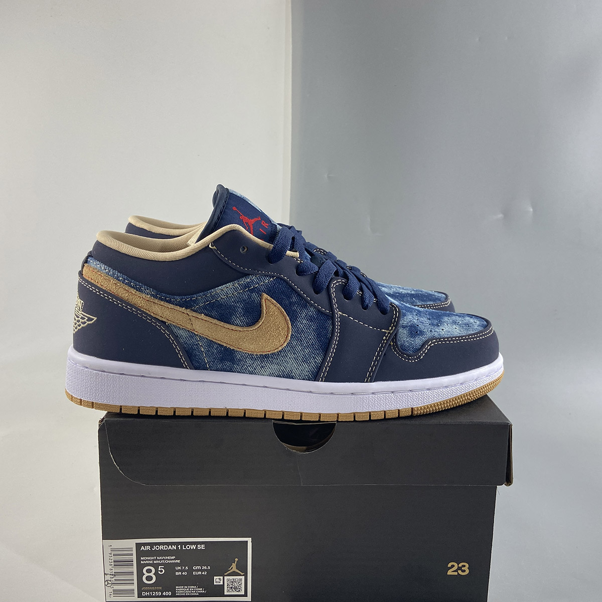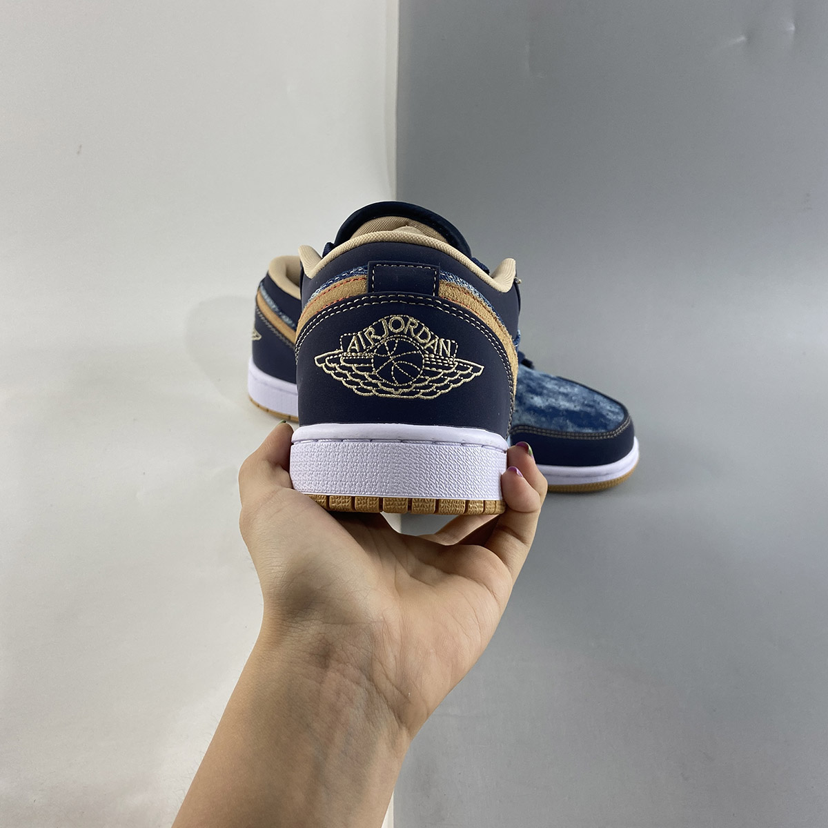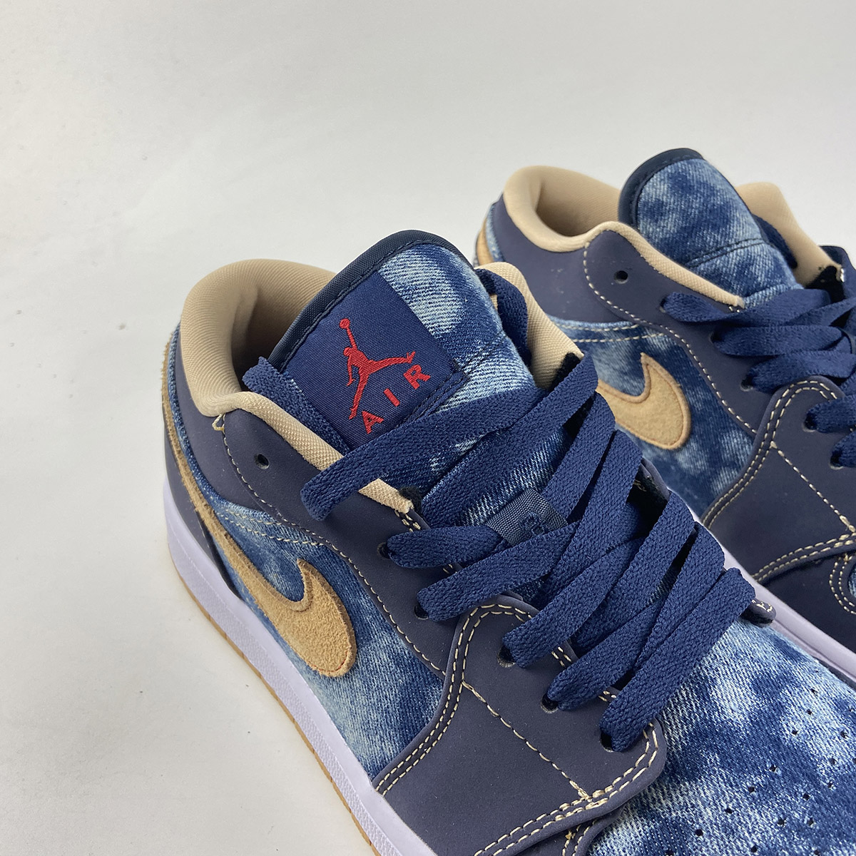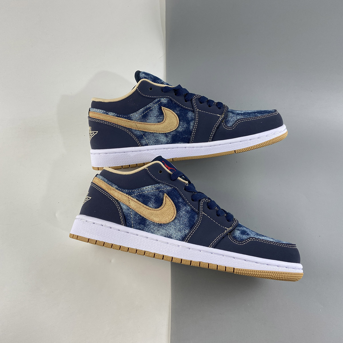 this low-top Air Jordan 1 comes with Blue denim across the base and tongue while Navy Blue nubuck lands on the overlays. Following, Tan hits the suede Swoosh logos, embroidered Wings on the heel, and liner with Red on the Jumpman logos and stitching that outlines the Swoosh on the panels. Other details include a White midsole and a Gum rubber outsole.