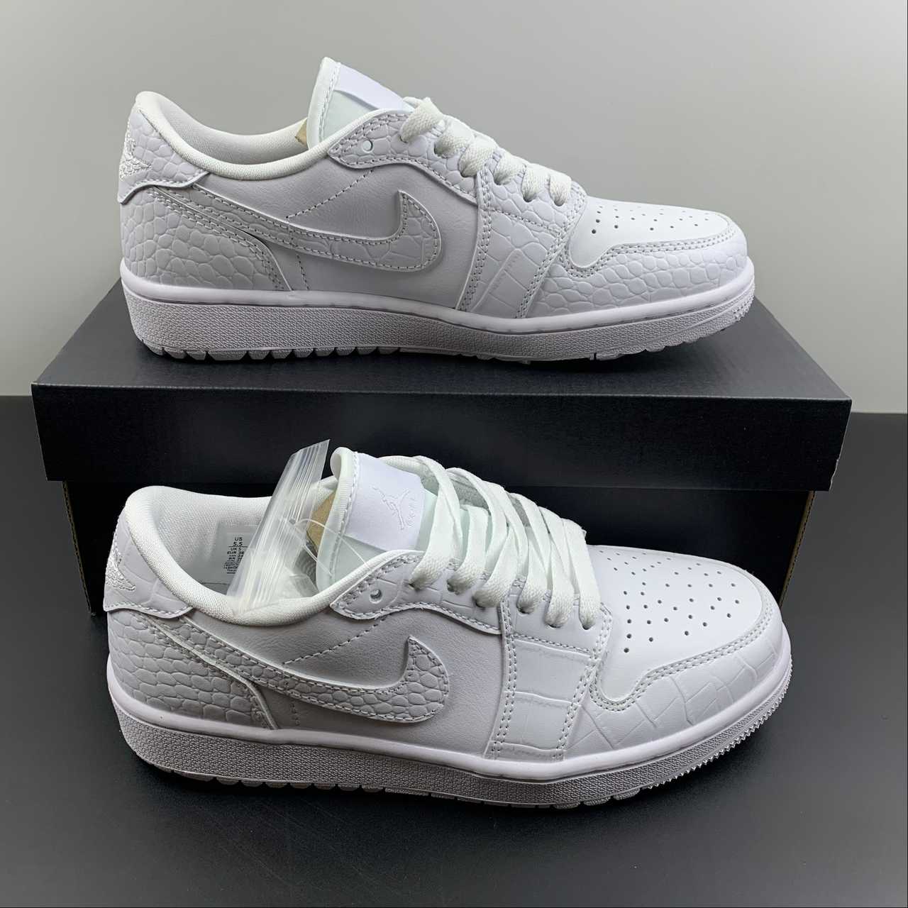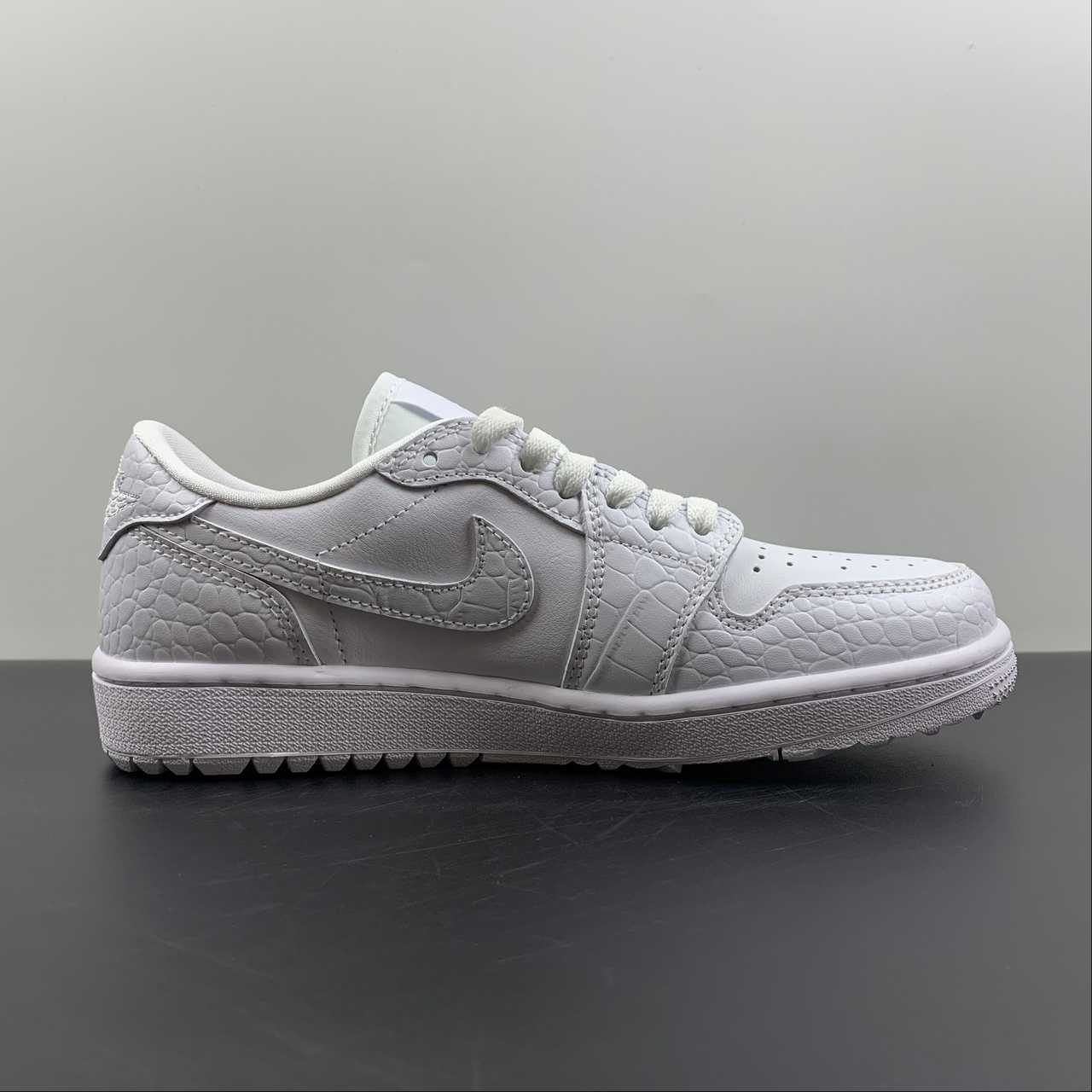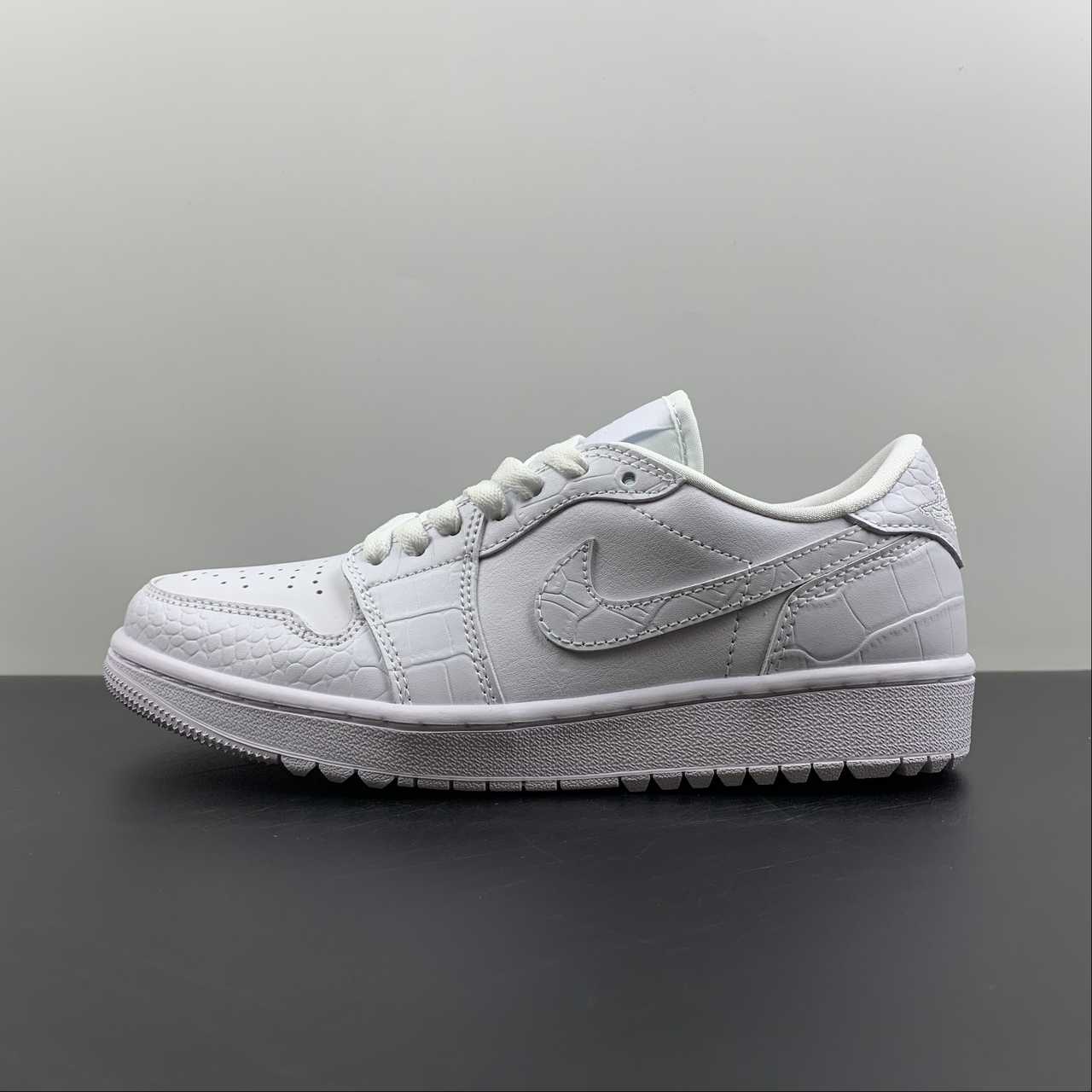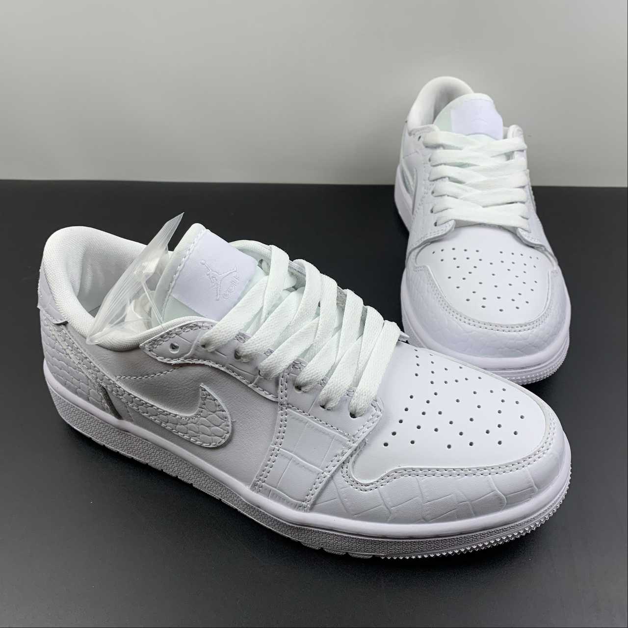The sneaker is seen in a triple white look, using different materials to bring contrast. The all-white upper removes the colourway from the centre view and points the camera towards the material quality instead. The tongue tag is seen in white with the Jumpman and GOLF branding in grey and the Wings logo stitched on the heel in white.The crocodile leather on the toe guard, Swoosh and heel panels nod to the traditional shoes that were often seen in the sport, most of which boasted the real thing. Smooth leather can be found on the sidewall and toe box, forgoing the crocodile texture seen on the other panels, providing the flexion needed for the upper to remain comfortable. The midsole has also been given the golfing update with its new tread, containing aggressive lugs that balance traction and pivoting, a key element to anybody’s game.