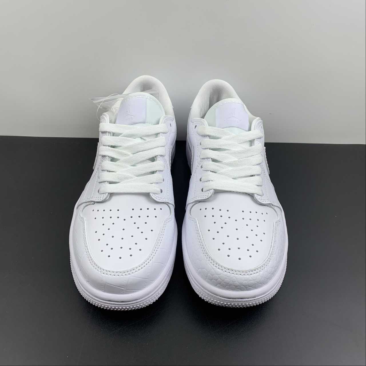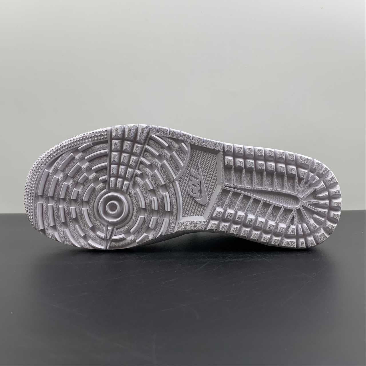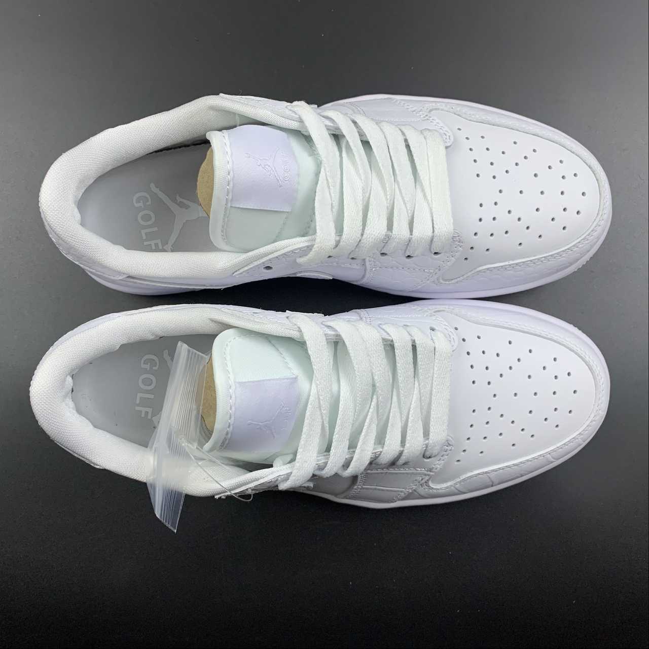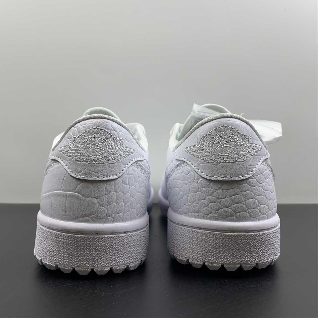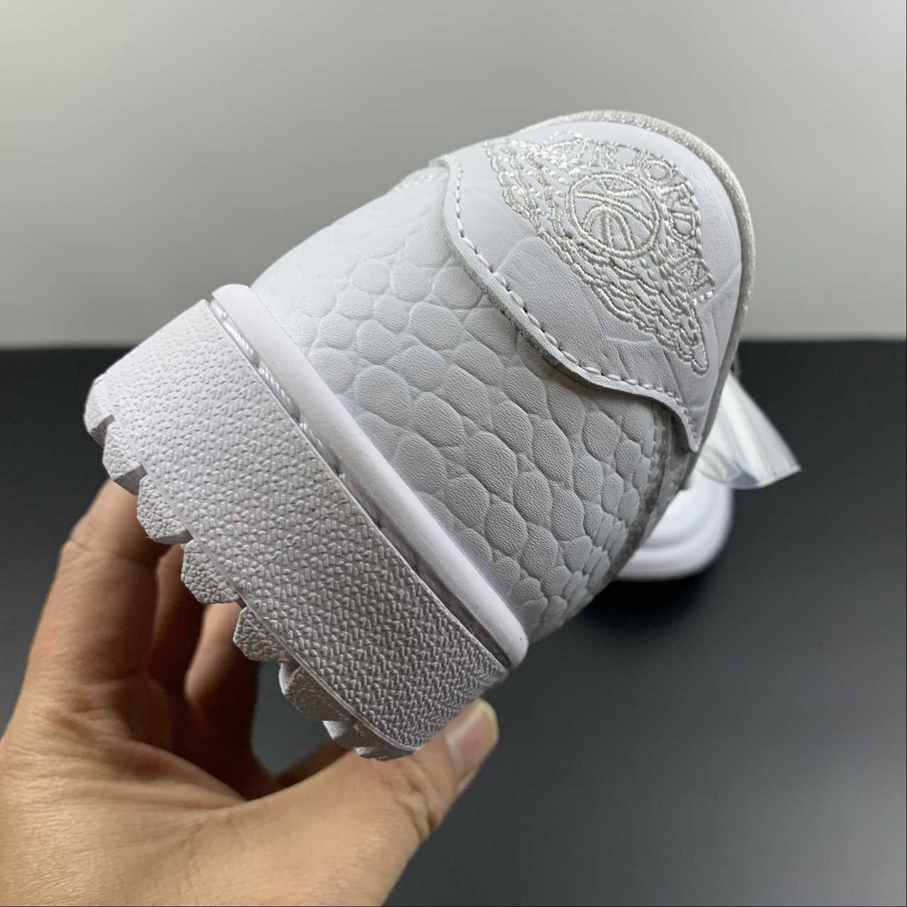 The sneaker is seen in a triple white look, using different materials to bring contrast. The all-white upper removes the colourway from the centre view and points the camera towards the material quality instead. The tongue tag is seen in white with the Jumpman and GOLF branding in grey and the Wings logo stitched on the heel in white.The crocodile leather on the toe guard, Swoosh and heel panels nod to the traditional shoes that were often seen in the sport, most of which boasted the real thing. Smooth leather can be found on the sidewall and toe box, forgoing the crocodile texture seen on the other panels, providing the flexion needed for the upper to remain comfortable. The midsole has also been given the golfing update with its new tread, containing aggressive lugs that balance traction and pivoting, a key element to anybody’s game.