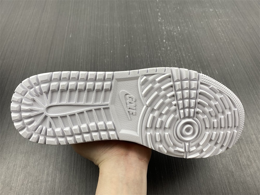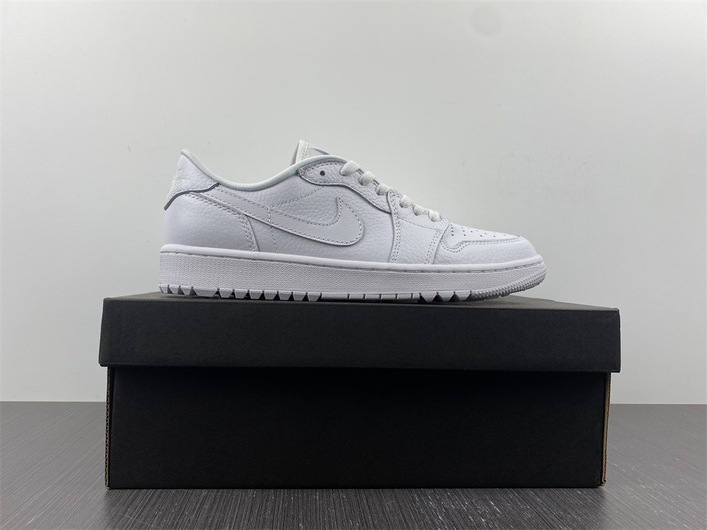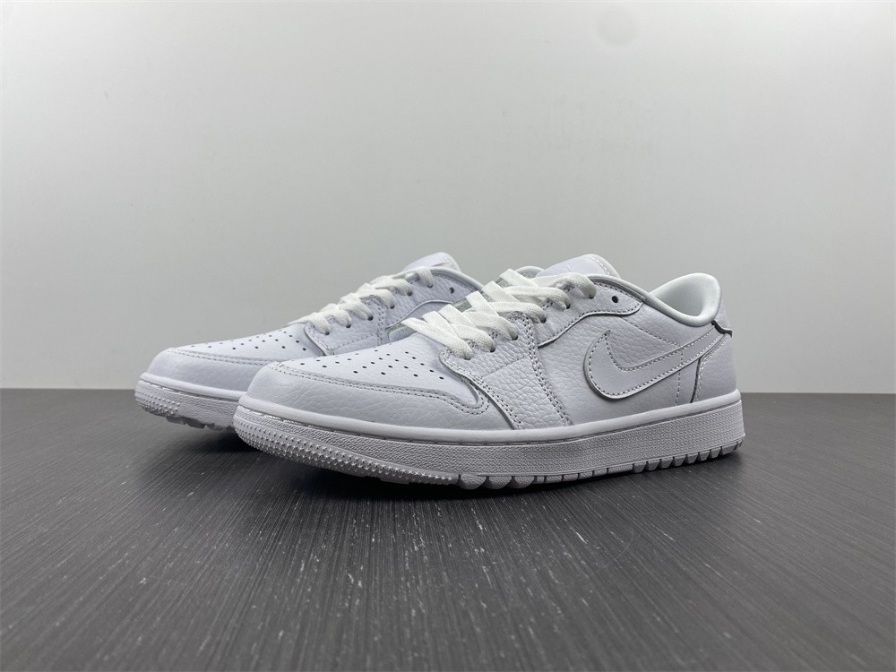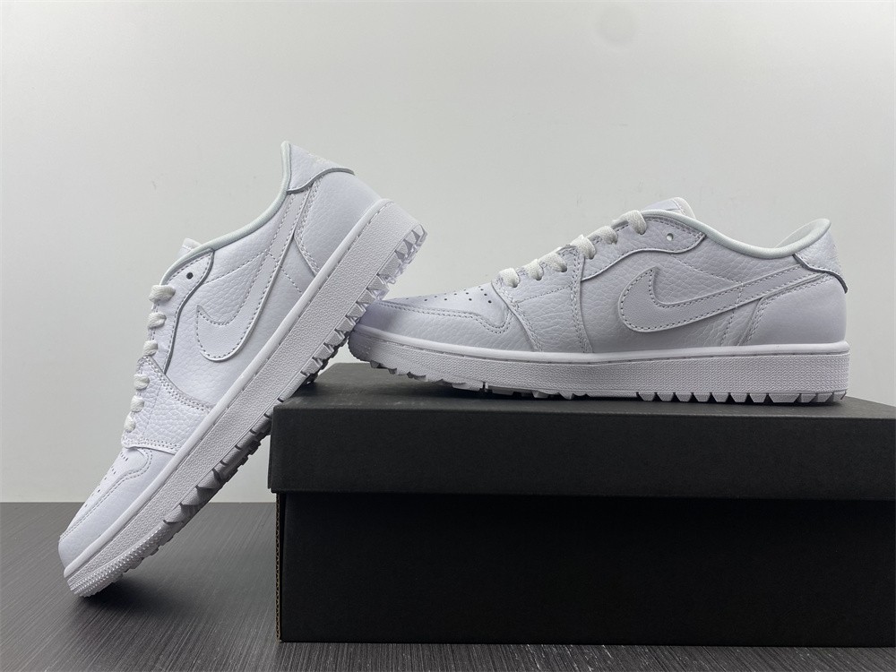 This Golf edition of the Air Jordan 1 Low features an all-White tumbled leather upper with leather Swooshes and tonal branding on the tongues, insoles, and heels. A solid White rubber sole completes the design.