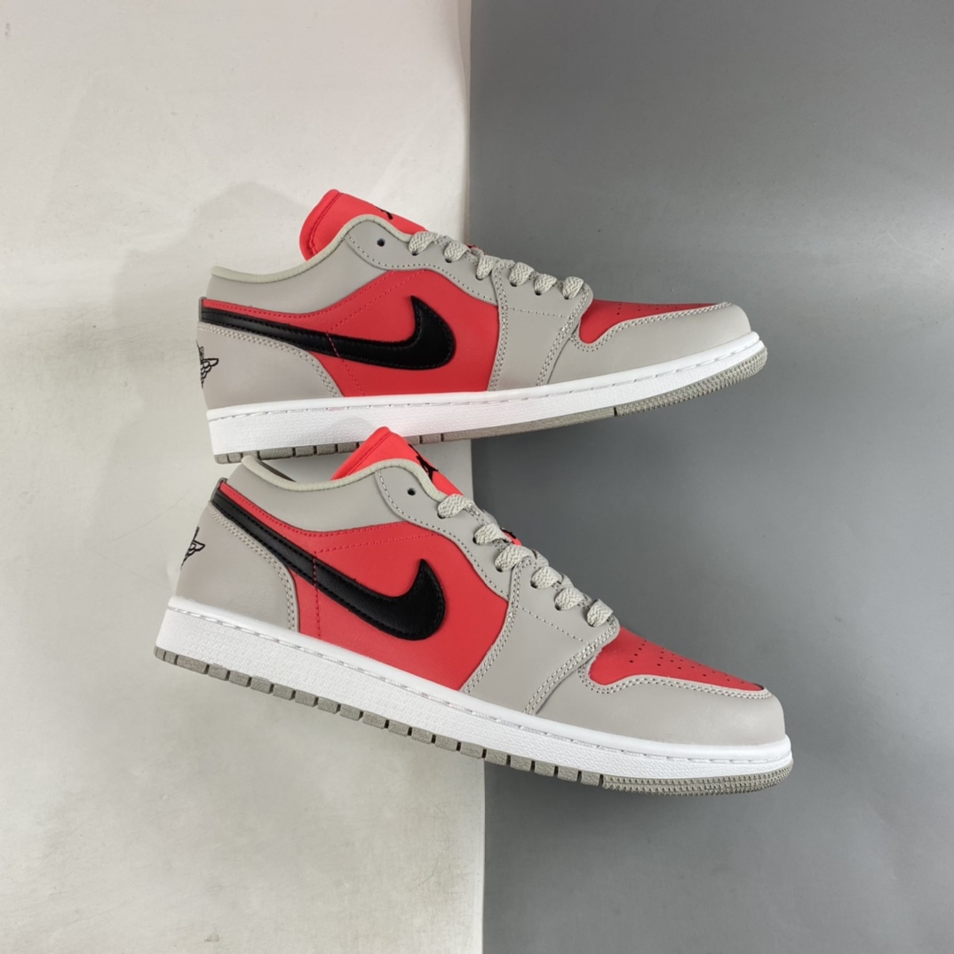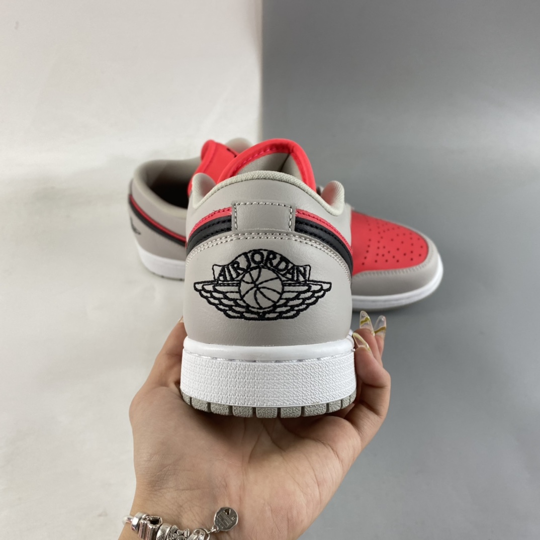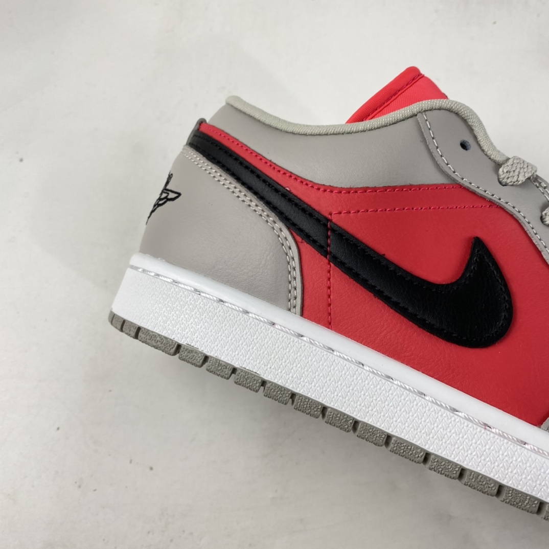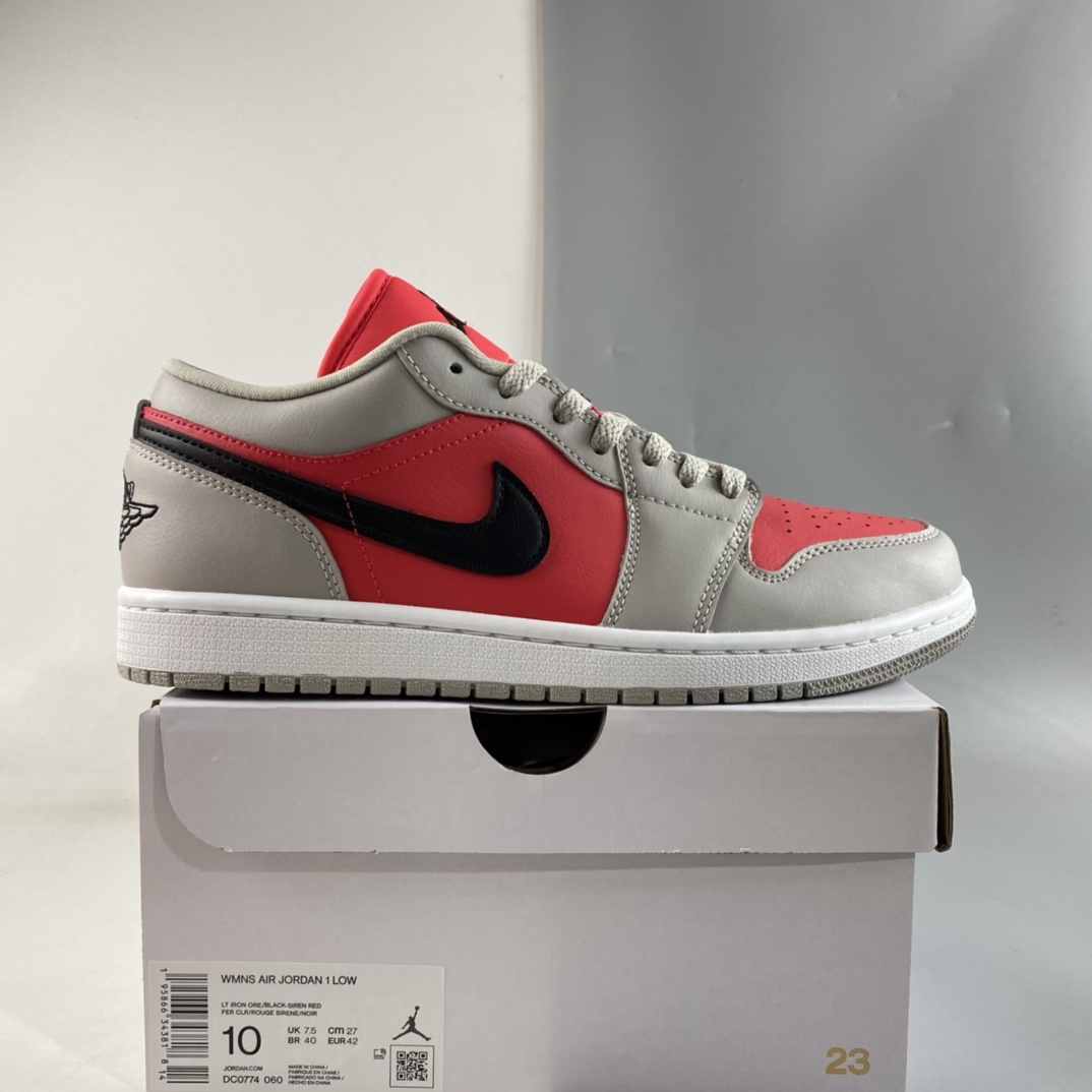 Dressed in a Light Iron Ore, Black, and Siren Red color scheme. This offering of the low-top Air Jordan 1 comes in a leather build featuring a Siren Red base with Black Swooshes and Light Iron Ore overlays. Black embroidered branding on the mesh tongues and heels atop a White midsole and Grey rubber outsole completes the design.