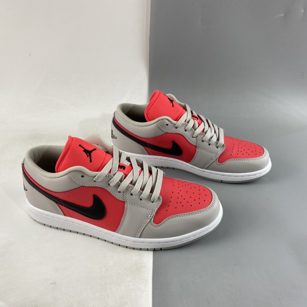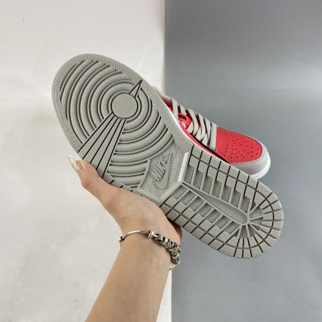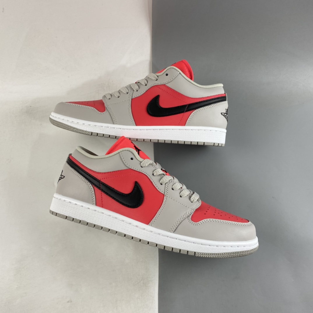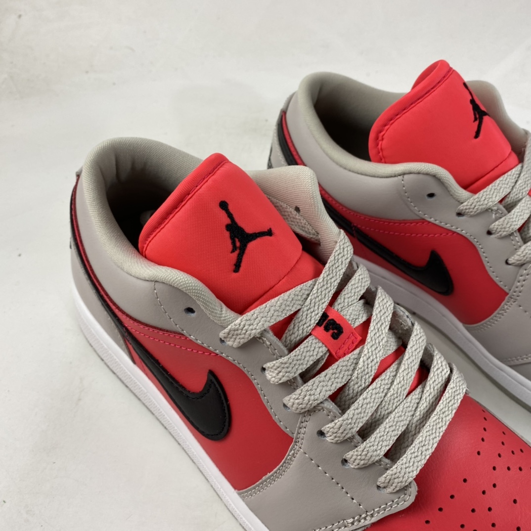 Dressed in a Light Iron Ore, Black, and Siren Red color scheme. This offering of the low-top Air Jordan 1 comes in a leather build featuring a Siren Red base with Black Swooshes and Light Iron Ore overlays. Black embroidered branding on the mesh tongues and heels atop a White midsole and Grey rubber outsole completes the design.