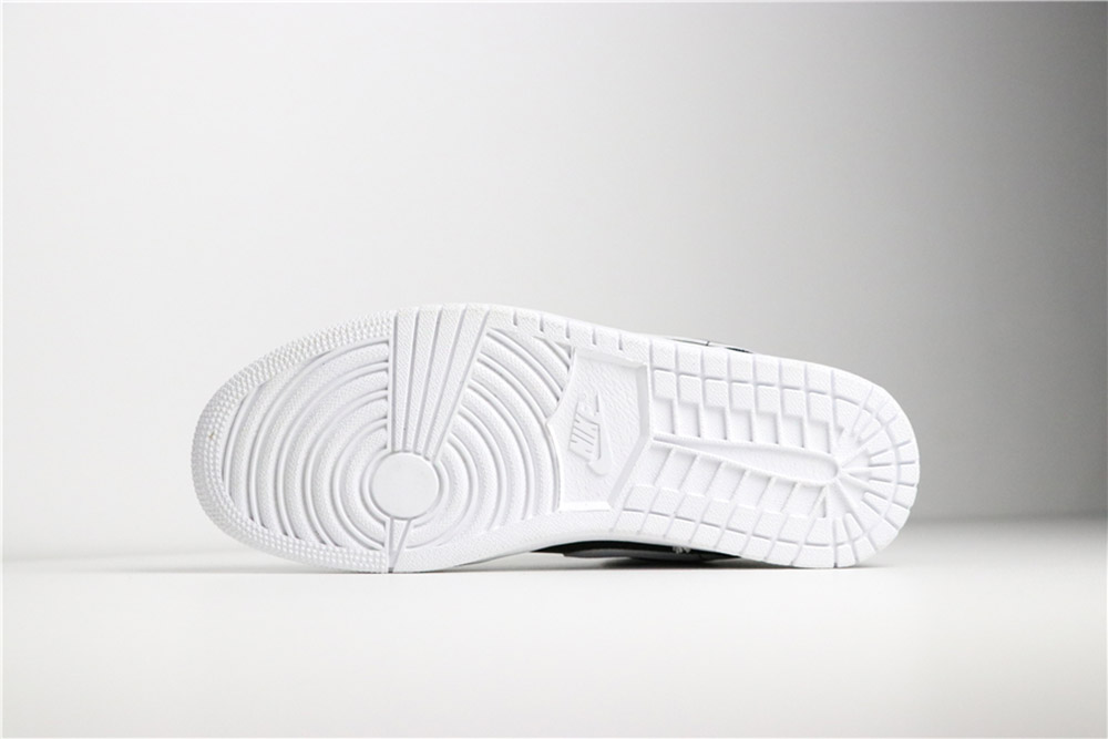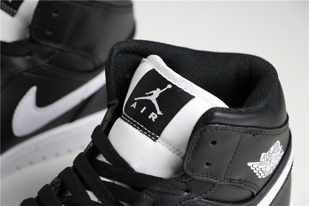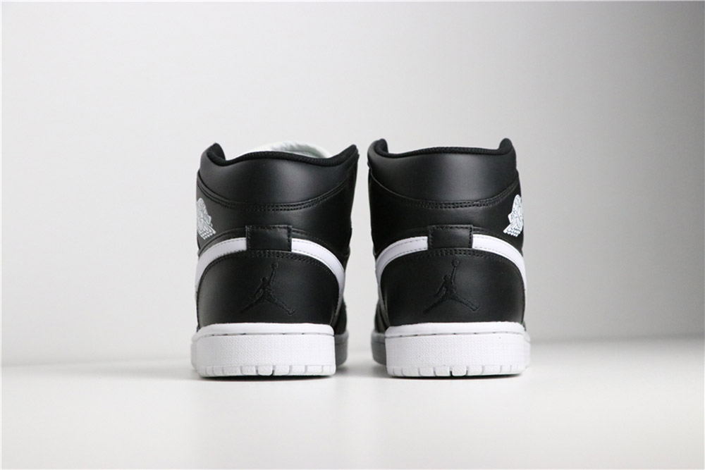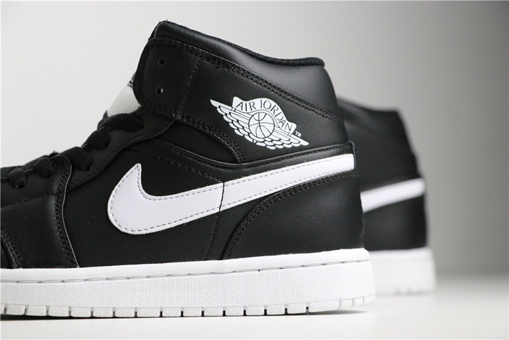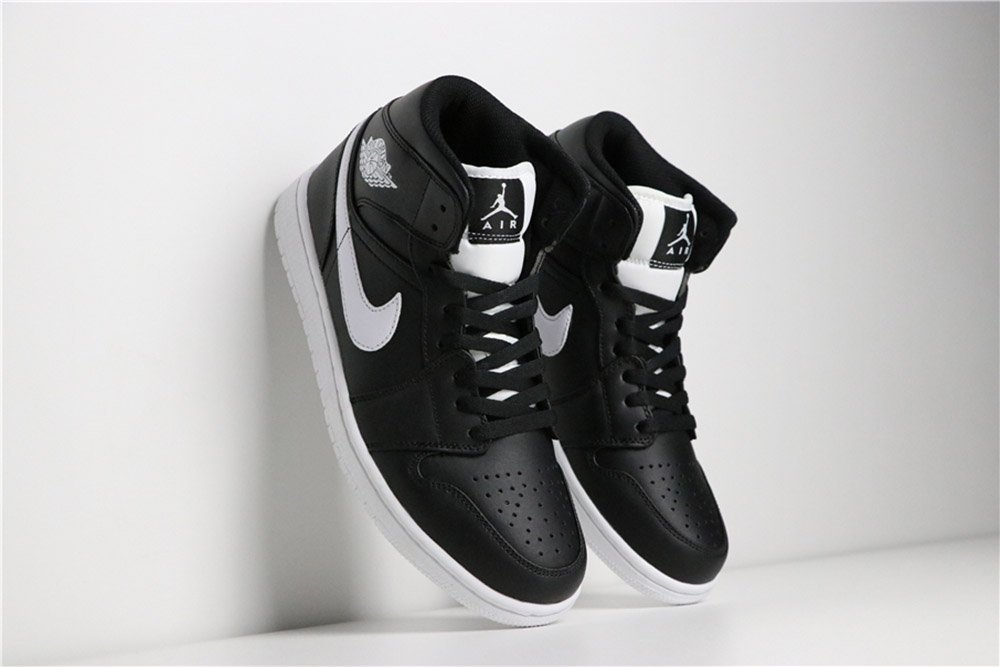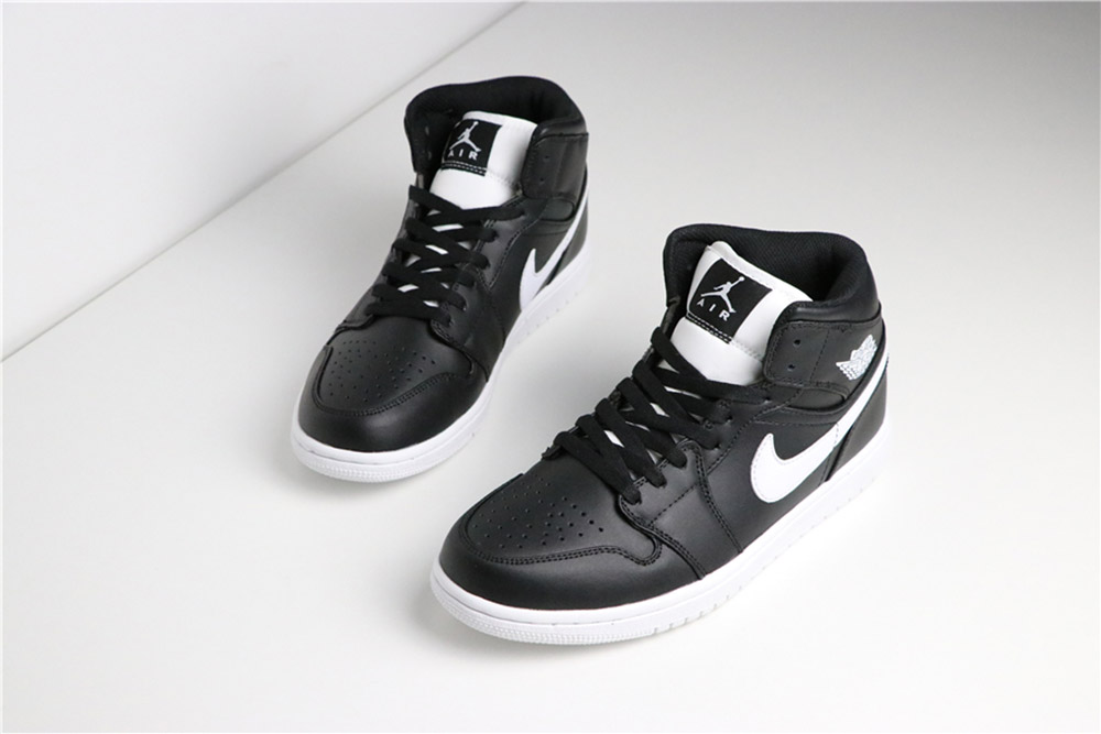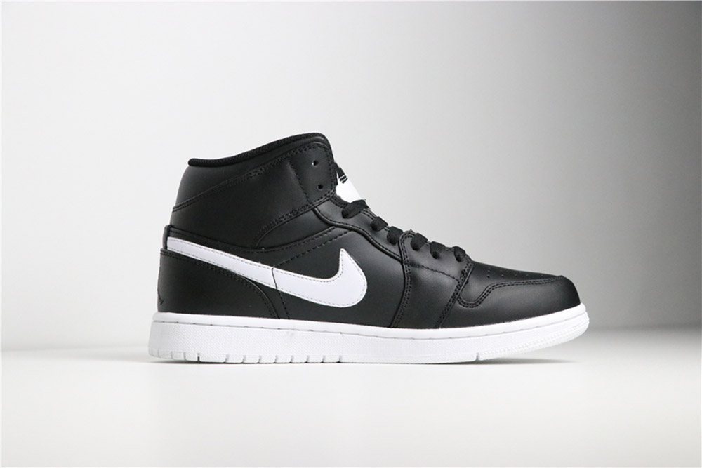 This stylish mid-top version of the Air Jordan 1 features an all-Black leather upper with perforated detailing on the toe cap and White accents on the Nike Swoosh logos, nylon tongue, and outsole.