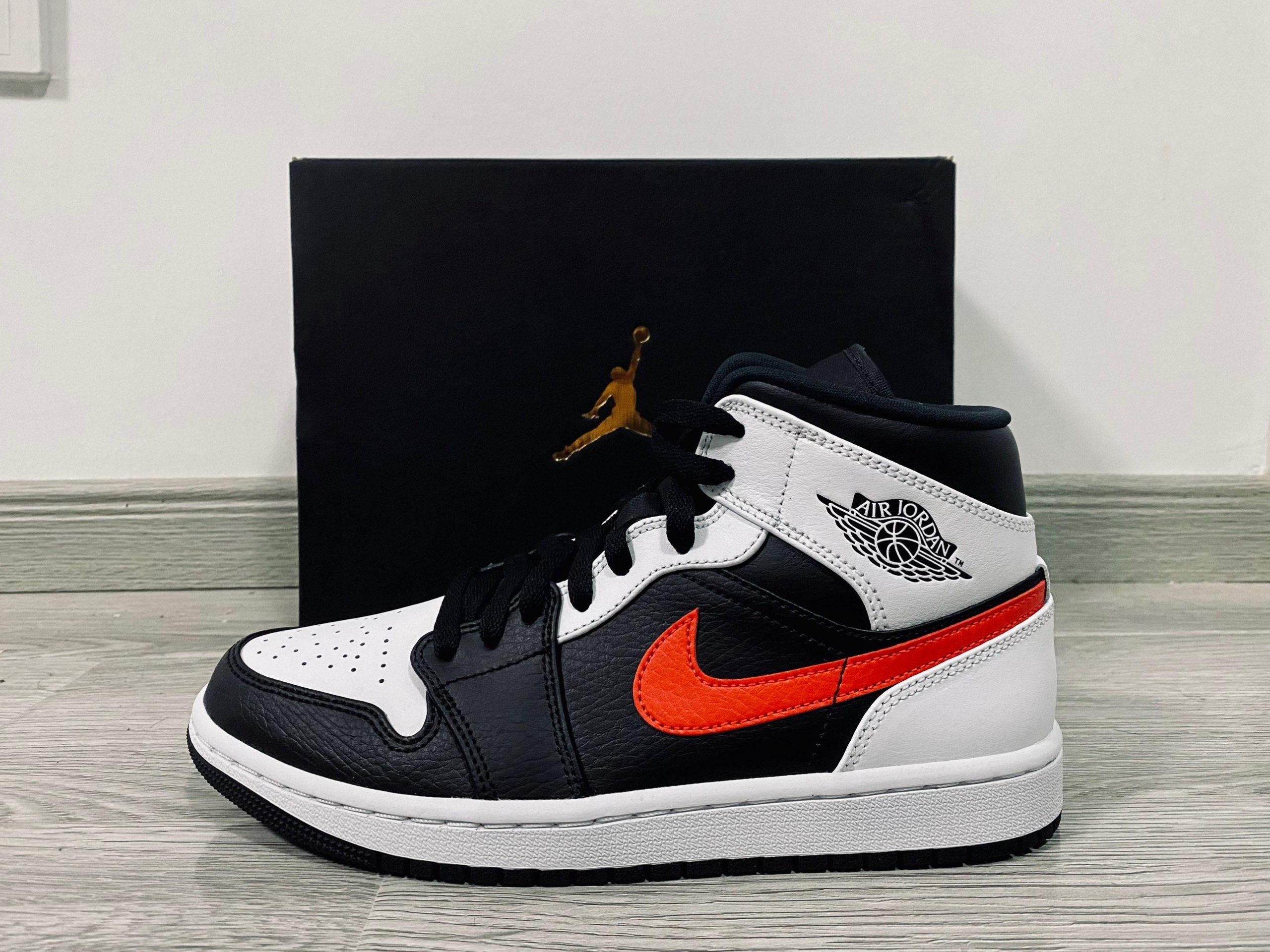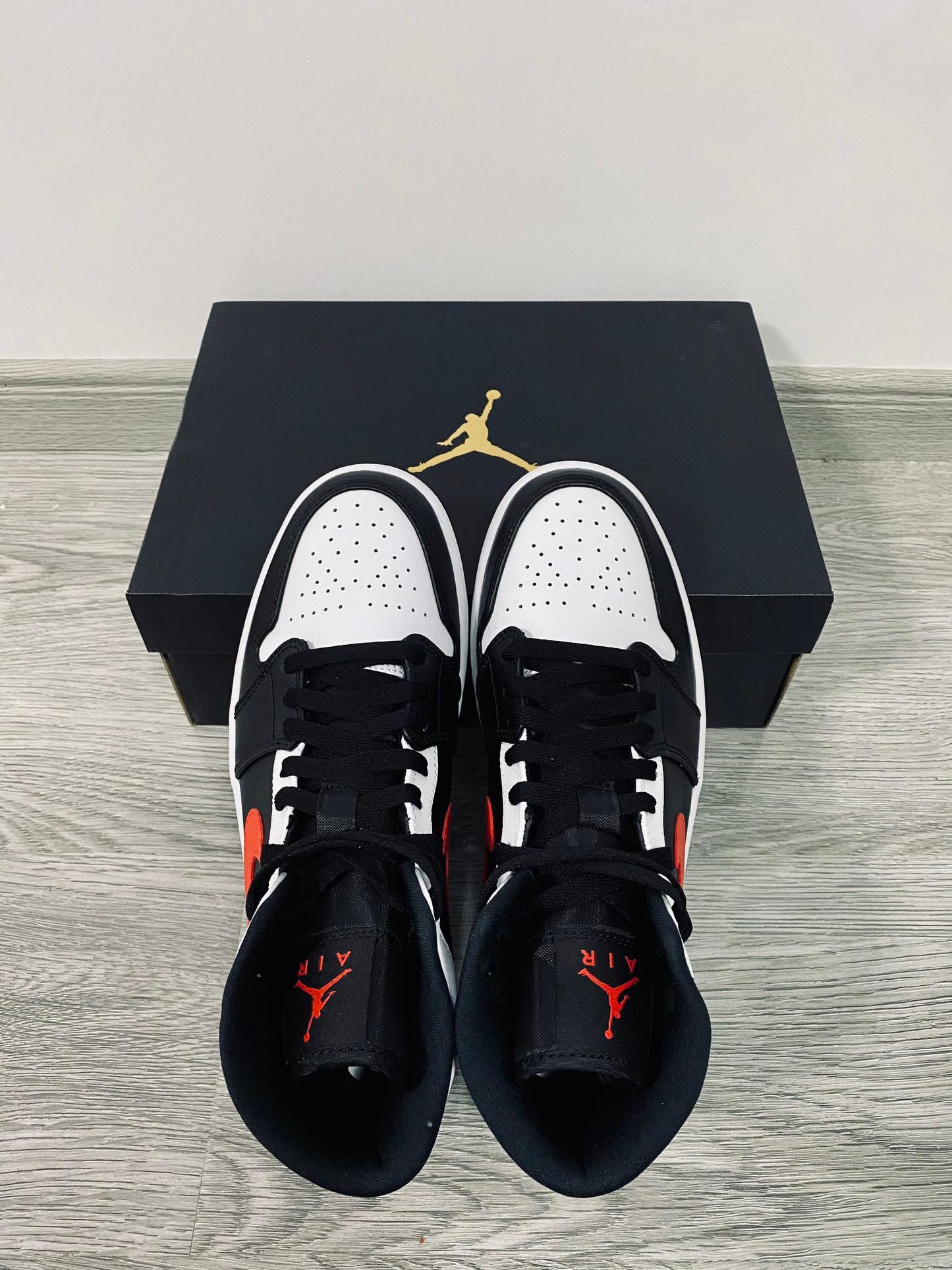 Dressed in a Black, Chile Red, and White color scheme. This mid-top Air Jordan 1 features White smooth leather on the toe box, upper eyelet, ankle flap, heel, and midsole. Black tumbled leather covers the overlays, side panels, ankle collar, laces, inner lining, Wings logos, and rubber outsole. Finishing off the design are Red Swoosh logos and Jumpmans on the tongue and insoles.