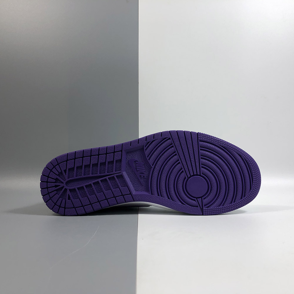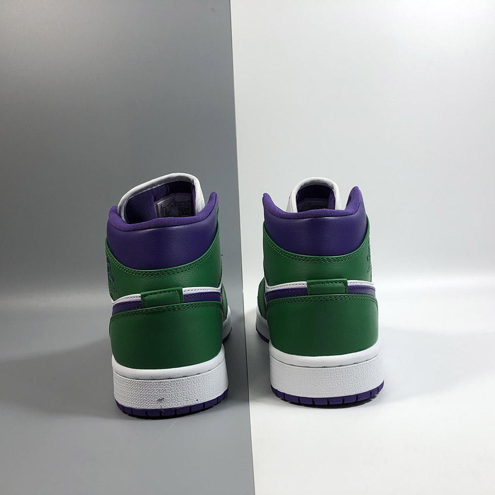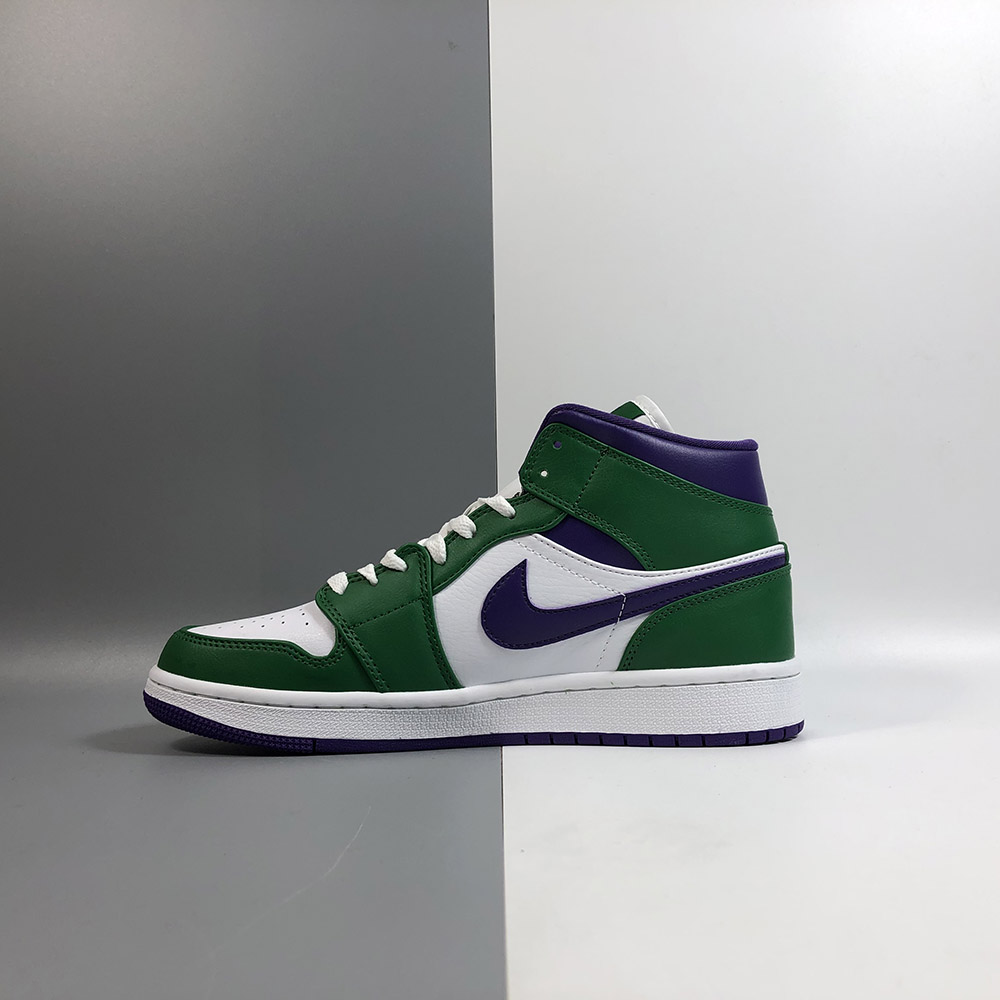 This offering of the mid-top Air Jordan 1 features White leather on the side panels and toe paired with Green leather overlays. Purple covers the tongue tabs, ankle collar, Swoosh logos and rubber outsole.