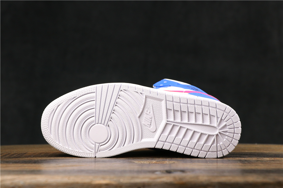 This offering of the mid-top Air Jordan 1 features a White leather upper with Royal overlays and Violet Swoosh logos on the sides. Both colors are used on the tongue label, while having a Royal Jumpman on the insole atop a solid White rubber sole.