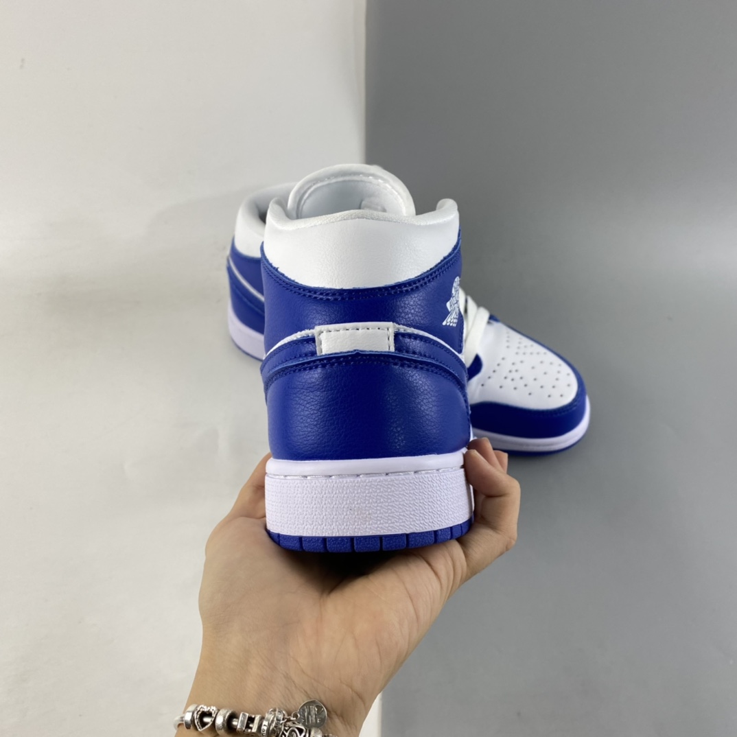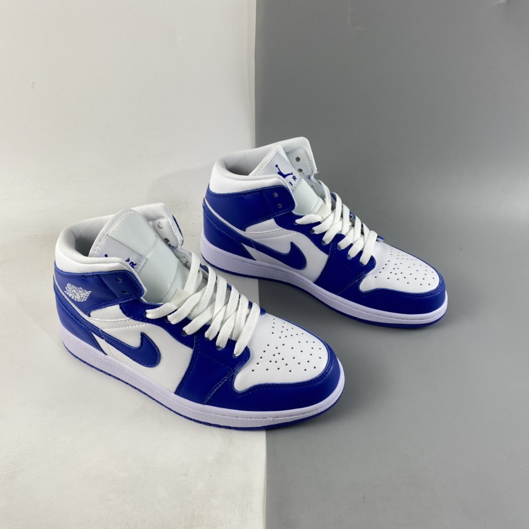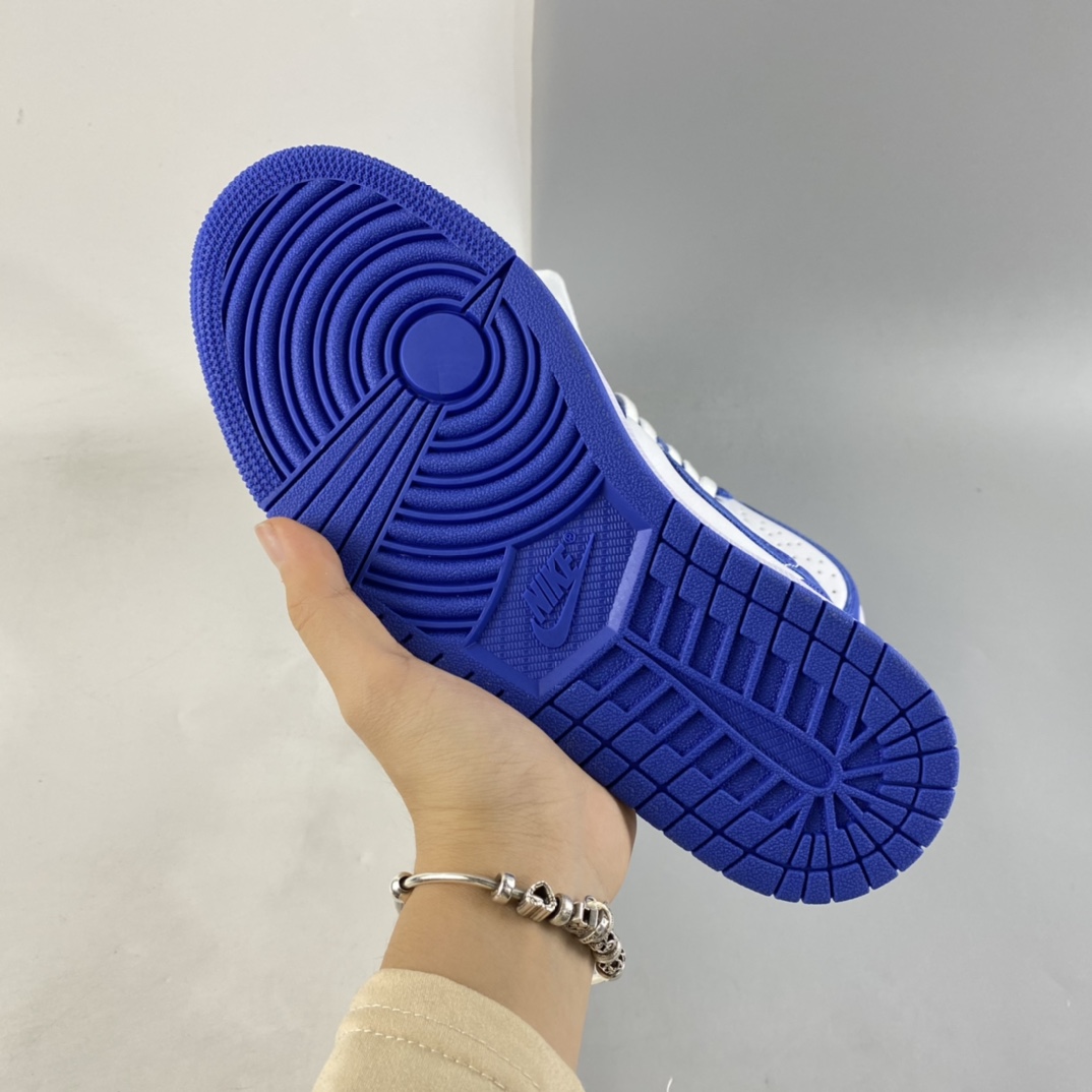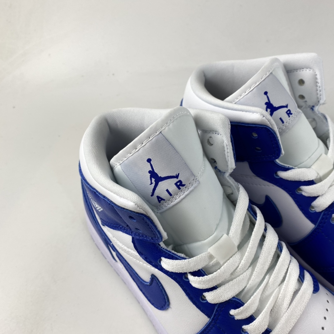 Dressed in a White and Hyper Royal color scheme. This offering fo the mid-top Air Jordan 1 features a White leather base with Royal Blue overlays, Swooshes, Jumpman branding on the tongues and insoles atop a matching Blue rubber outsole. White laces, tongues, liner and midsole completes the design.