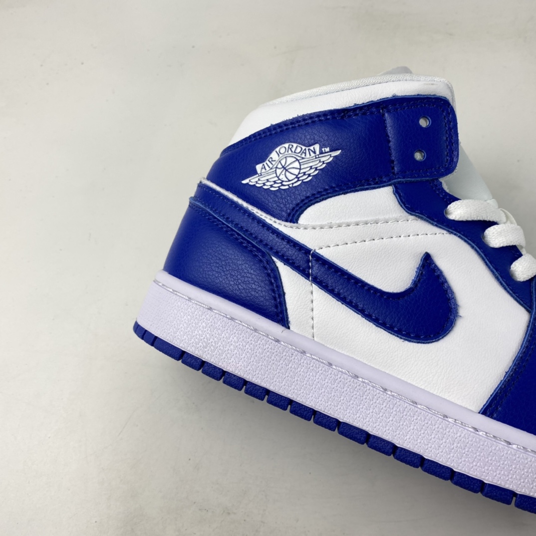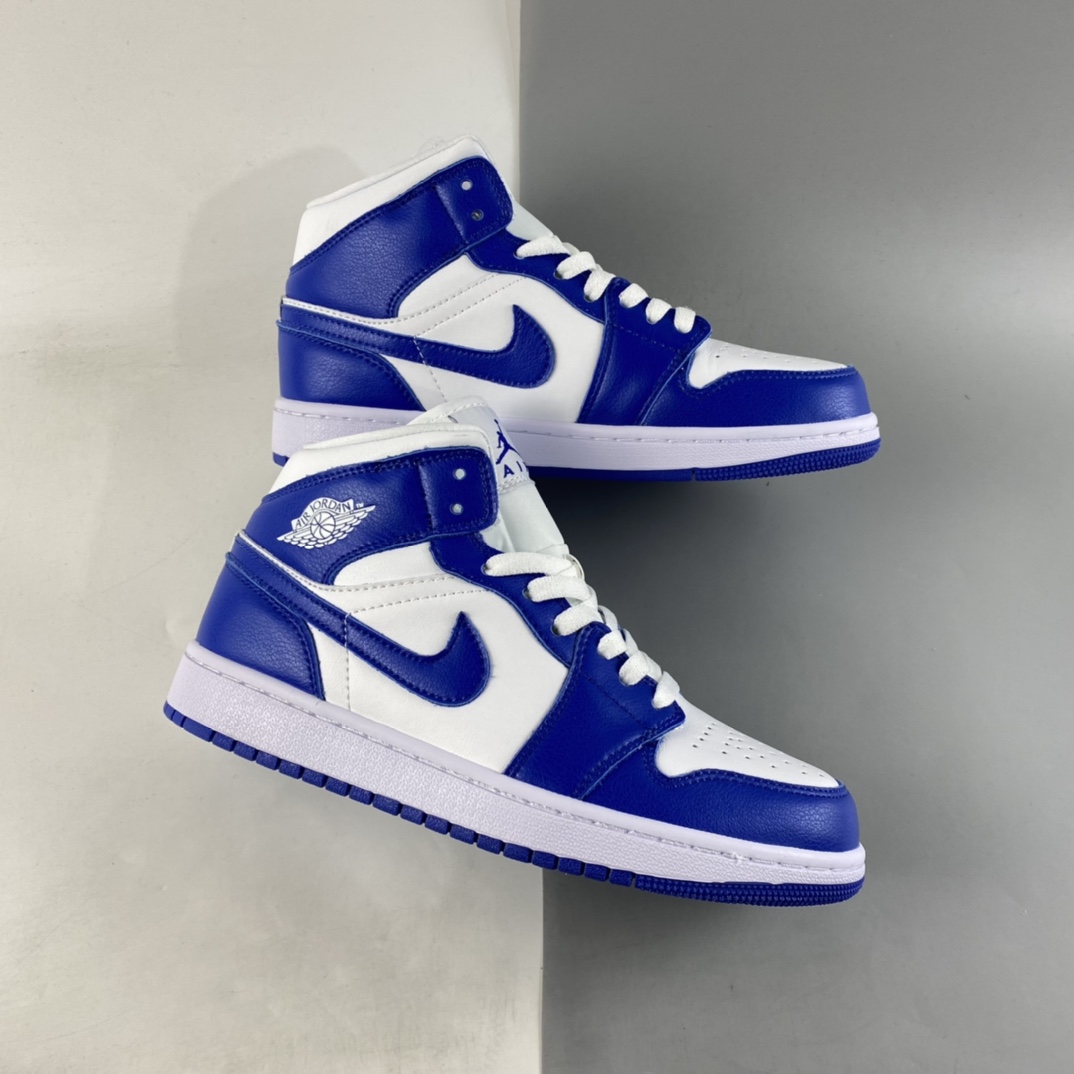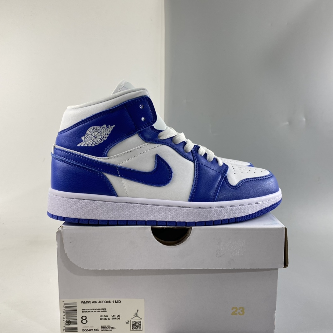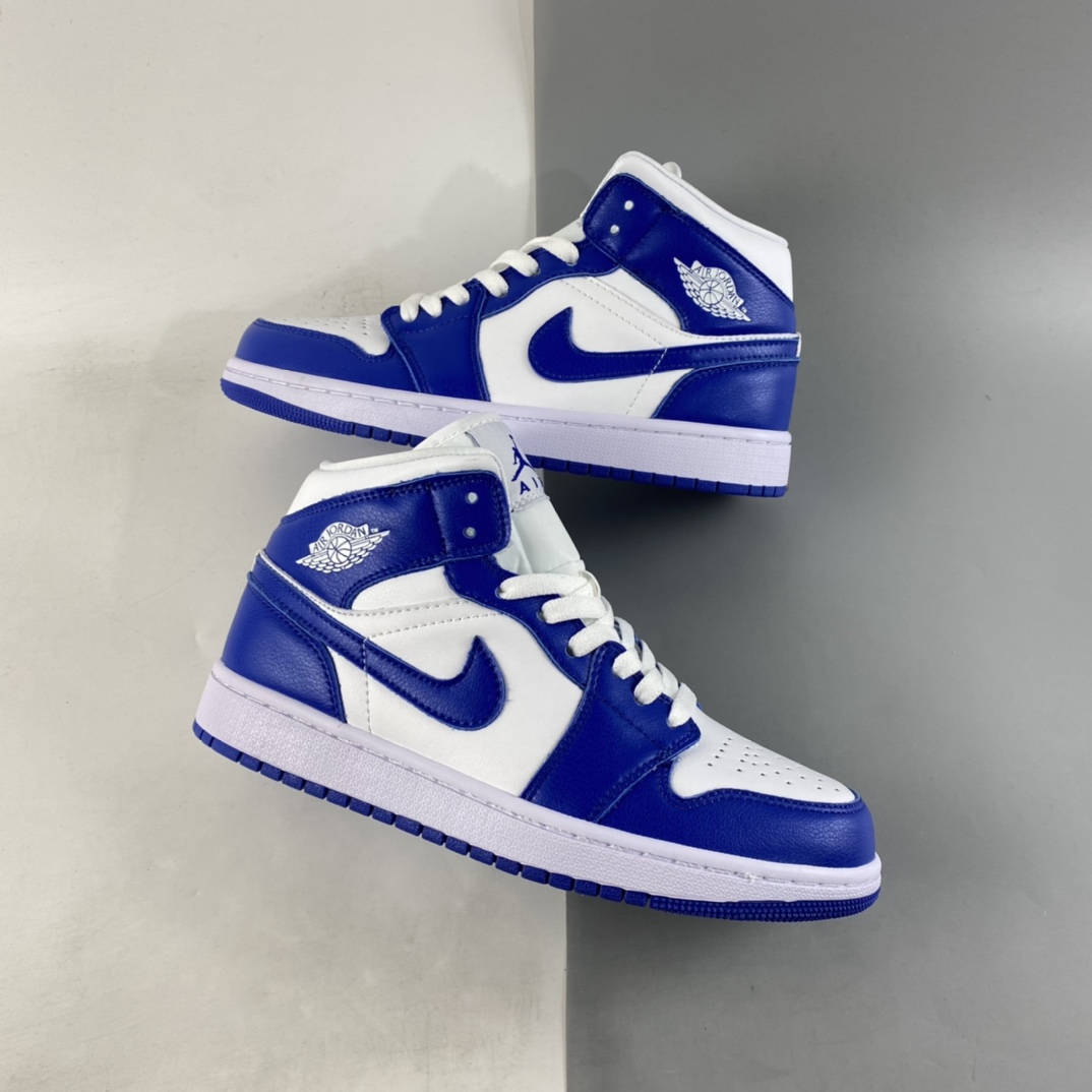 Dressed in a White and Hyper Royal color scheme. This offering fo the mid-top Air Jordan 1 features a White leather base with Royal Blue overlays, Swooshes, Jumpman branding on the tongues and insoles atop a matching Blue rubber outsole. White laces, tongues, liner and midsole completes the design.