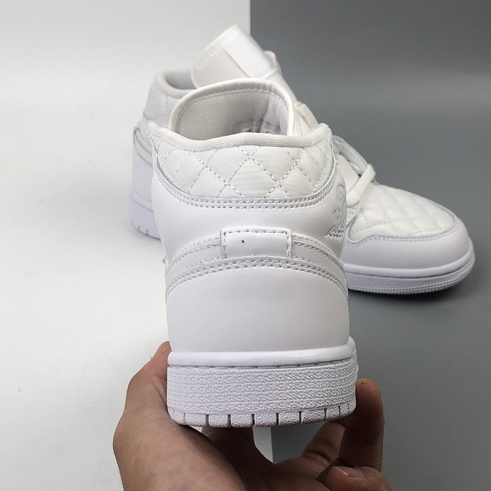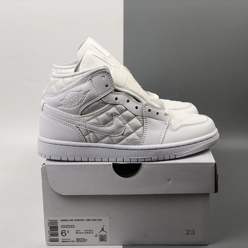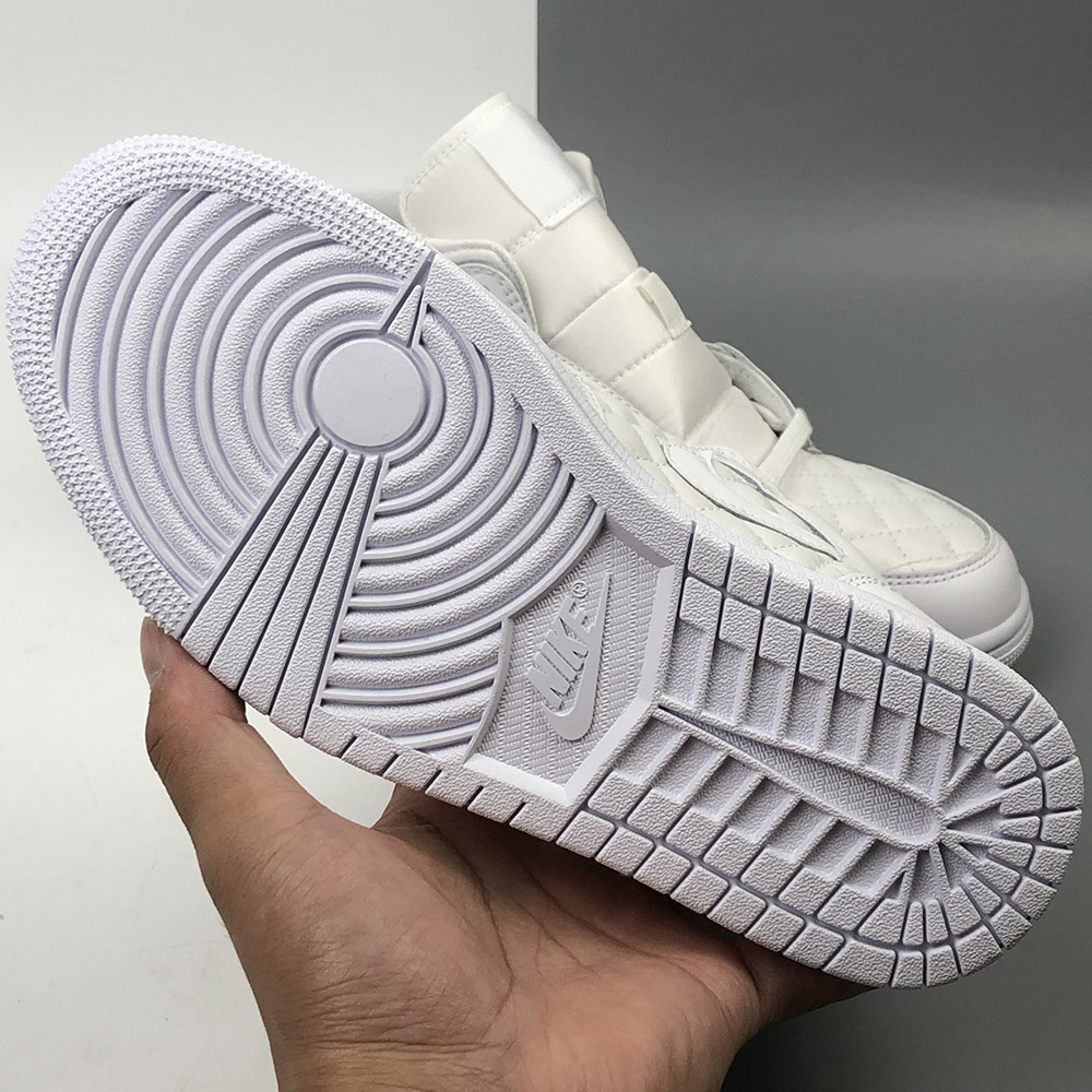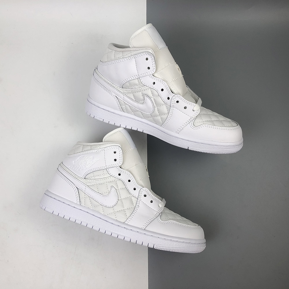 This “Triple White” offering that features a White quilted upper with White leather overlays. Matching tonal branding throughout, a Black Jumpman on the insoles atop a White rubber sole completes the design.