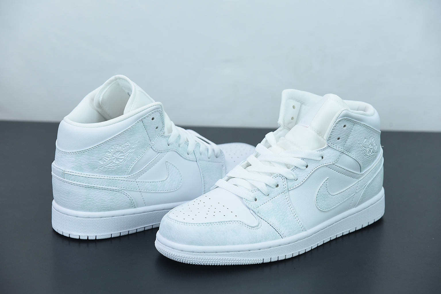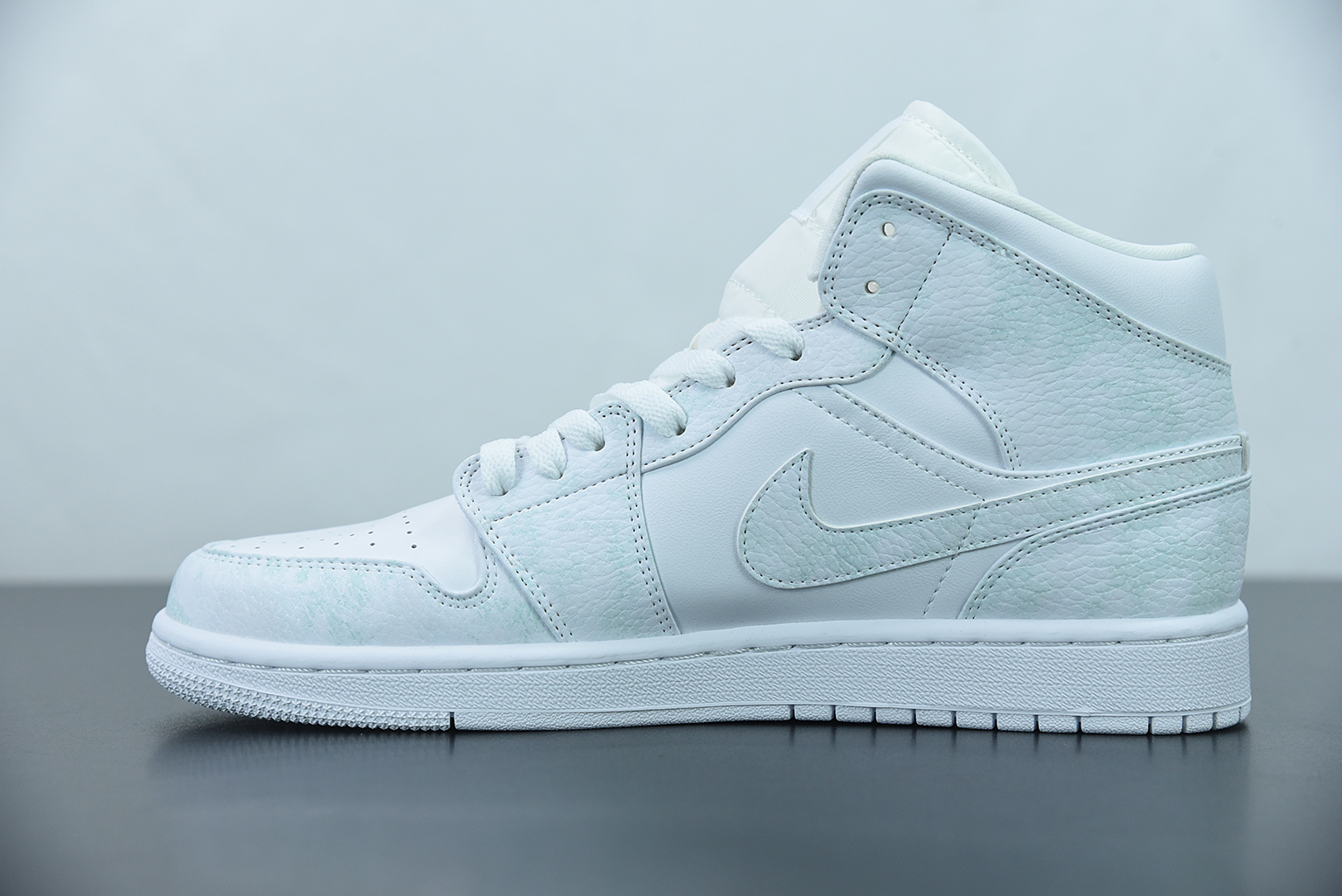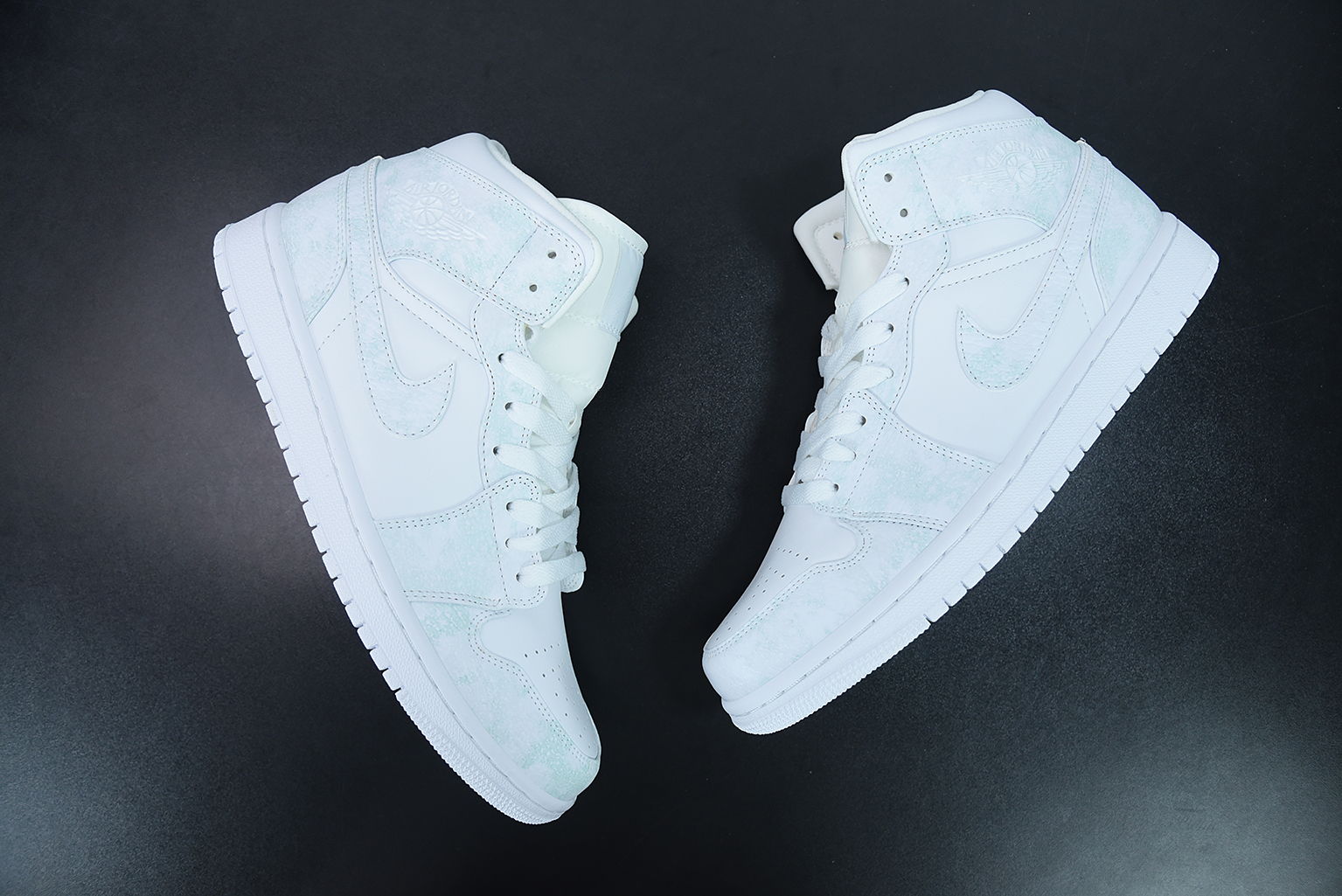 Fully dressed in an all-White color blocking. This mid-top Air Jordan 1 comes constructed in a mix of smooth and tumbled leather paired with matching tonal branding atop a solid White rubber sole.