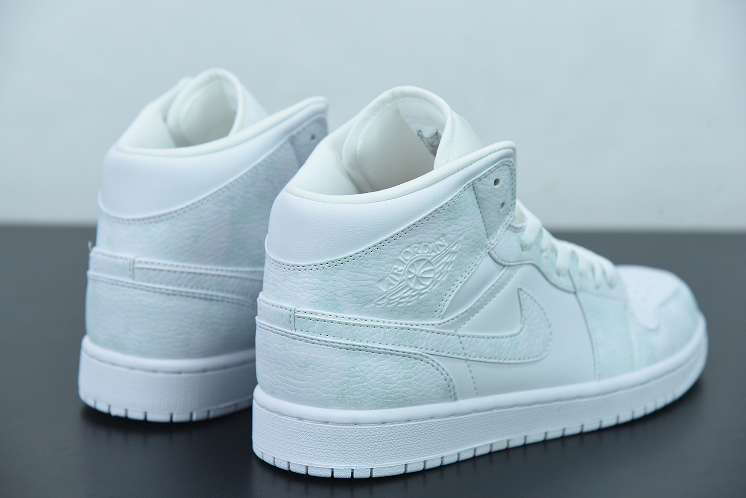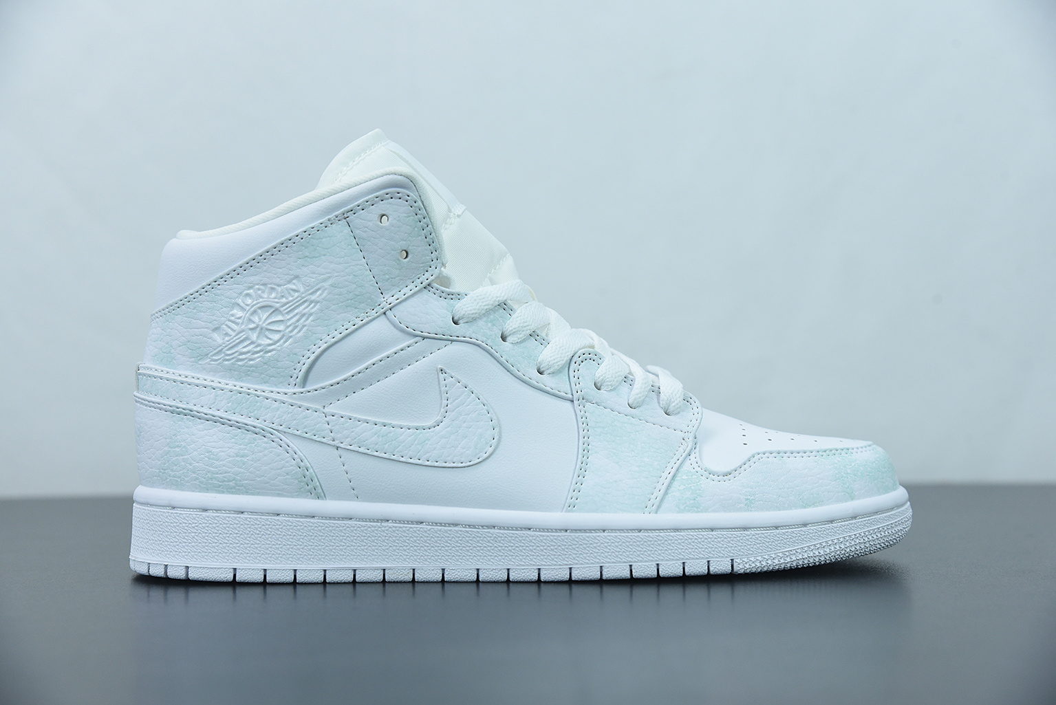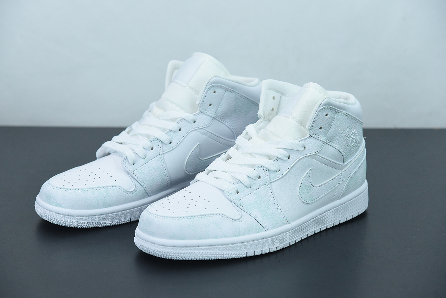 Fully dressed in an all-White color blocking. This mid-top Air Jordan 1 comes constructed in a mix of smooth and tumbled leather paired with matching tonal branding atop a solid White rubber sole.