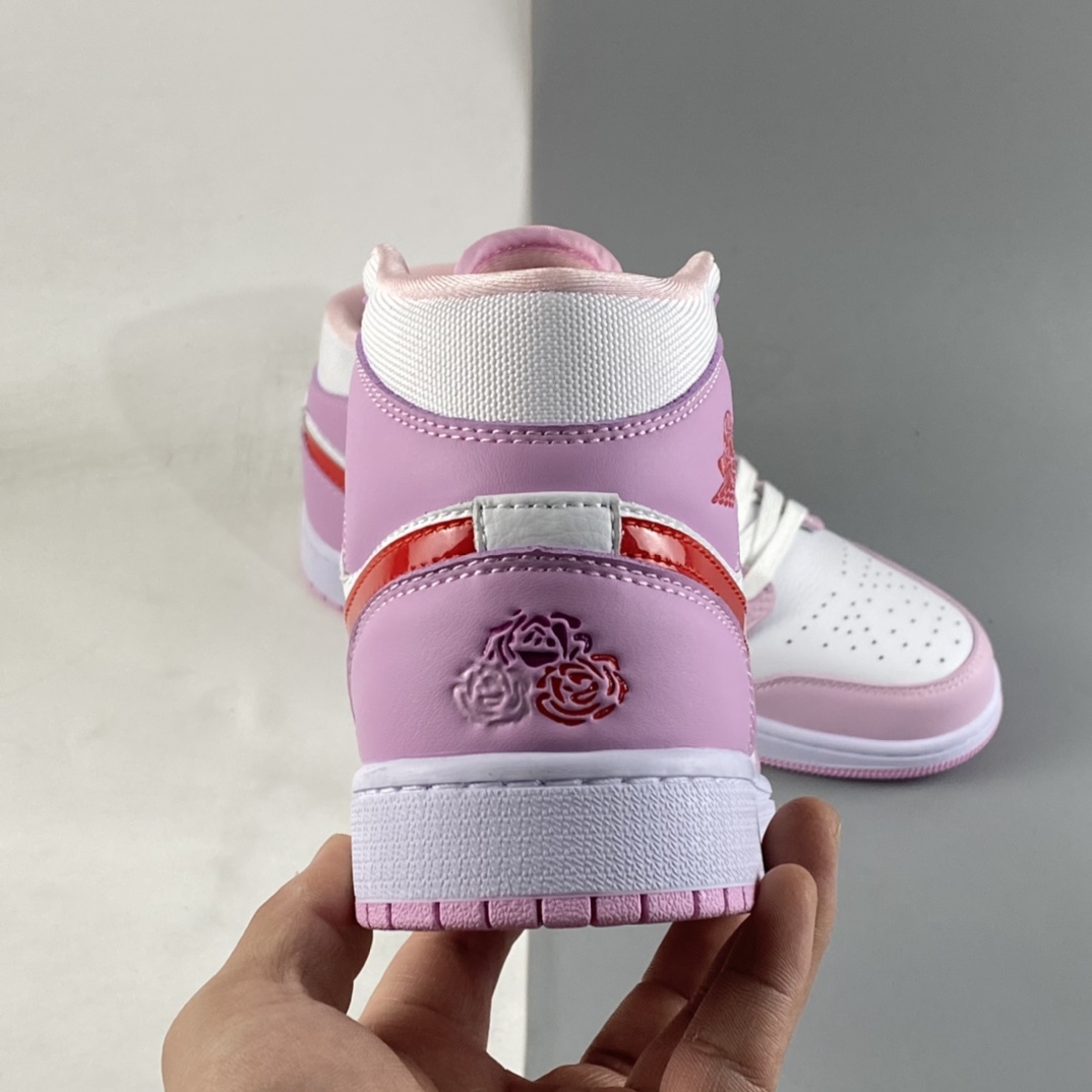 This offering of the mid-top Air Jordan 1 features a White tumbled leather base and mesh collars with Pink hues used on the overlays. Red Jumpman branding, Wings logo and Swooshes with a trio of roses on the heels atop a White midsole and Pink rubber outsole completes the design.