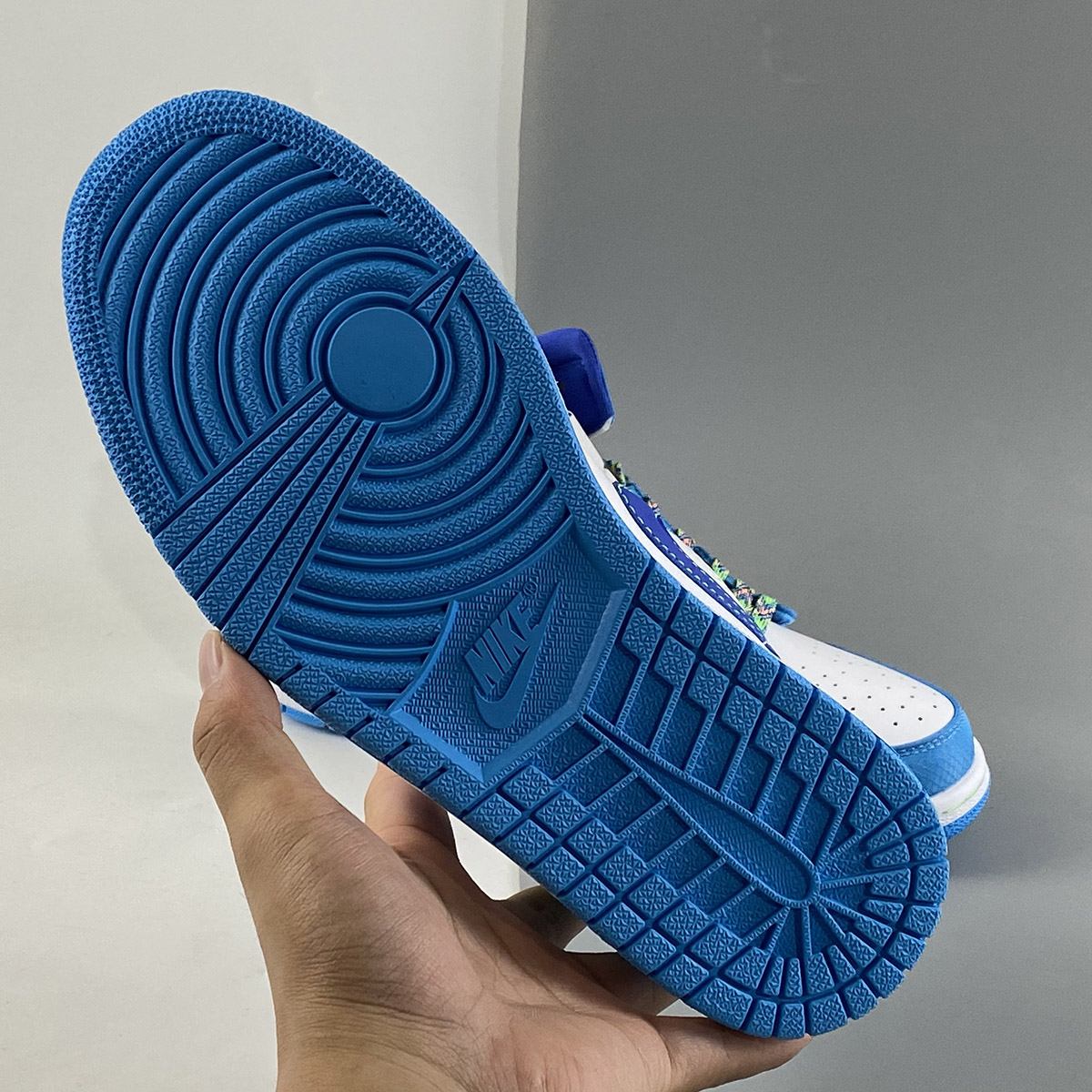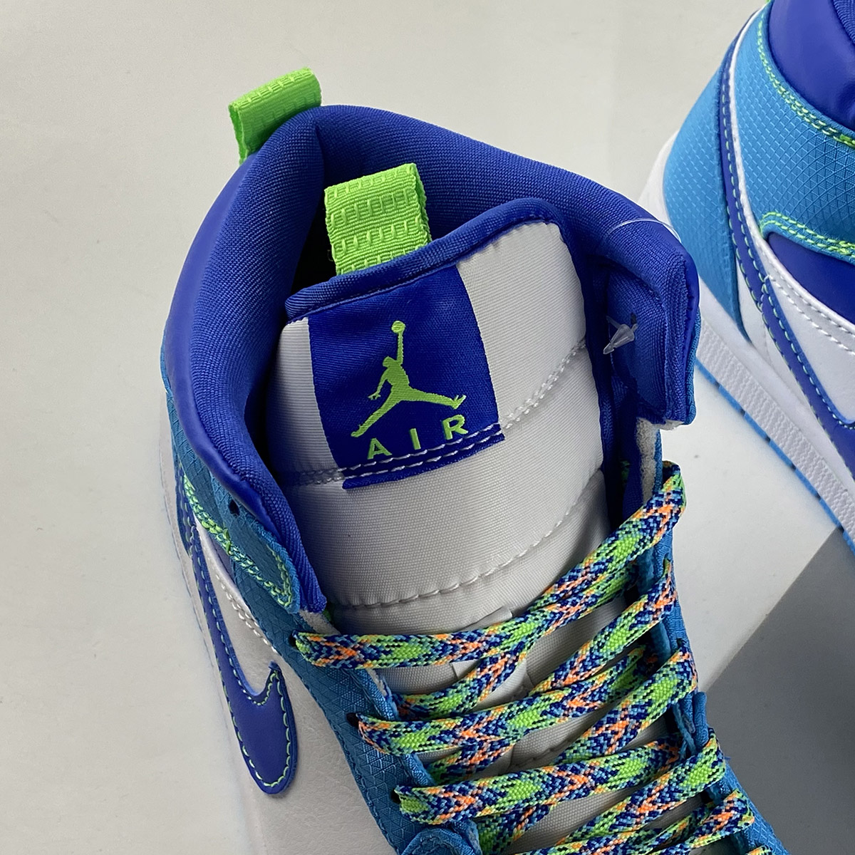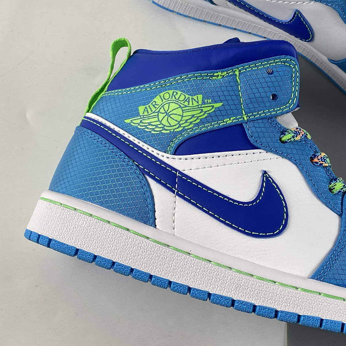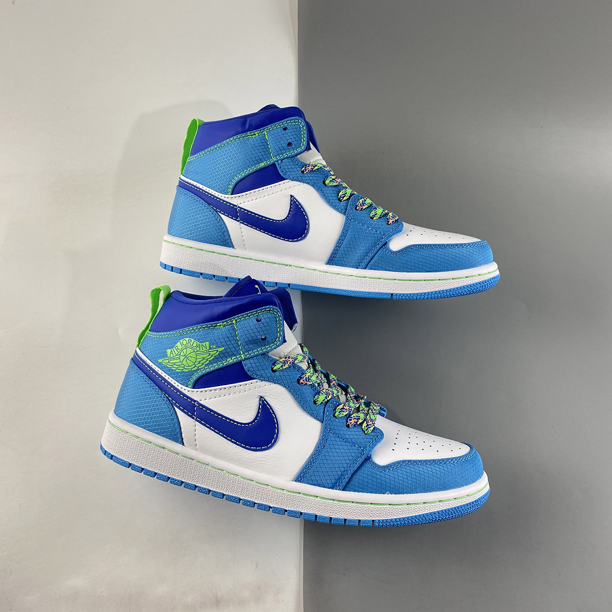 This interesting mid-top Air Jordan 1 comes highlighted with White leather on the base while a ripstop dipped in Light Blue runs across the overlays. Next, Royal Blue appears on the Swoosh logos, collar, liner, lace toggle, and tongue tags. Neon Green covers the Wings, tongue, and heel pull tabs, tongue branding, and stitching on the midsole. Other details include Multicolor speckled detailing on the laces, White across the midsole, and a Light Blue rubber outsole.