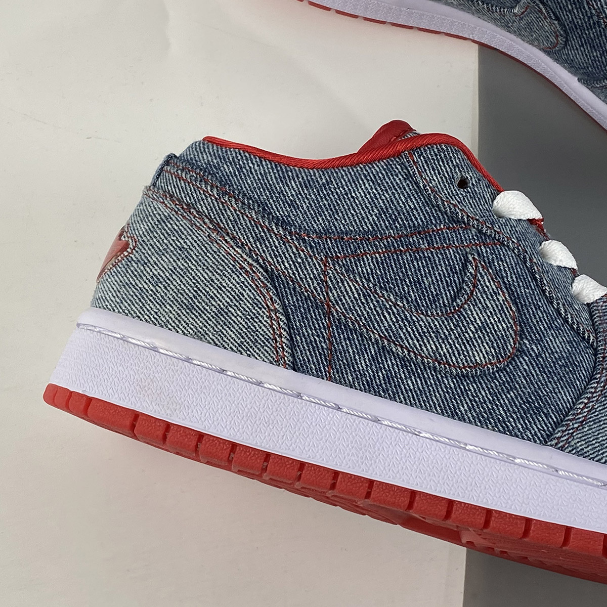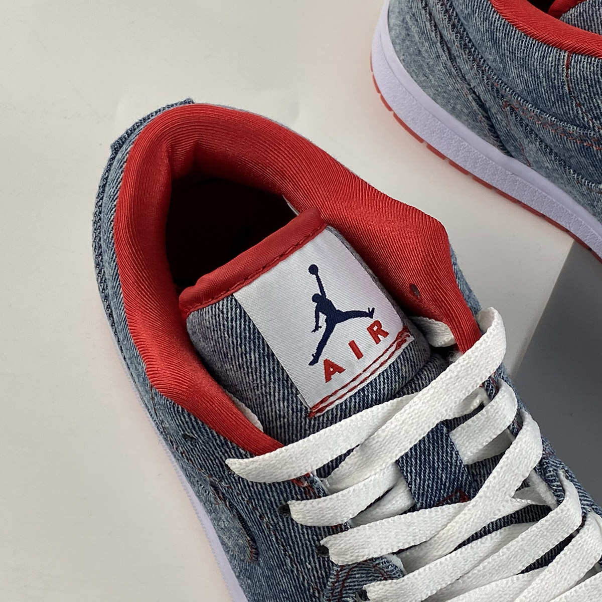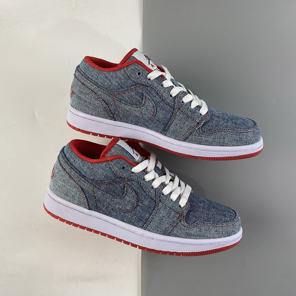 To follow up on the Denim uppers the Air Jordan 1 (I) Retro Womens Low Denim / White – Sport Red contains a white midsole, and sport Red accents throughout this sneaker.
