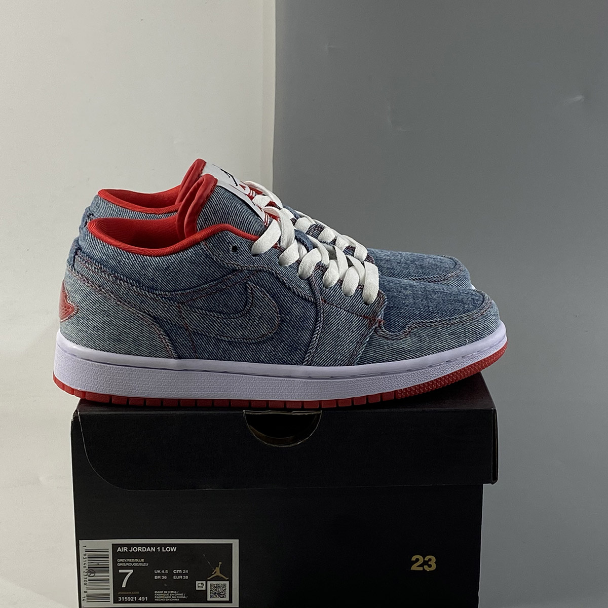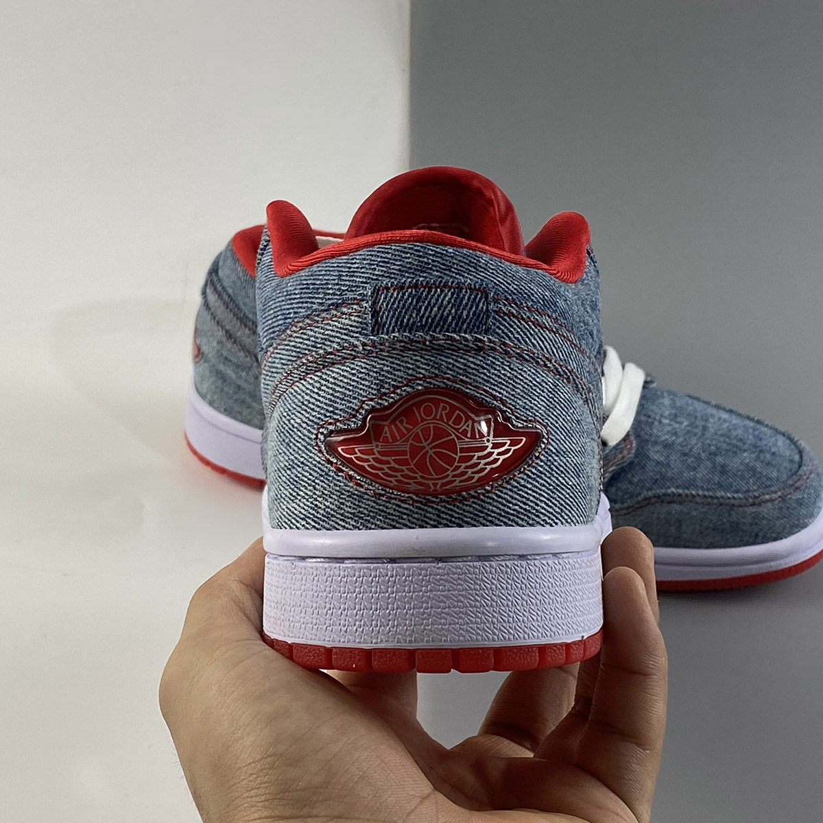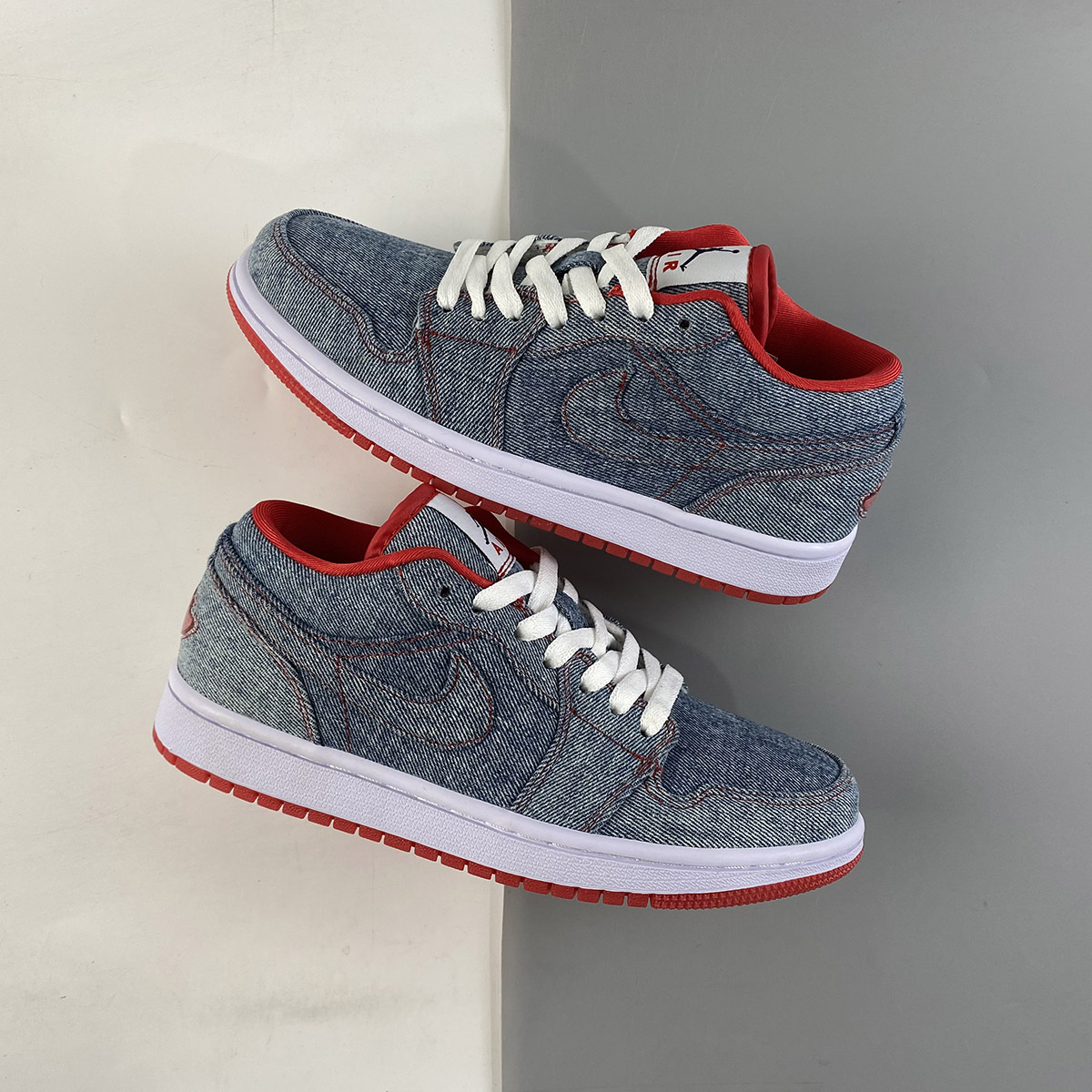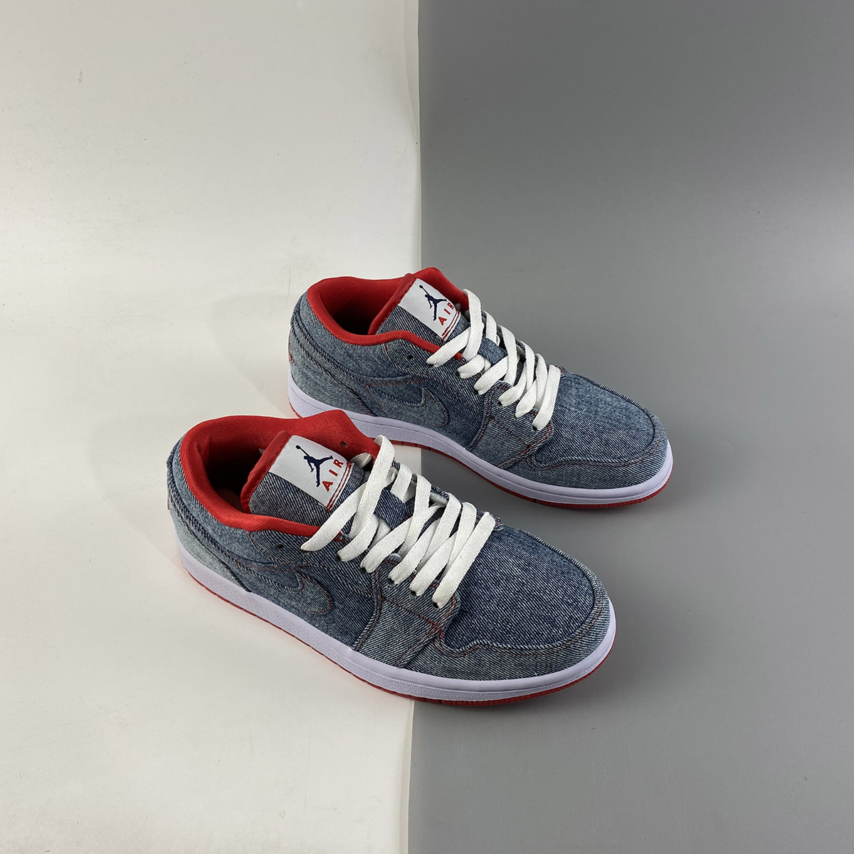 To follow up on the Denim uppers the Air Jordan 1 (I) Retro Womens Low Denim / White – Sport Red contains a white midsole, and sport Red accents throughout this sneaker.