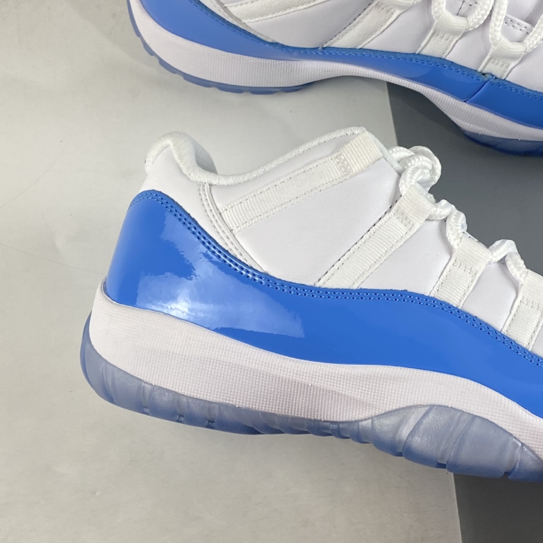 Dressed in a White and University Blue color scheme. This UNC-inspired Air Jordan 11 Low features a White leather upper with Columbia Blue patent leather around the base of the upper. Completing the shoe is a White midsole and translucent outsole.