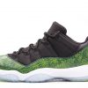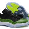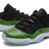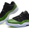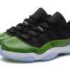 The Air Jordan 11 is the most iconic silhouette designed by Jordan Brand. Years ago they decided to release a low-top version and add Snakeskin overlays for a unique style. this version sports a classic Black mesh upper, accompanied by a Green snake skin overlay in place of the traditional patent leather. A white midsole is placed between the upper and translucent blue outsole. Volt accents can be seen along the outsole, as well as Jumpman logos on the rear ankle and tongue.
