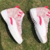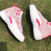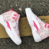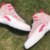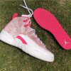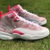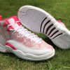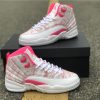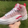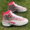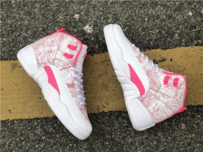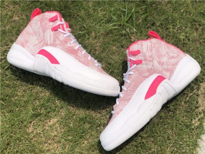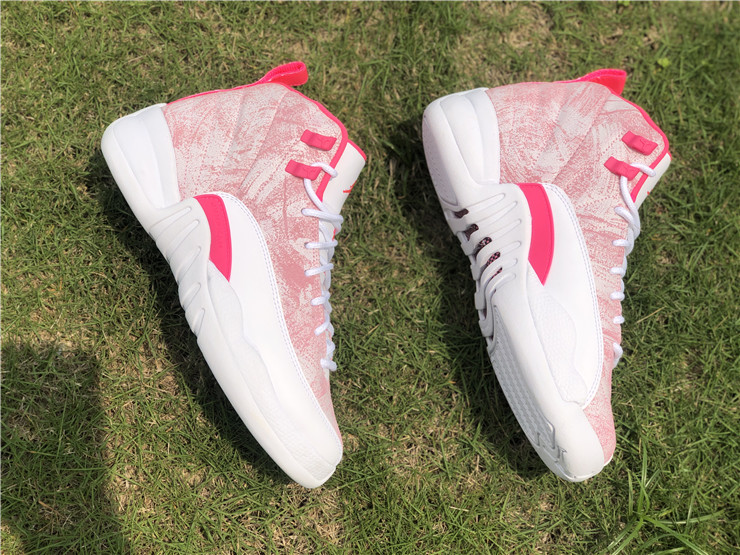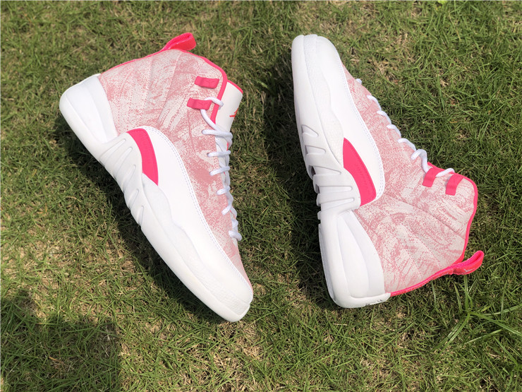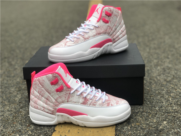 this Air Jordan 12 comes dressed in a White, Arctic Punch, and Hyper Pink color combination. This pair comes highlighted with a mixture of Light Pink and White that gives them a cracked paint look. It almost resembles suede, which has moved in different directions, giving them an artistic look. Next, we have White leather across the tongue and overlay across the sides. We also have a darker shade of Pink that lands on the liner, branding on the tongue, top eyelet, heel pull tab, and a White rubber outsole to finish the look.