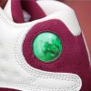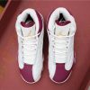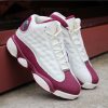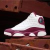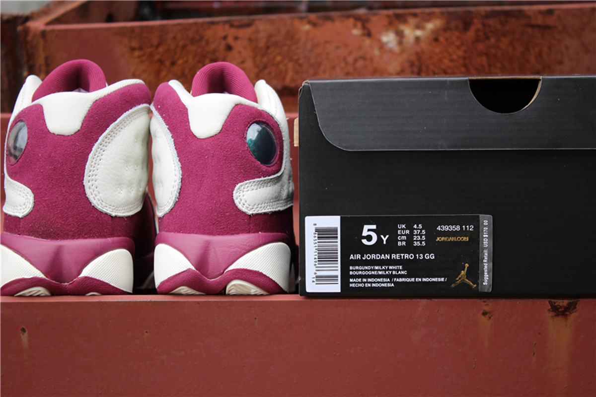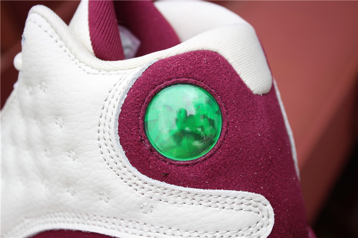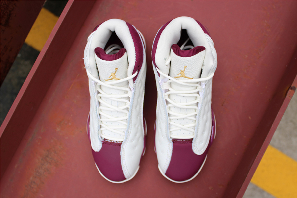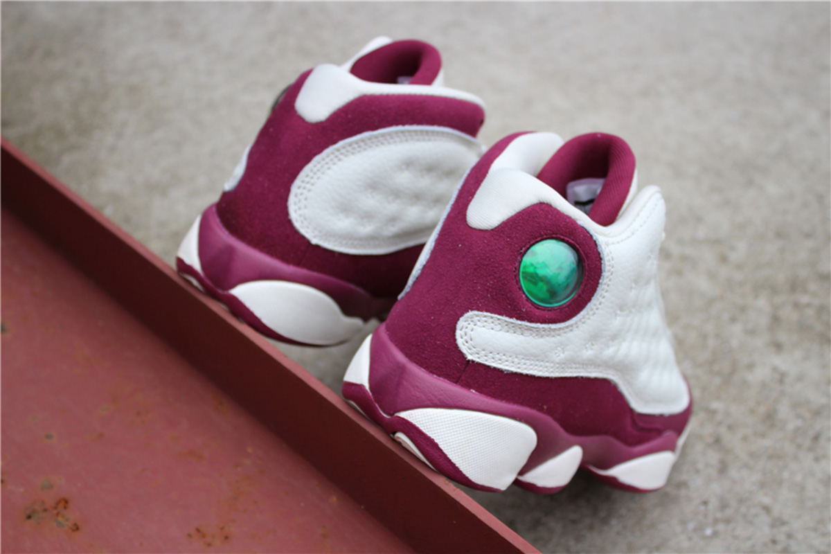 This Air Jordan 13 features a clean color combination while dressed in Sail and Bordeaux. Sail is used on the leather panels while also placed on the midsole pods, tongue and laces. Following is Bordeaux on the overlay which is constructed with suede. Finishing the look is a mixture of Sail and Bordeaux on the outsole.