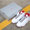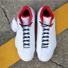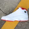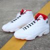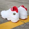 This Air Jordan 13 features a White, Metallic Silver and University Red color combination. Featuring a White leather upper, Red is spotted on the liner, inside of the tongue and outsole. Other details include Black laces while Metallic Silver accents the Jumpman branding.