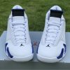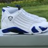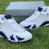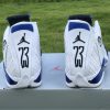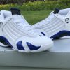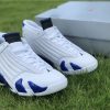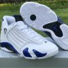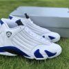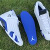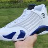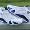 Dressed in a White, Hyper Royal, and Black color scheme. This Air Jordan 14 features a White leather upper paired with Royal Blue accents and Black detailing throughout. Signature carbon fiber shank plate and OG packaging completes the design.