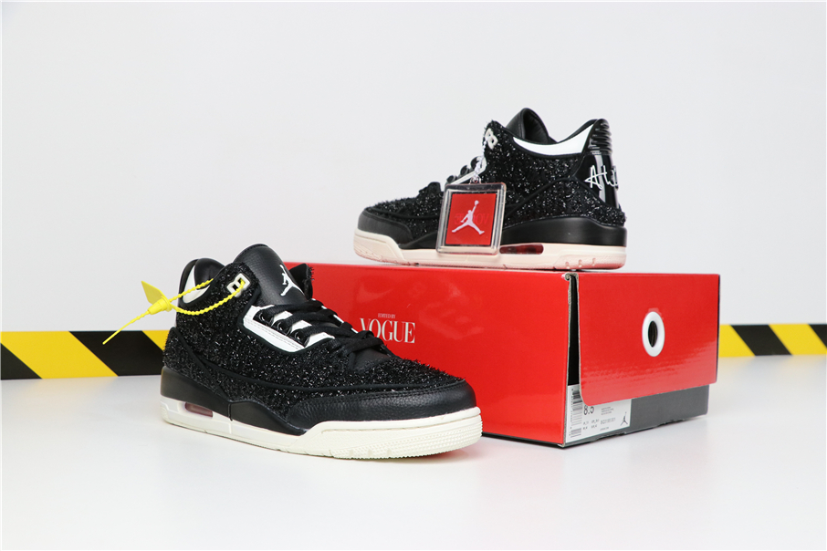 Inspired by Anna’s signature suits and sunglasses, this Air Jordan 3 features tweed as the primary upper material, and a back heel with the AWOK moniker. Both shoes come in a premium box with two suede dust bags and an “Edited by Vogue” keychain.