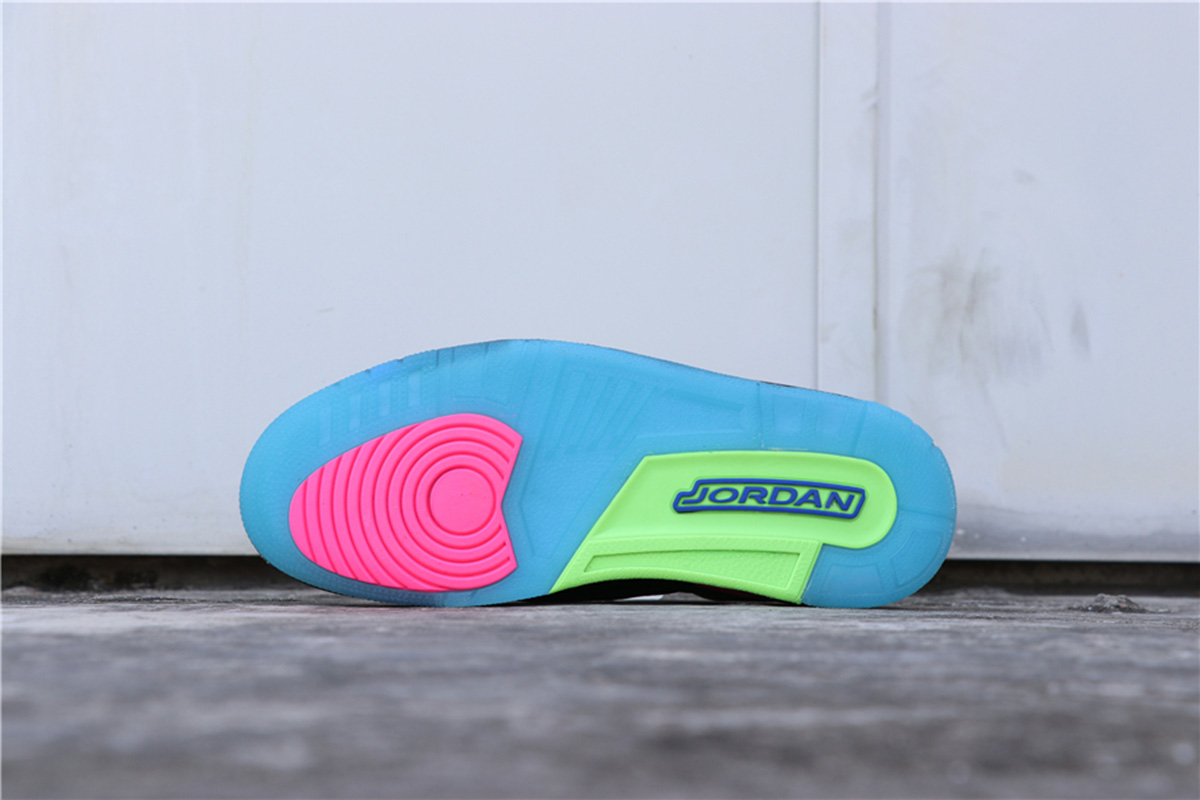 Dressed in a Black, Electric Green and Infrared 23 color scheme. It feature a Black premium tumbled leather upper with Black suede overlays. Pink, Blue and and Lime Green accents are used on the eyelets and midsole atop a Blue translucent outsole.