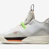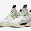 Dressed in a Vast Grey, Cone, Sail, and White color scheme. This Air Jordan XXXIII sports a clean aesthetic featuring a White and Grey upper highlighted with bright Green, Orange, and Yellow accents. An iridescent branded tongue and heel completed with a Sail rubber sole completes the design.