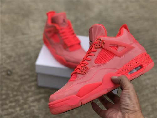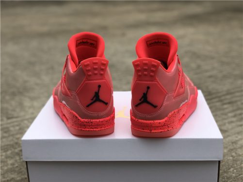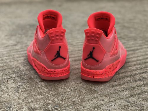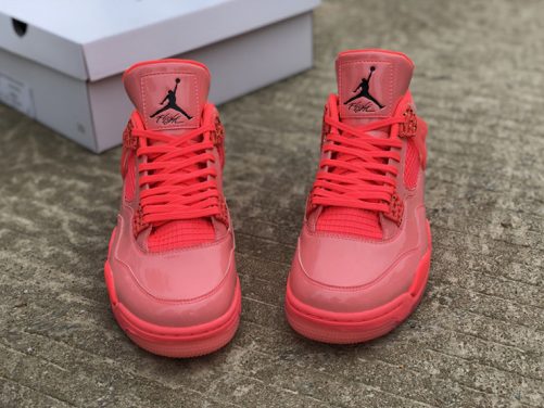 Dressed in a Hot Punch, Black, and Volt color scheme. This Air Jordan 4 features a Pink patent leather upper contrasting with Black detailing throughout. Volt hints atop a speckled midsole and translucent outsole completes the design.