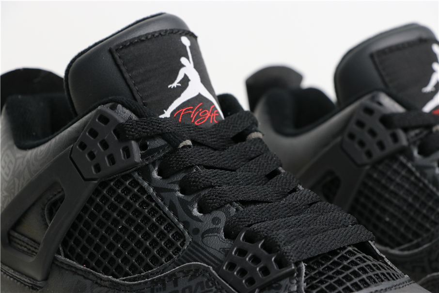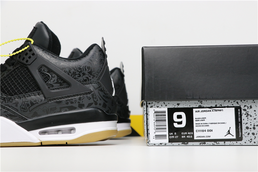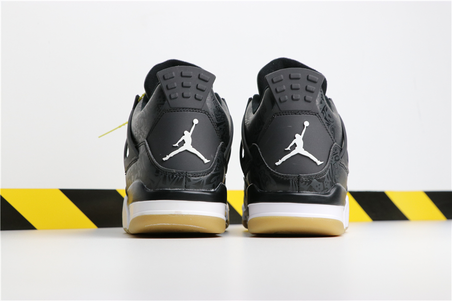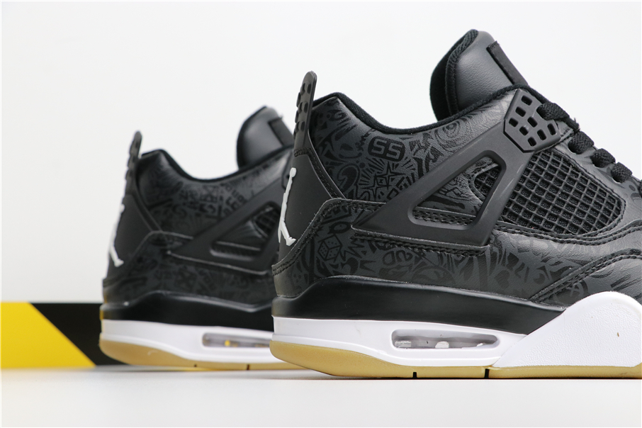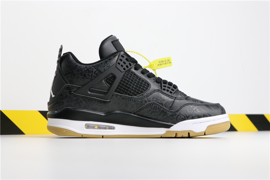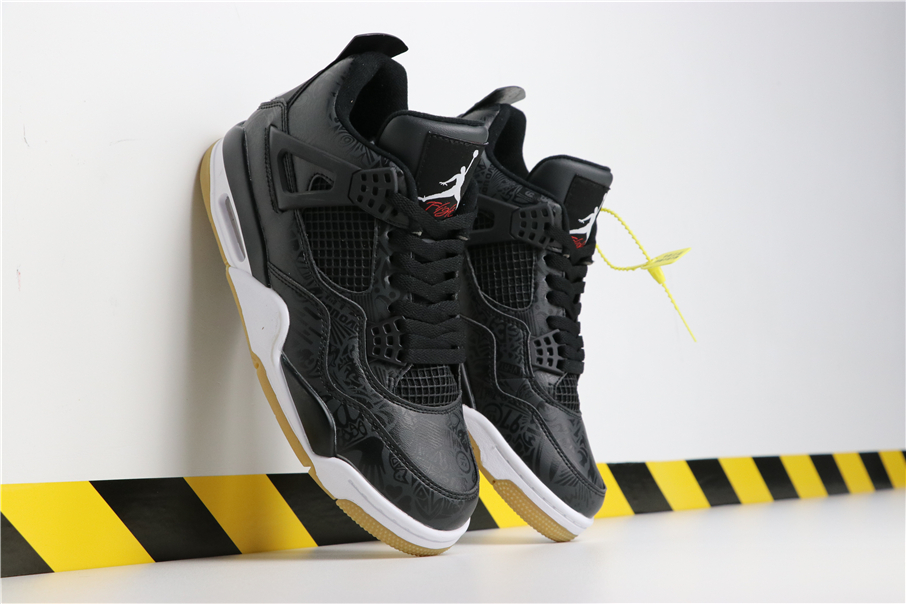 Dressed in a Black, White, and Gum Light Brown color scheme. This Air Jordan 4 features a Black leather upper with 3M laser graphics. Red hits are seen on the “Flight” of the tongue and Jumpman logo on the outsole, while having White Jumpman logos on the tongue label and heel. A White midsole and Gum rubber outsole completes the design.