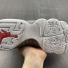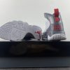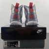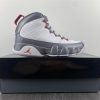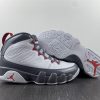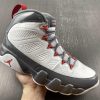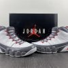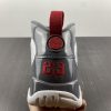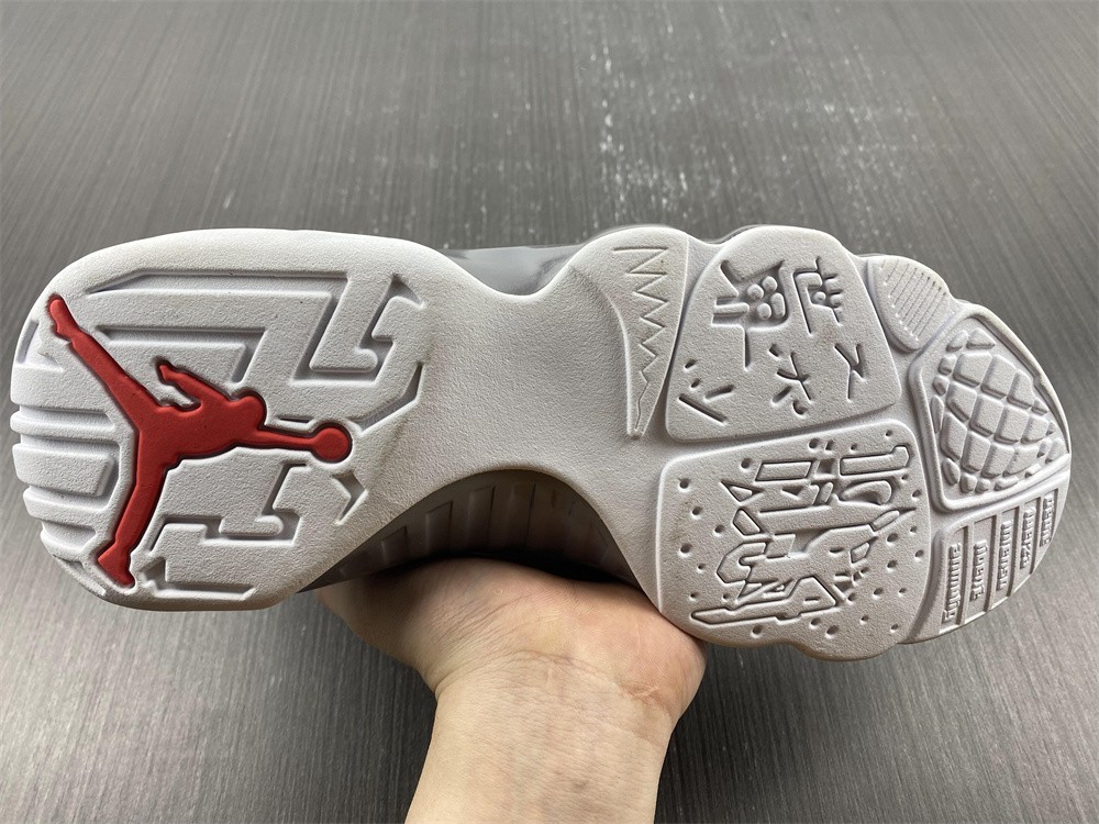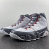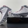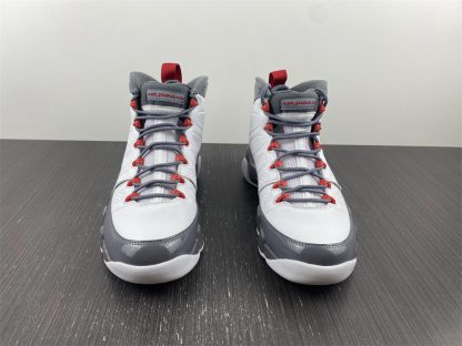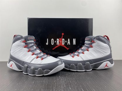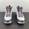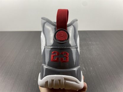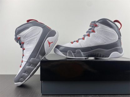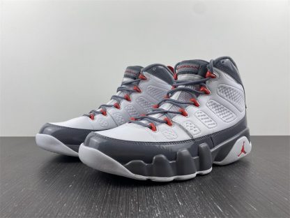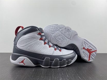 The sneaker uses a white leather base with Cool Grey overlays. The signature Fire Red hue appears on the lace loops, Jumpman, and 23 branding on the heel and tongue tag. The midsole is seen in grey, with a white outsole finishing off the sneaker.