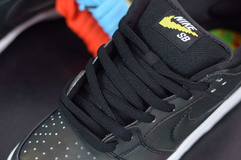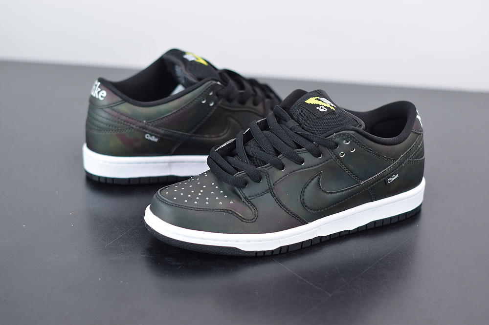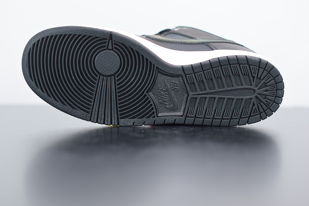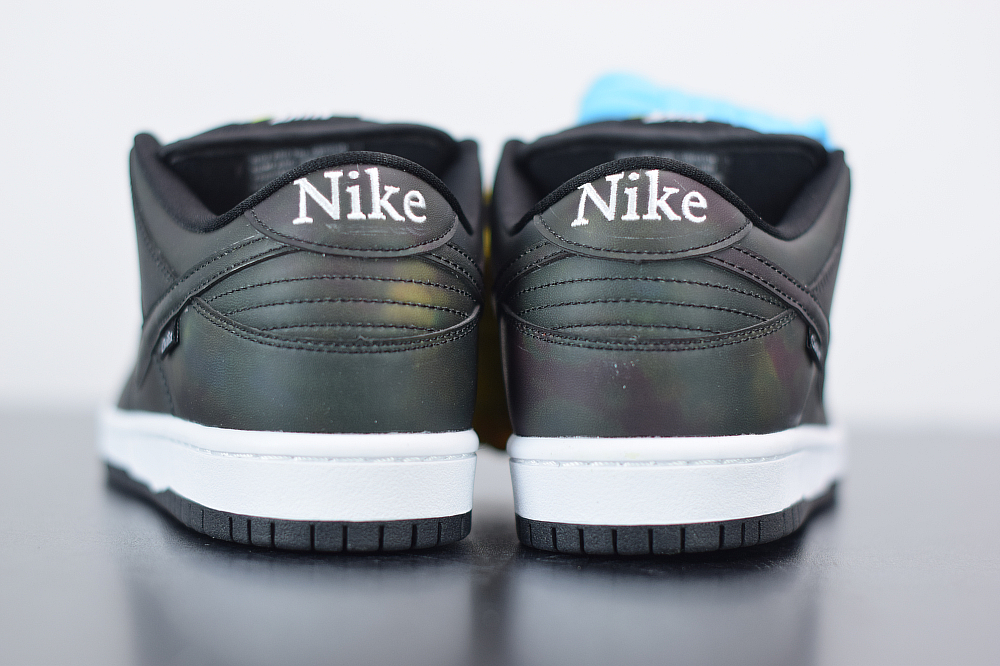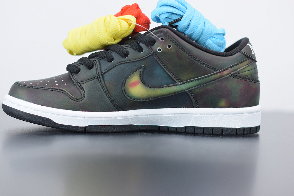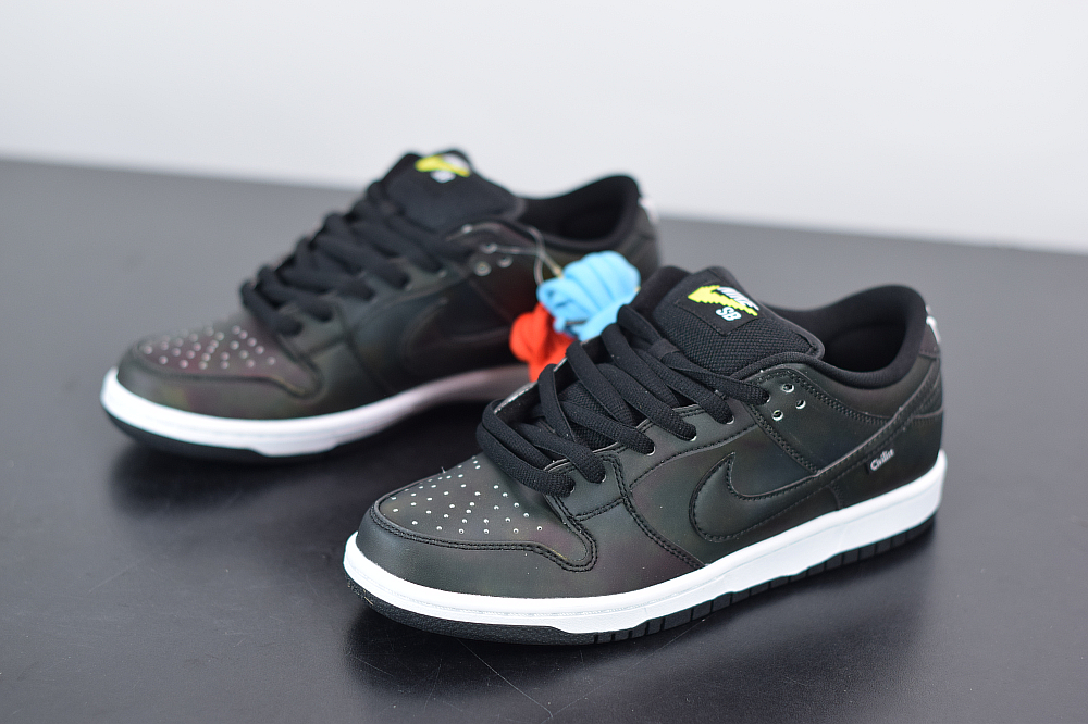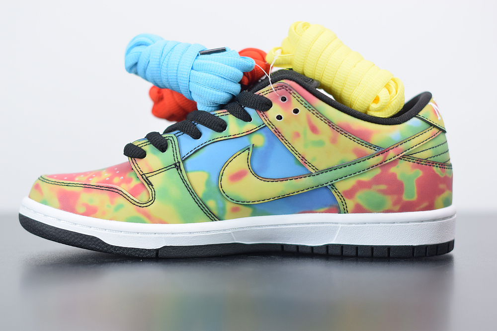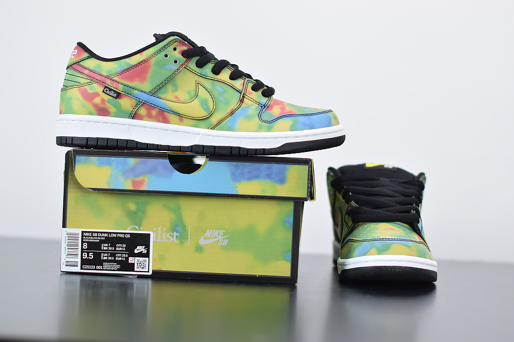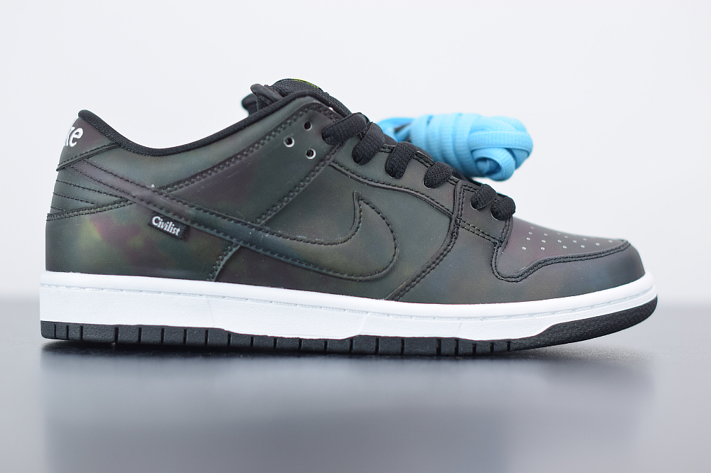 The Civilist SB Dunk Low features a Black heat-activated upper with hidden thermal imaging in multicolored tones when exposed to heat, and turns back Black when exposed to cold. Civilist label on the lateral atop a White midsole and Black rubber outsole with graphic insoles completes the design.