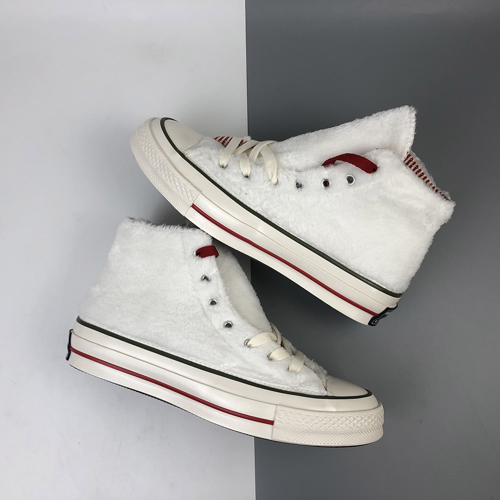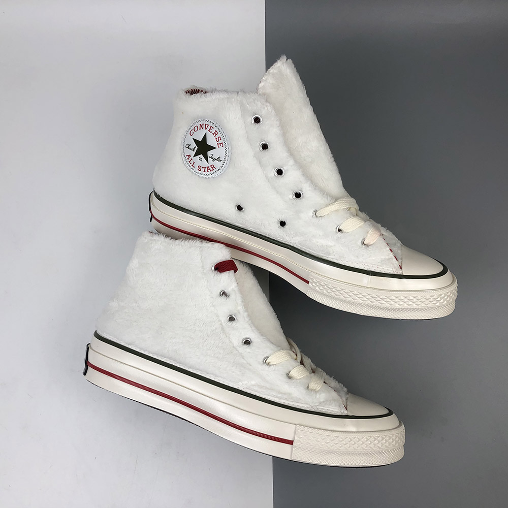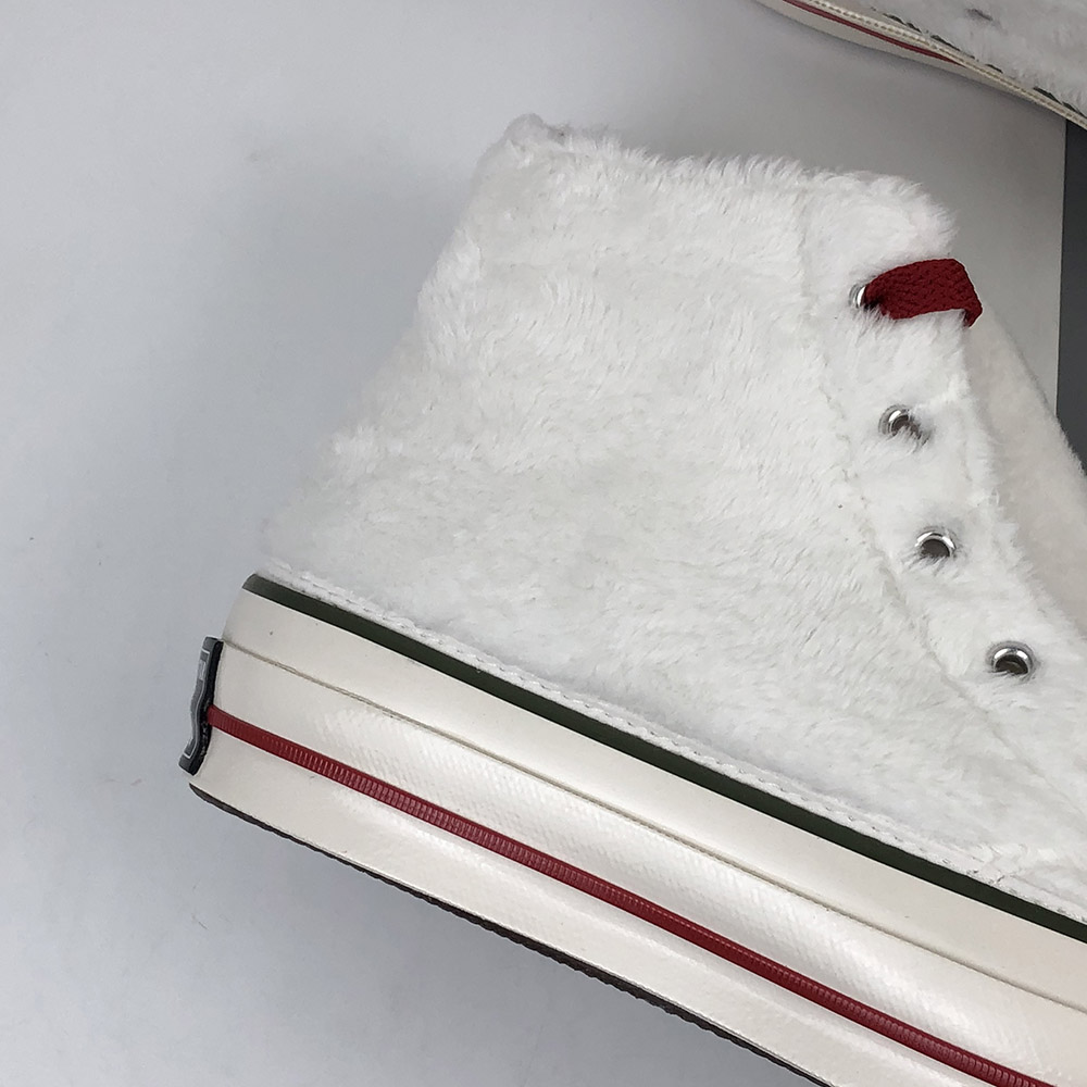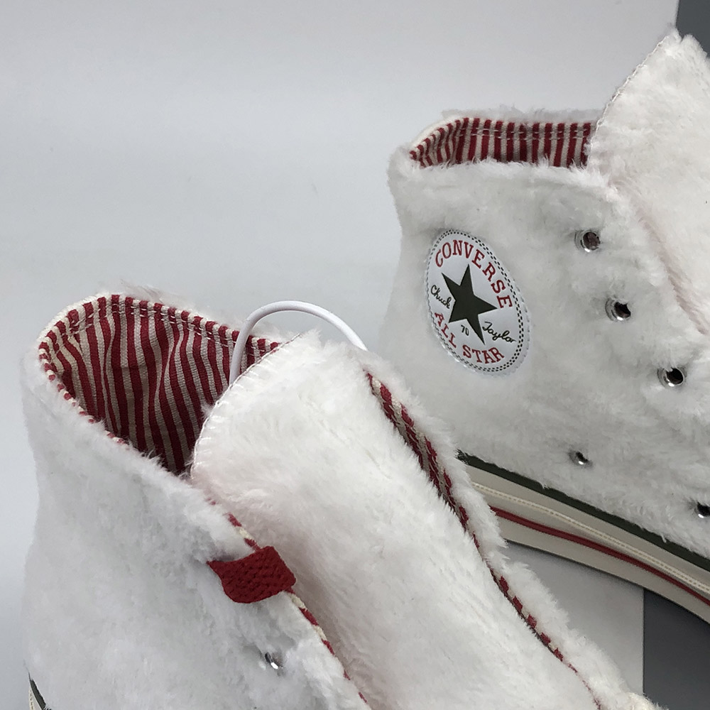 INSULATED ICON. Just in time for winter’s dropping temperatures, warm and fuzzy sherpa takes over the best ever Chuck 70. Designed to keep you cozy in style, we’ve topped off the design with red and green pinstripes to celebrate the season. A candy cane-inspired lining and bright red laces tie the look together in party-ready style.