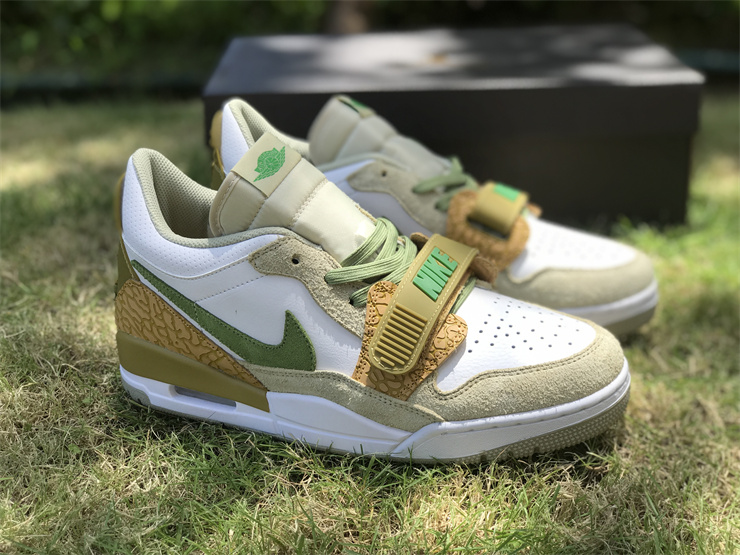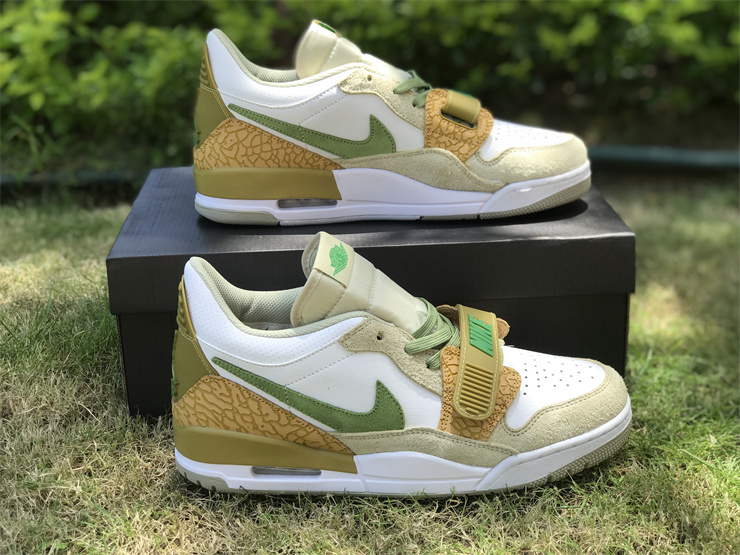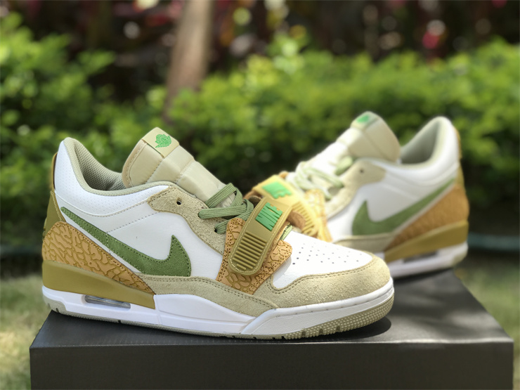 The Jordan Legacy 312 Low is showcased in a stylish earthy combination that mixes sand and olive tones. Overall, the Don C-designed sneaker sports a white leather upper that is contrasted with tan suede overlays and golden elephant print detailing notably on the lower eyelets and heel area. Finally, olive Swooshes and laces, followed by a white and tan AJ 3-inspired tooling rounds out the hybrid design.