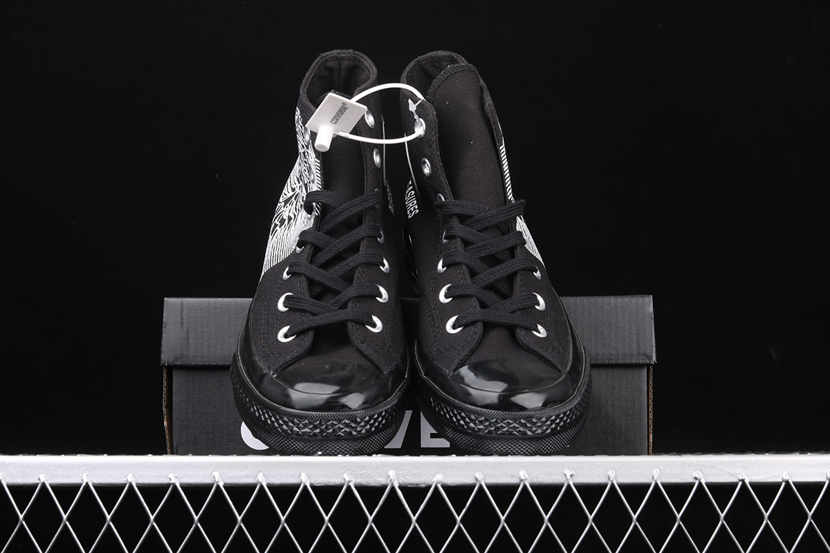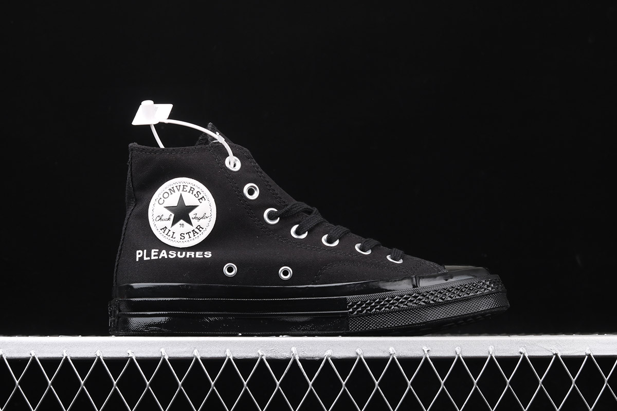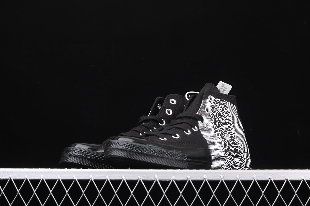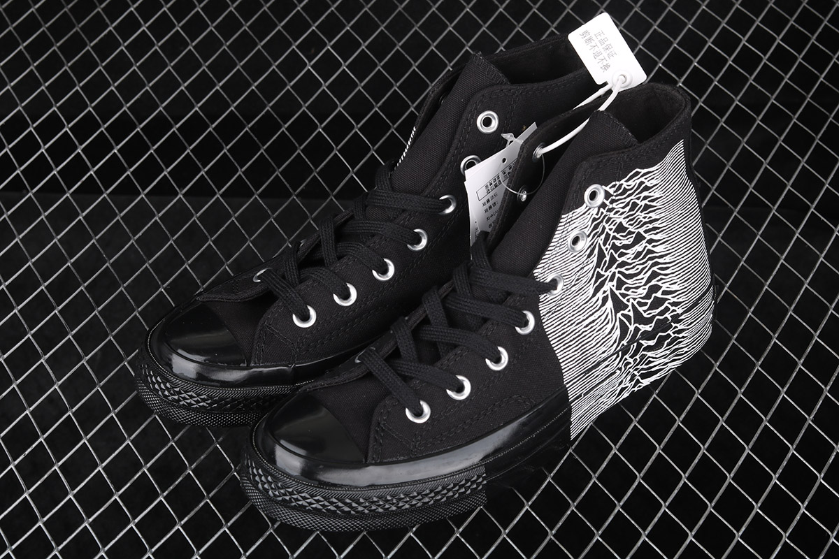 the upper of the shoe is constructed of black canvas to mimic the background of the iconic album with “PLEASURES” branding accompanying the All-Star motif on the medial side. Boldly marking the simple upper is a Factory Records designer and iconic graphic artist Peter Saville‘s cover art for Unknown Pleasures to honor the seminal elements of the 1979 album that has influenced generation after generation of creatives and continues to dynamically prove its instructive legacy. Additional decorative details come in the form of tonal stitching, metal eyelets and matching flat laces. Rounding up the design of the collaboration is an Ortholite insole, black toe cap and heel badge marked black sole unit.