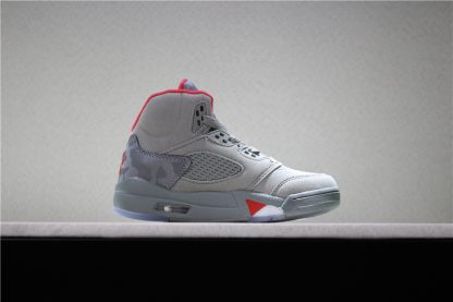 Using details inspired by a classic World War II fighter jet. This Air Jordan 5 features a combination of Dark Stucco Green and University Red highlighted with 3M reflective camouflage print.