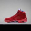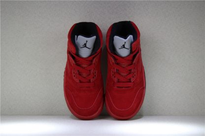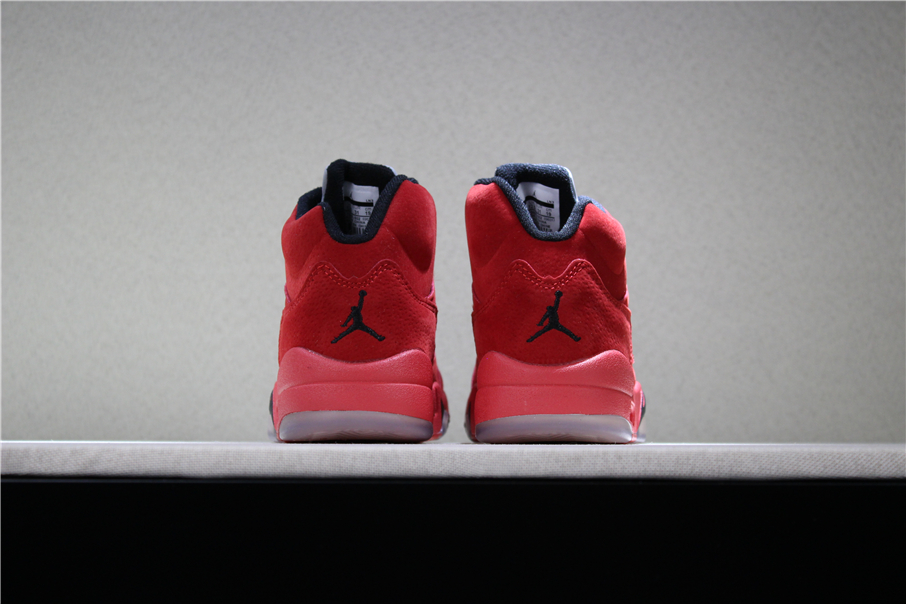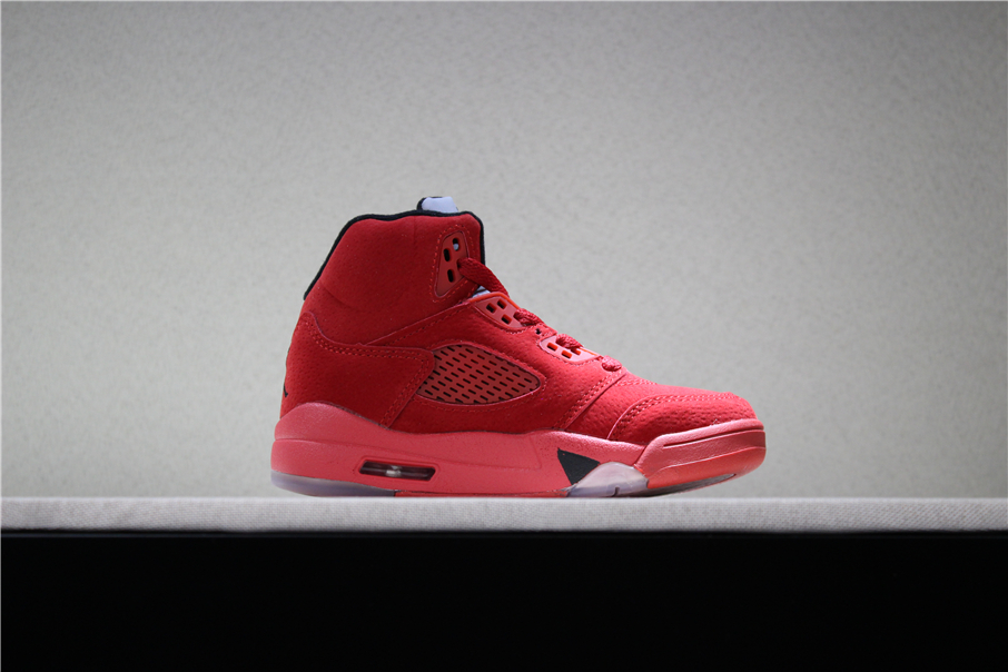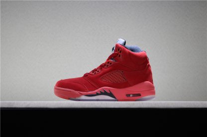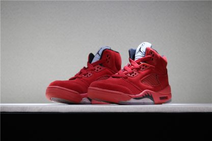 Dressed in a mix of University Red and Black color scheme. This Air Jordan 5 features an all-Red suede upper with matching mesh and midsole, along with 3M reflective on the tongue. Black shark teeth and lining, while sitting atop an icy outsole completes the design.