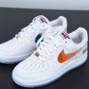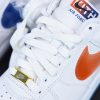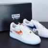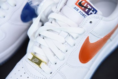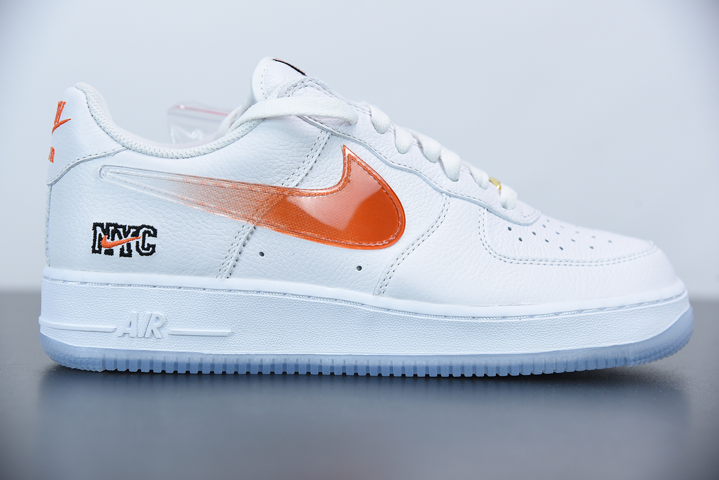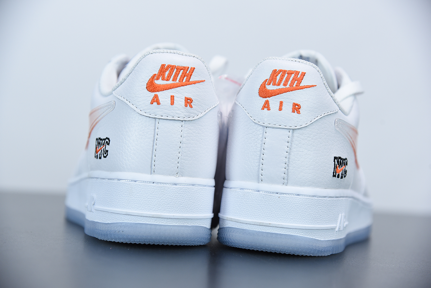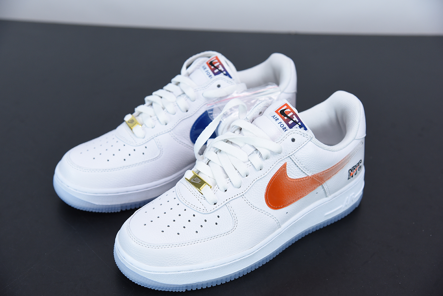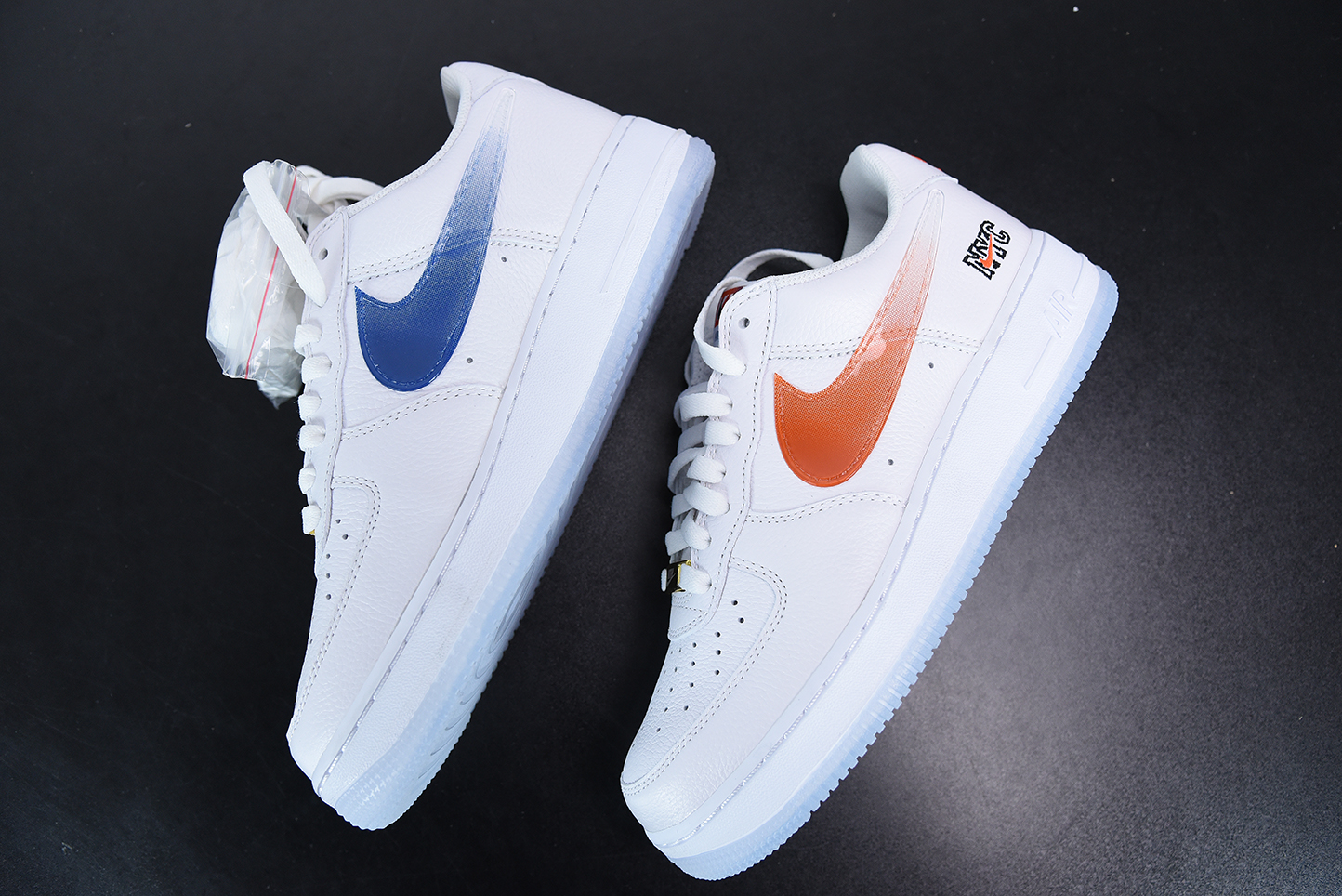 One pair comes dressed in “Black/Team Orange-Black-Rush Blue” and the other sports a “White/Rush Blue-White-Brilliant Orange” makeup. Both feature Black and White leather uppers with mismatched semi-translucent TPU Swoosh logos, Kith branding on the tongue tags, rear “NYC” embroidery, Metallic Gold dubraes atop a White midsole and icy translucent outsole.