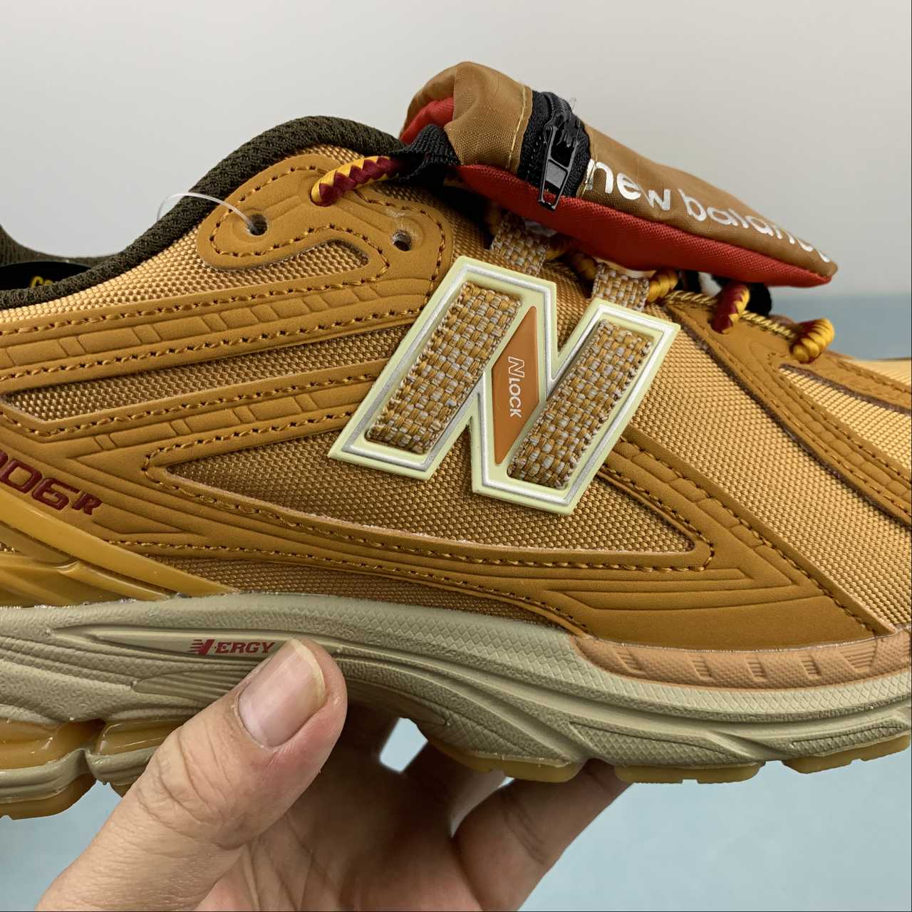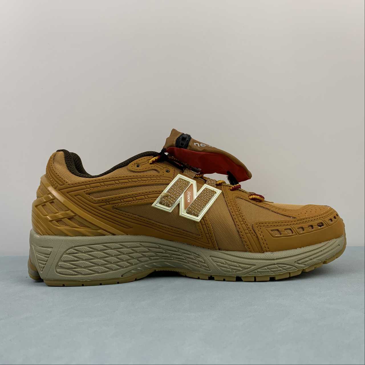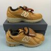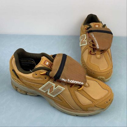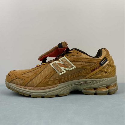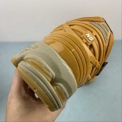 This offering features a caramel-coated upper constructed with a tightly knit mesh base layer and weatherized nubuck overlays. The sneaker includes a lace shroud outlined with red detailing, along with New Balance and Cordura branding throughout the base. Other details include the signature “N” logos resting atop a matching sole unit.