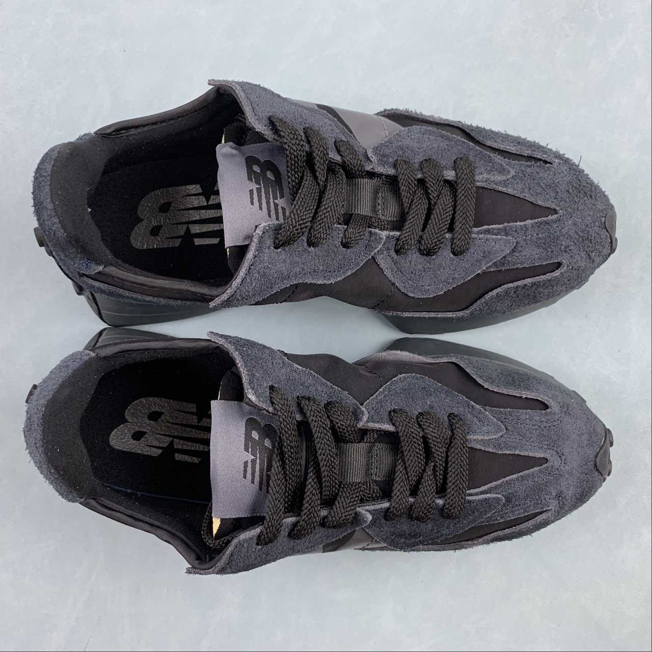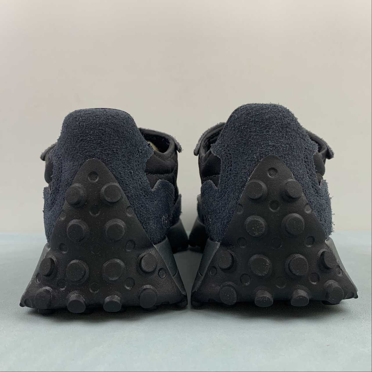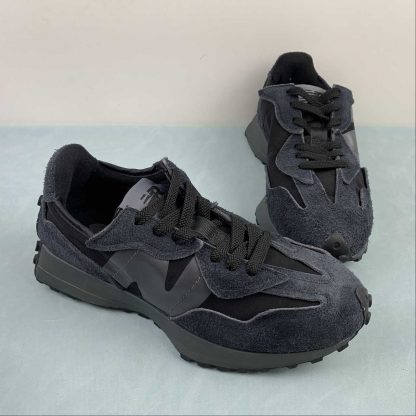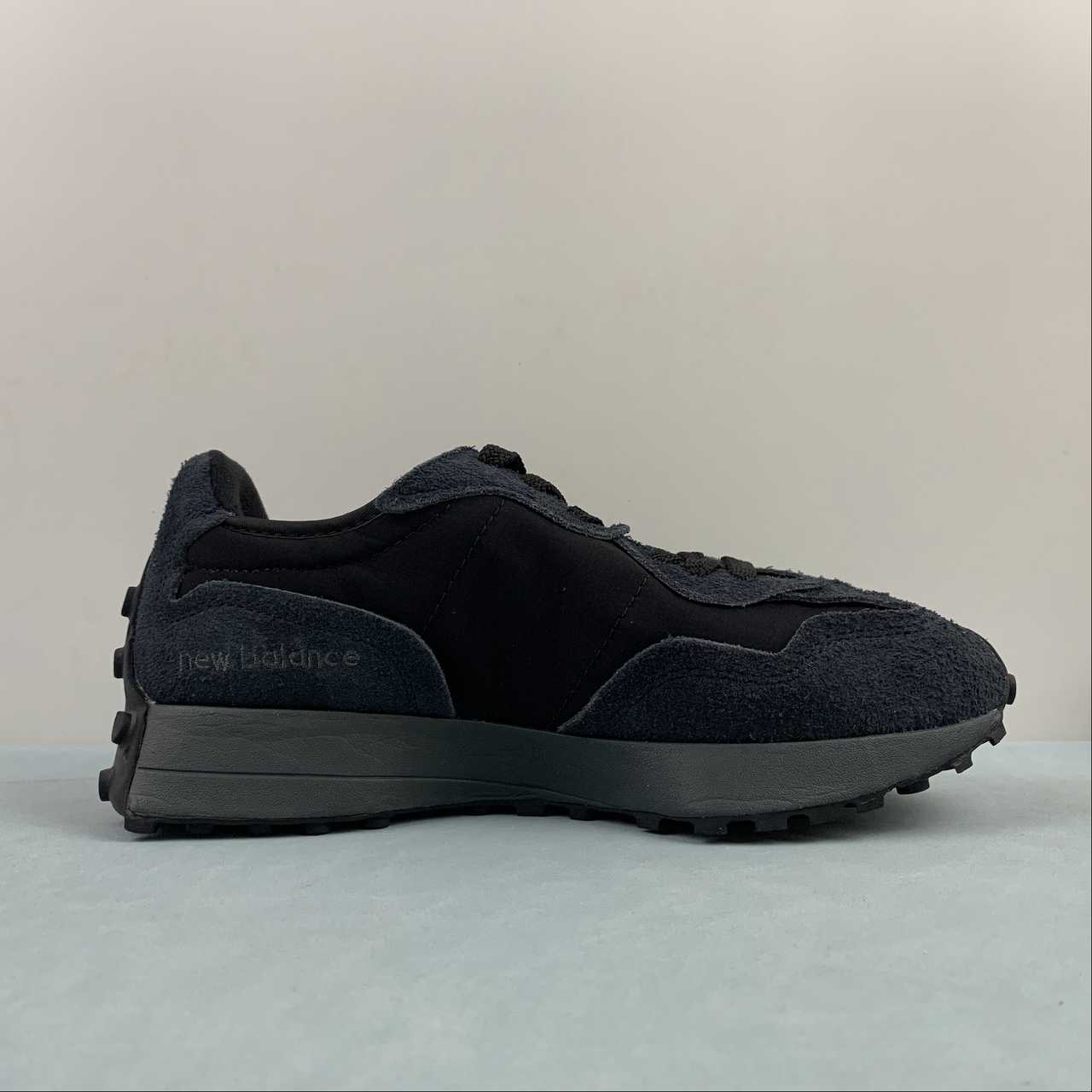 The New Balance 327 Phantom features a rugged twist to the classic, sneakerhead-favourite silhouette. This iteration starts with a solid, black textile base that’s designed with a stylishly dishevelled pale grey “N” branding with visible white stitches at the side panels. The semi-shaggy black suede overlays and exposed tongue foam further its scruffy vibe. This New Balance 327 finishes with classic details such as the comfortable flared midsole, a grippy lugged outsole that provides extra traction and the rubber heel wrap — all of which are in black to maintain the shoe’s understated style.